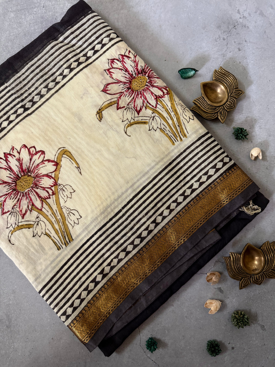 Adbhuta | Black and White Block Printed Chanderi Saree