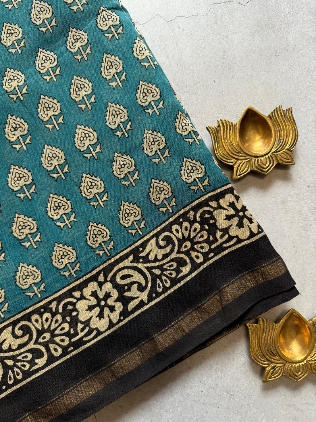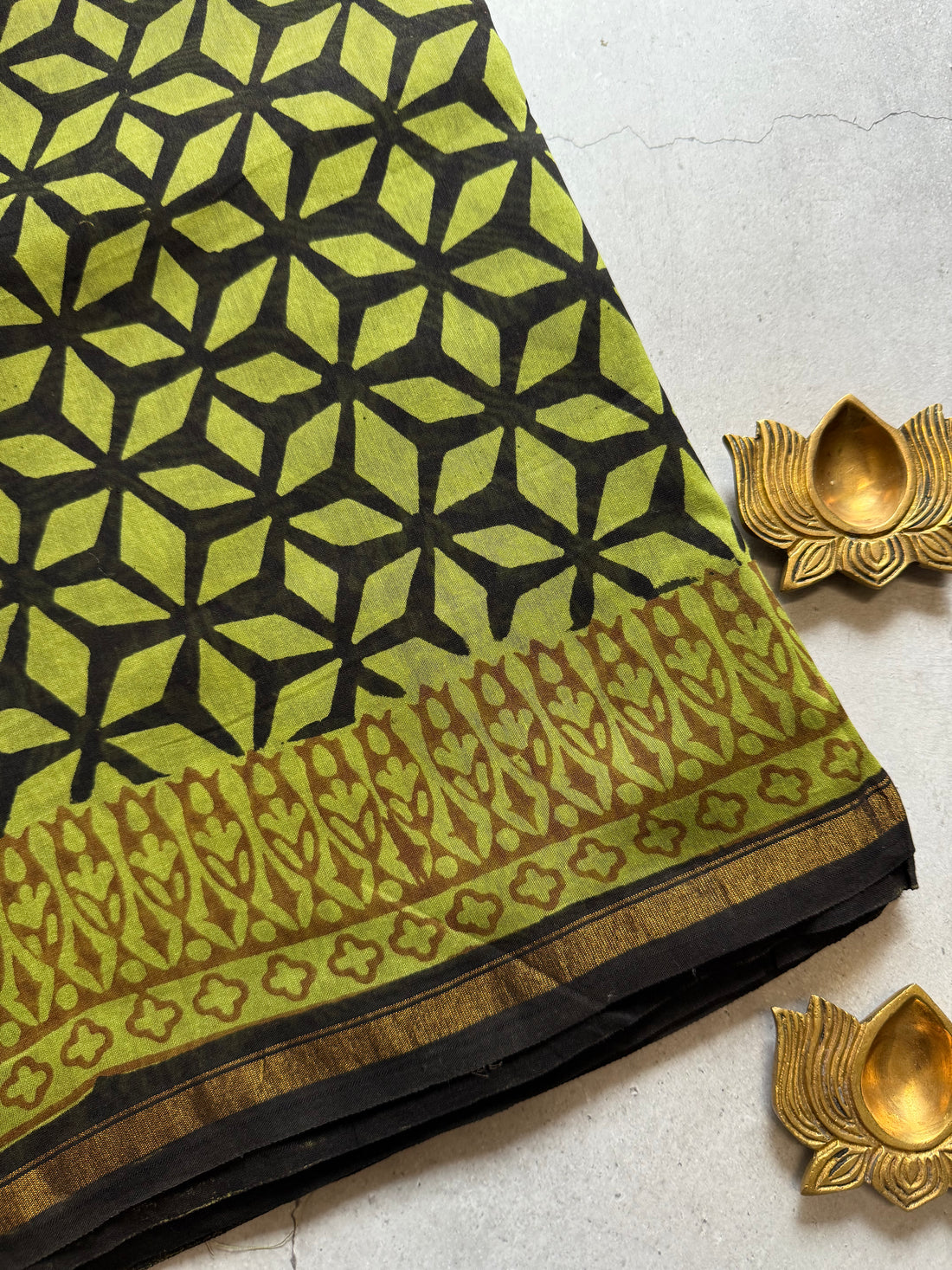 Tamrapushpa | Green and Black Block Printed Chanderi Saree