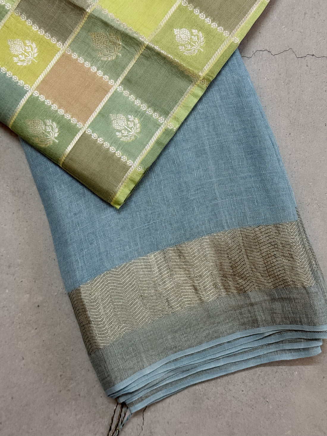 Vaarnika | Green Beige and Silver Pure Linen Silk Saree
