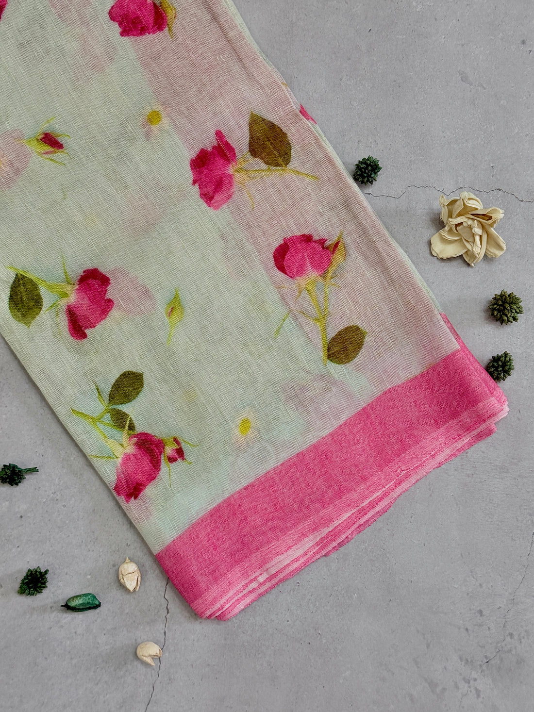 Mridula | Beige and Pink Floral Printed Linen Silk Saree