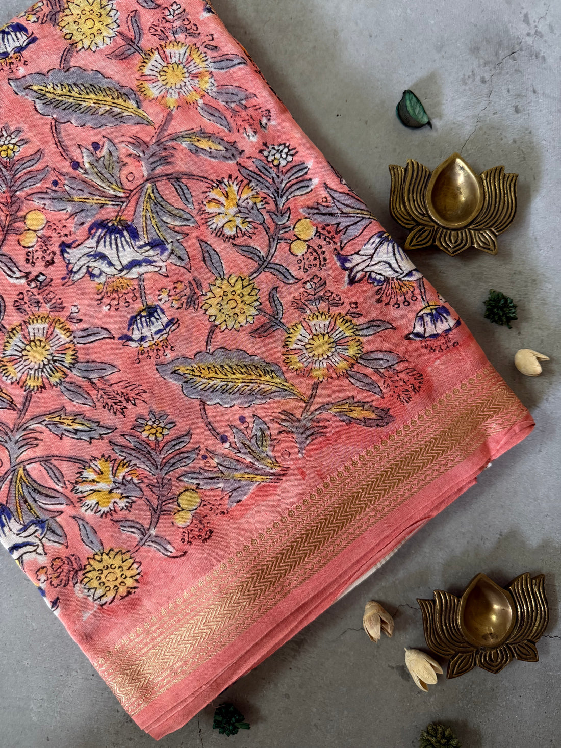 Kashiyapa| Coral Pink Block Printed Maheshwari Saree