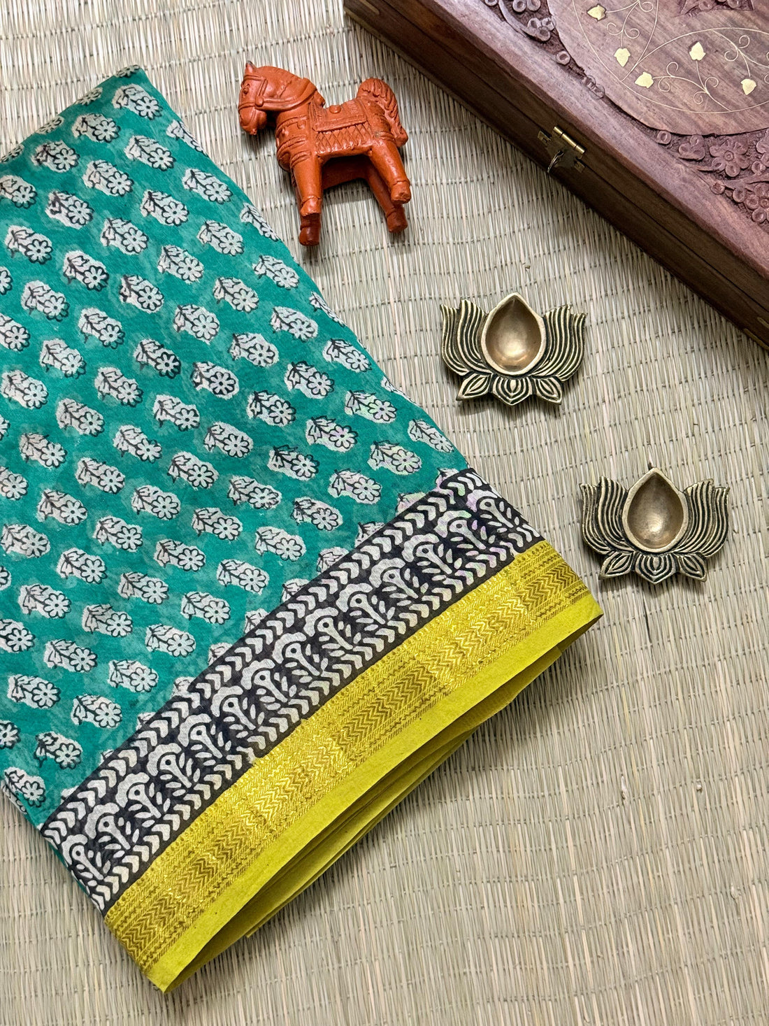 Margazhi | Green and Yellow Block Printed Maheshwari Saree