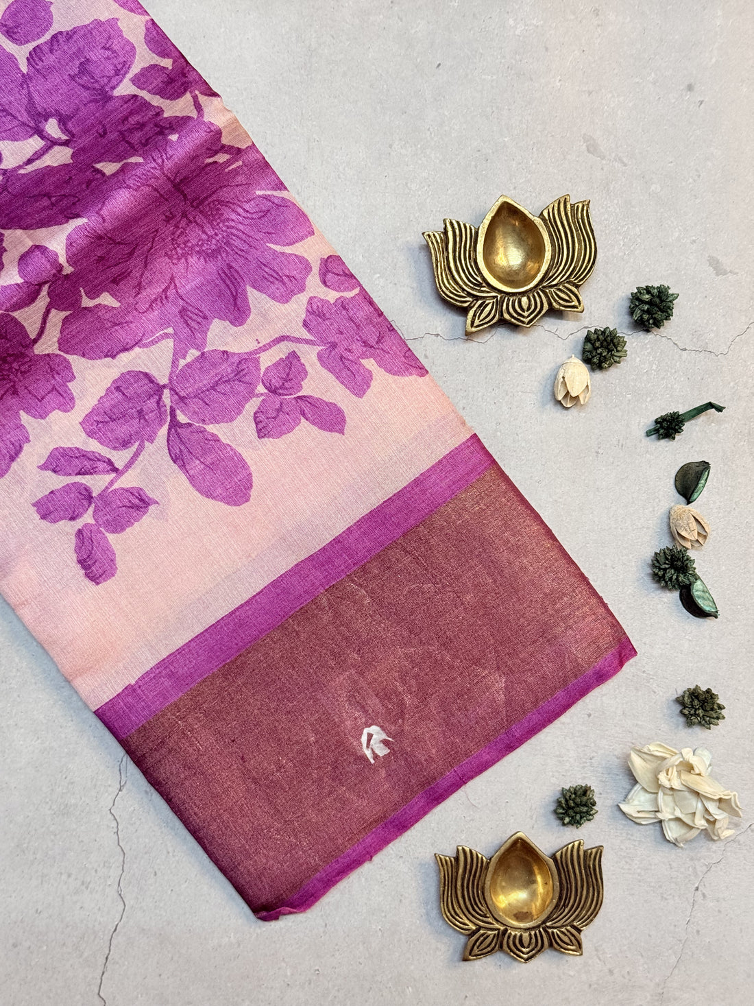 Yashna | Pink Floral Printed Tussar Silk Saree