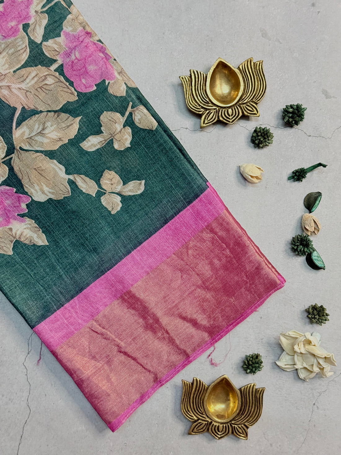 Yuktha | Green and Pink Floral Printed Tussar Silk Saree