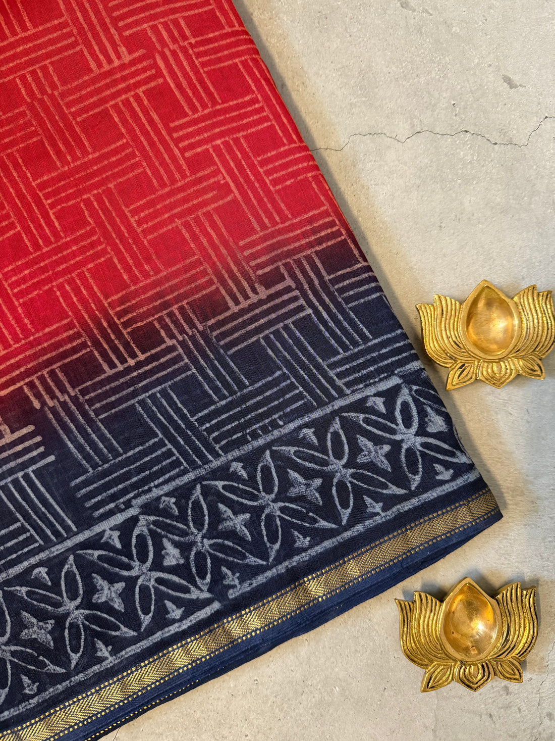 Navrang | Red and Blue Block Printed Chanderi Saree