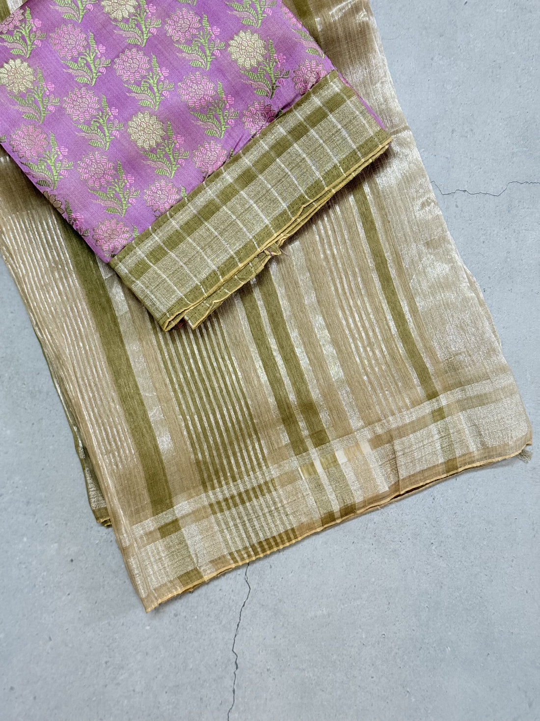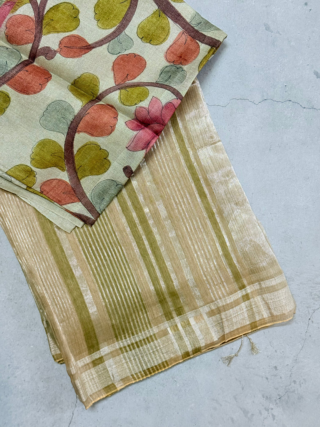 Venuvarnika | Green Beige and Silver Pure Tissue Linen Silk Saree