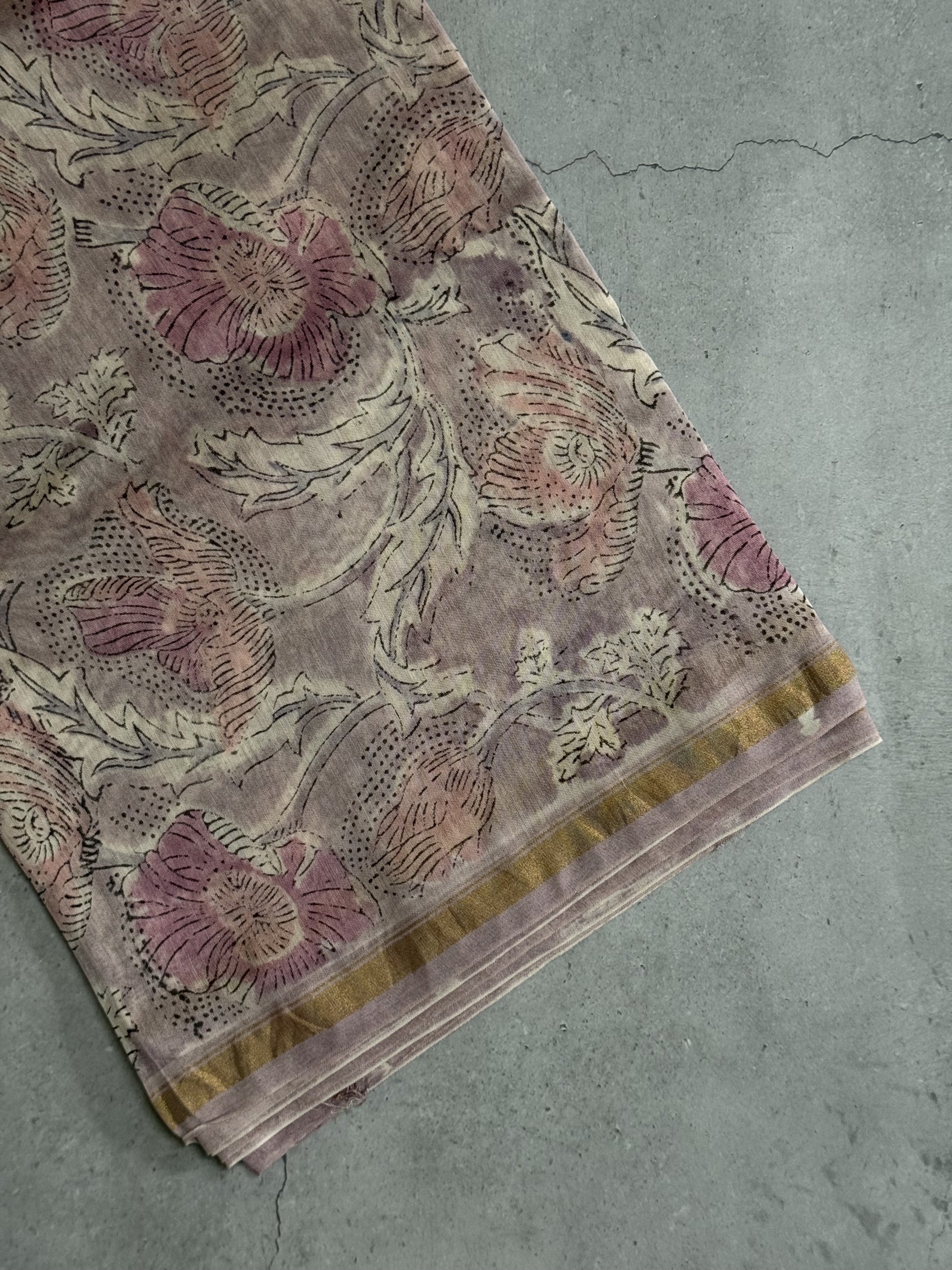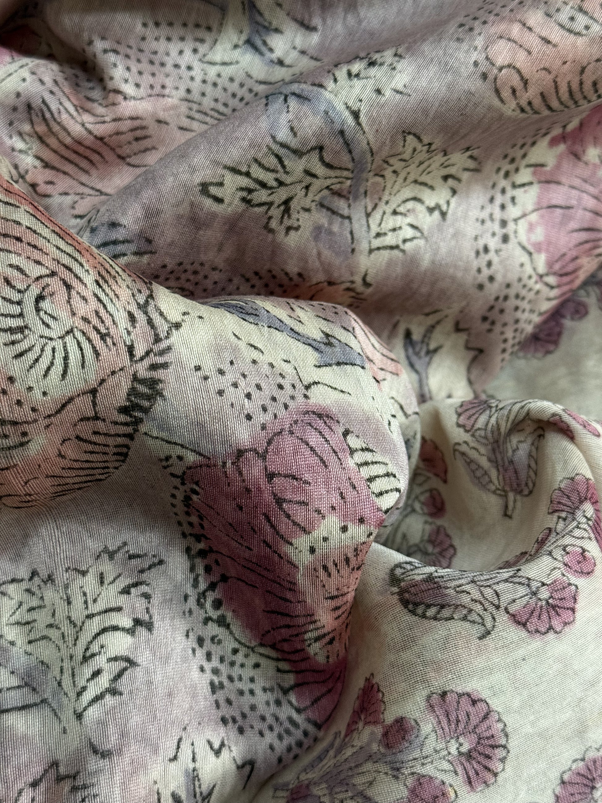 Woven from a delicate blend of silk and cotton, the fabric carries a soft sheen and whisper-light drape. What makes this drape stand apart is the hand block printing — done meticulously by artisans using natural dyes and centuries-old techniques. The combination of sheer elegance and detailed artistry makes it a versatile choice for mindful dressing, whether it's a festive gathering or a graceful day event.