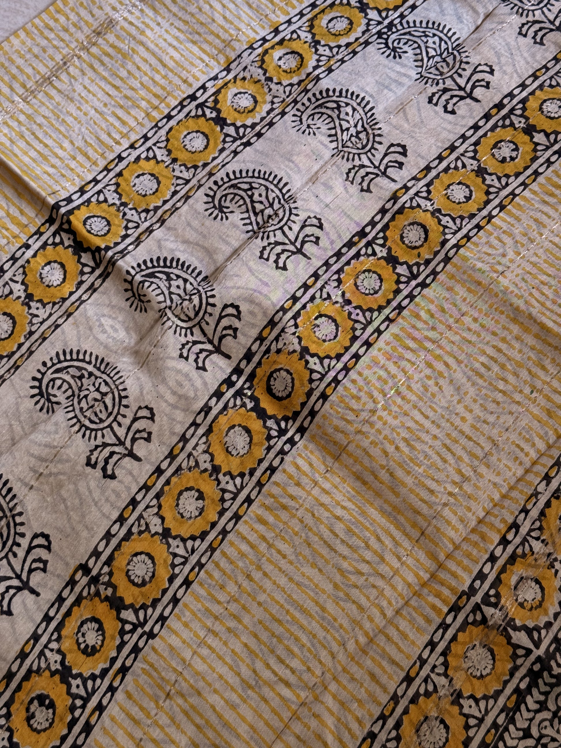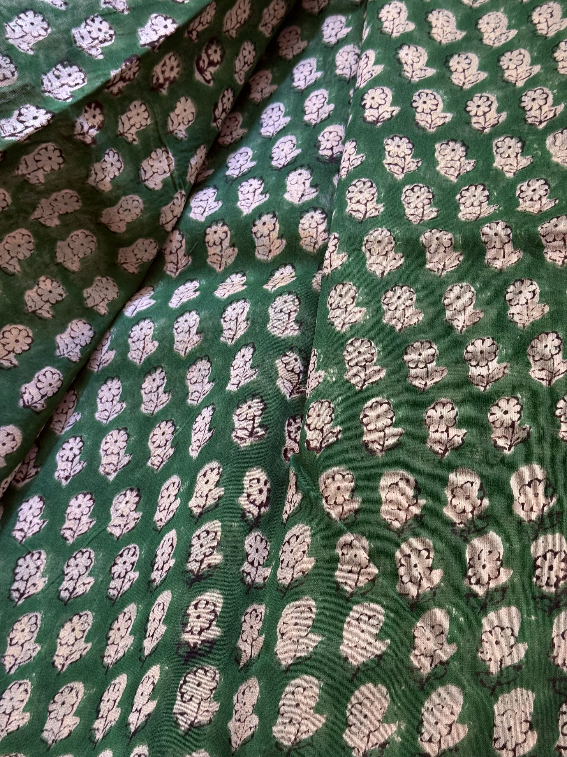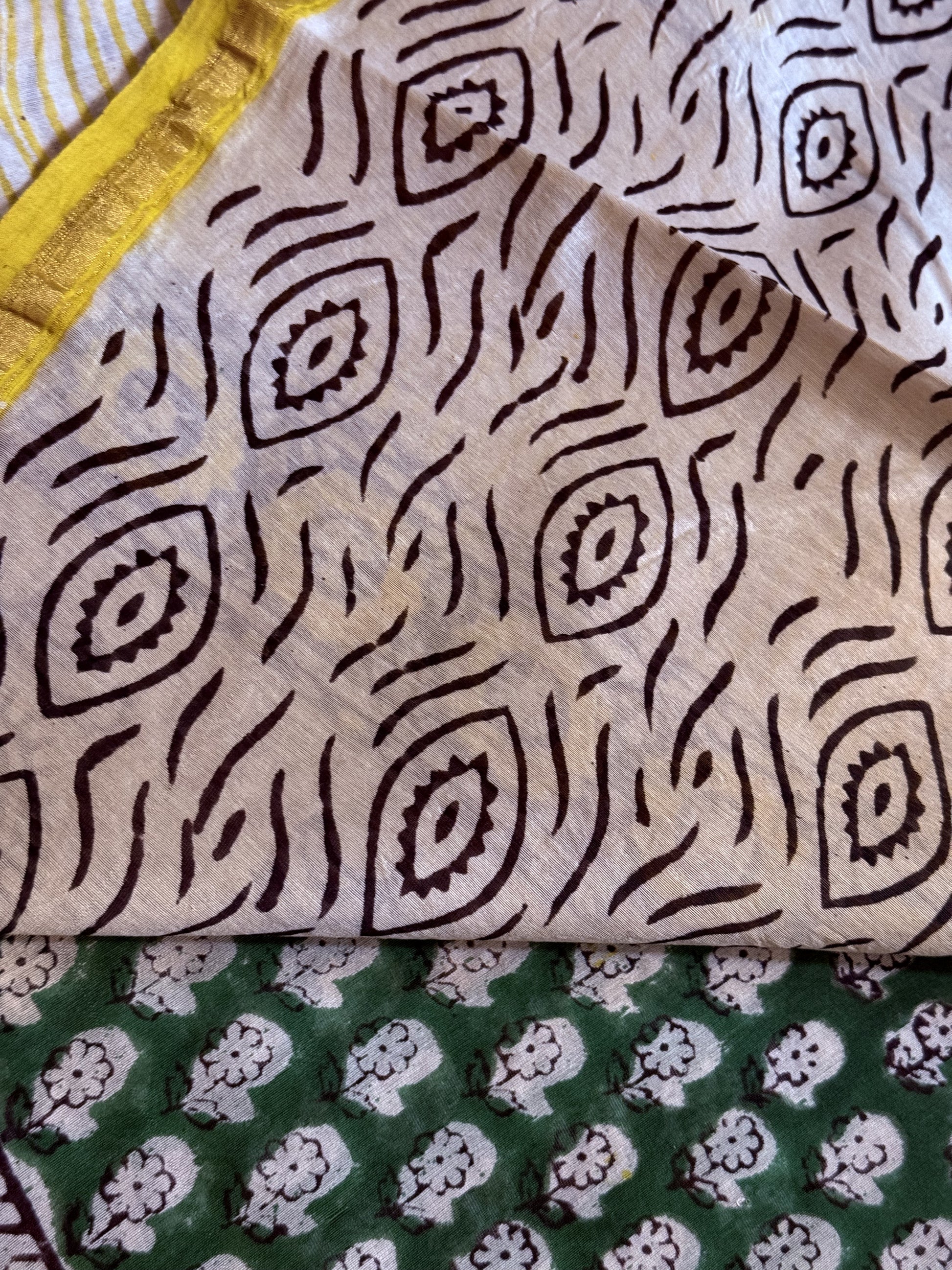 Woven from a delicate blend of silk and cotton, the fabric carries a soft sheen and whisper-light drape. What makes this drape stand apart is the hand block printing — done meticulously by artisans using natural dyes and centuries-old techniques. The combination of sheer elegance and detailed artistry makes it a versatile choice for mindful dressing, whether it's a festive gathering or a graceful day event.