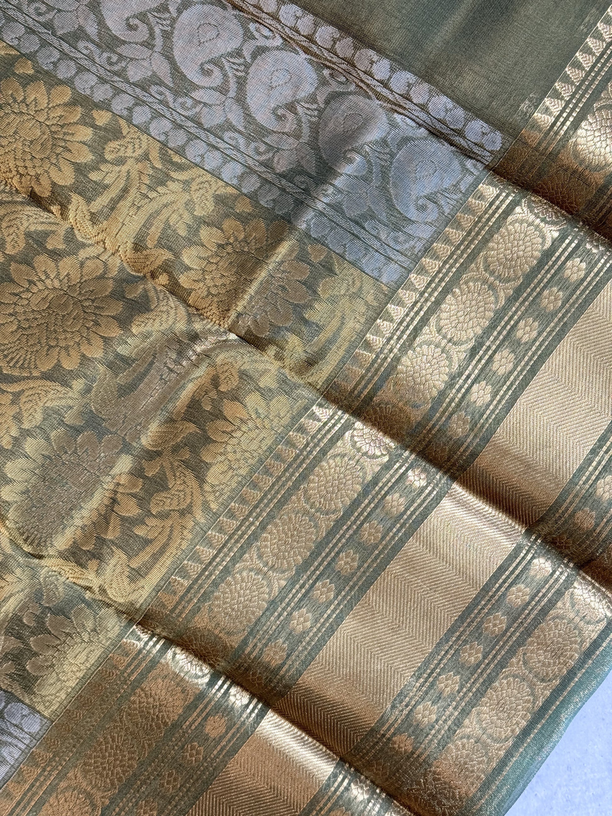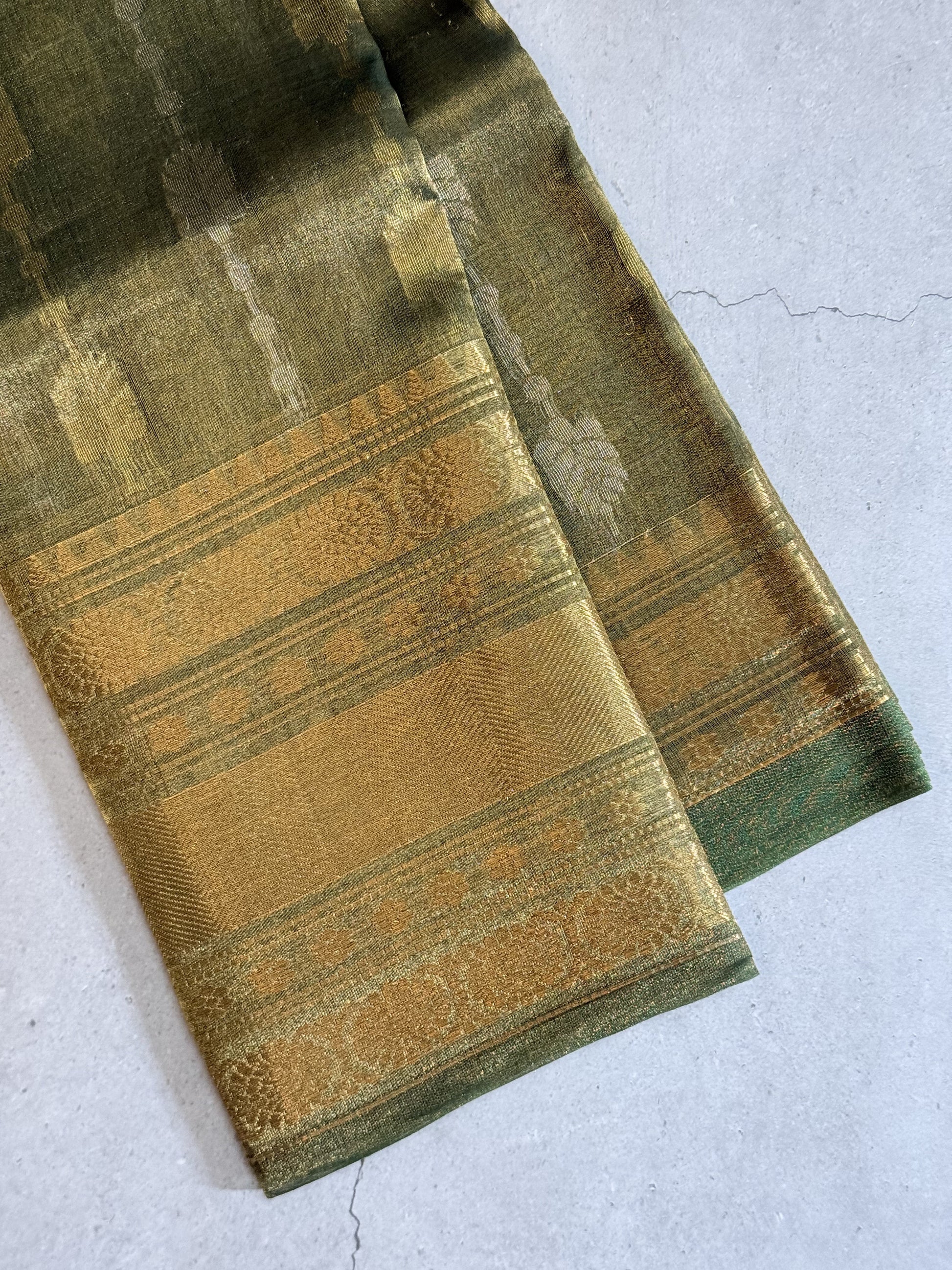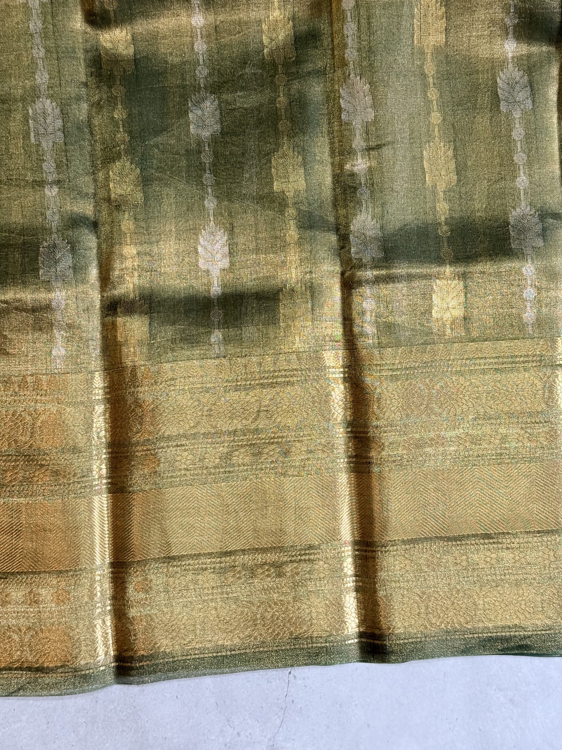 A Glass Tissue Silk saree is a breathtaking blend of elegance and opulence, crafted from fine silk with a delicate, lustrous finish that mimics the sheen of glass. The fabric’s unique texture, light as air yet rich in appearance, features a subtle metallic shimmer, giving it a glamorous and refined look. Often adorned with intricate zari work or traditional motifs, these sarees exude sophistication and are perfect for grand occasions like weddings and festivals. With its graceful drape and luxurious sheen, a Glass Tissue Silk saree is a statement of timeless beauty and exquisite craftsmanship.
