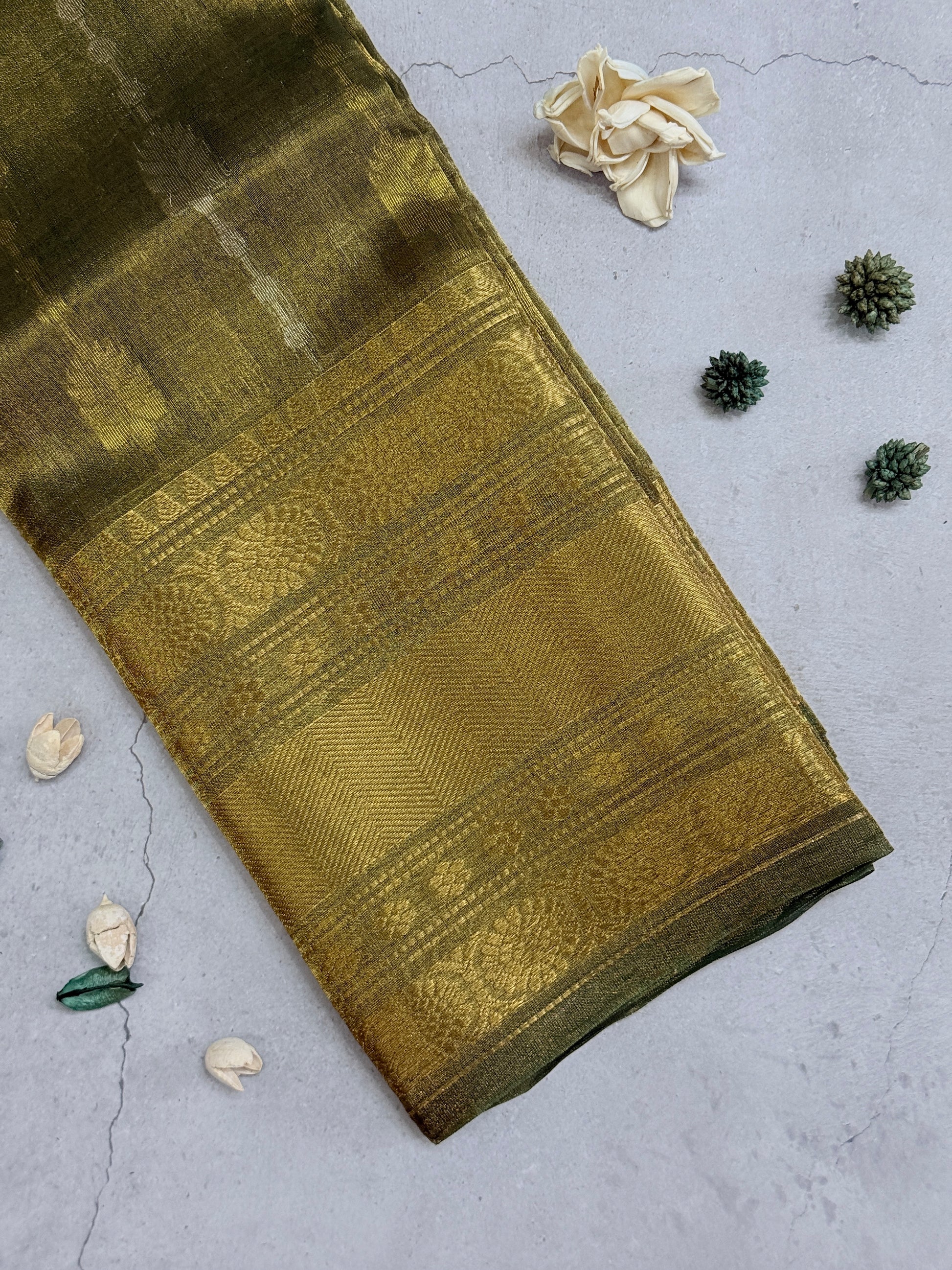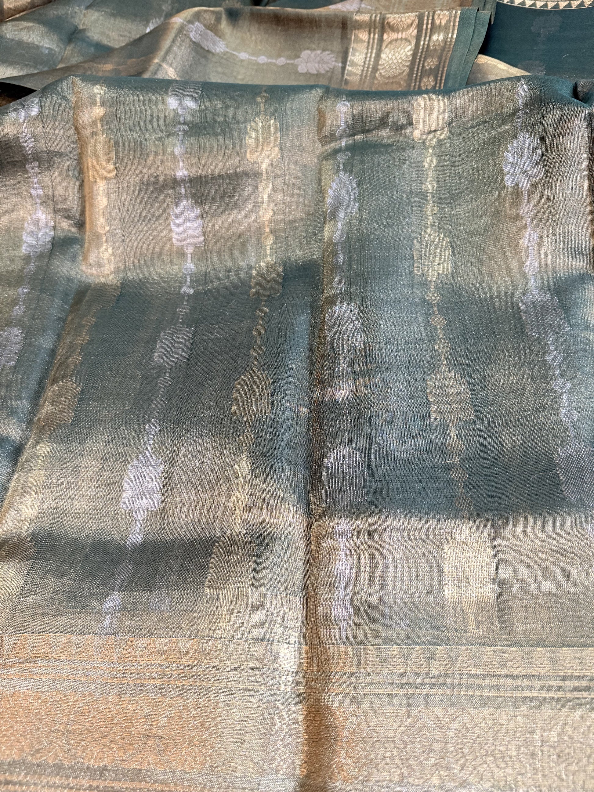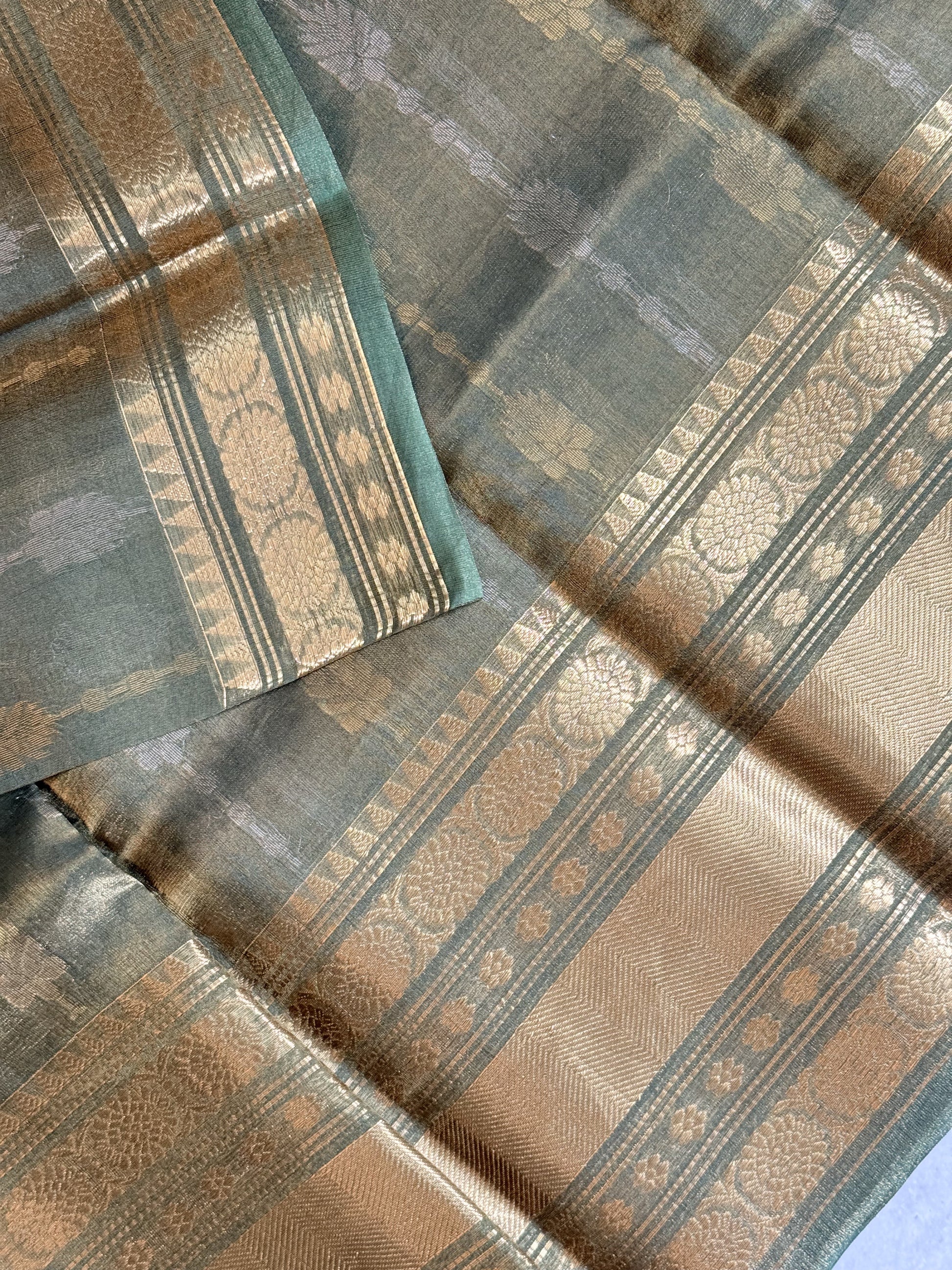 A Glass Tissue Silk saree is a breathtaking blend of elegance and opulence, crafted from fine silk with a delicate, lustrous finish that mimics the sheen of glass. The fabric’s unique texture, light as air yet rich in appearance, features a subtle metallic shimmer, giving it a glamorous and refined look. Often adorned with intricate zari work or traditional motifs, these sarees exude sophistication and are perfect for grand occasions like weddings and festivals. With its graceful drape and luxurious sheen, a Glass Tissue Silk saree is a statement of timeless beauty and exquisite craftsmanship.