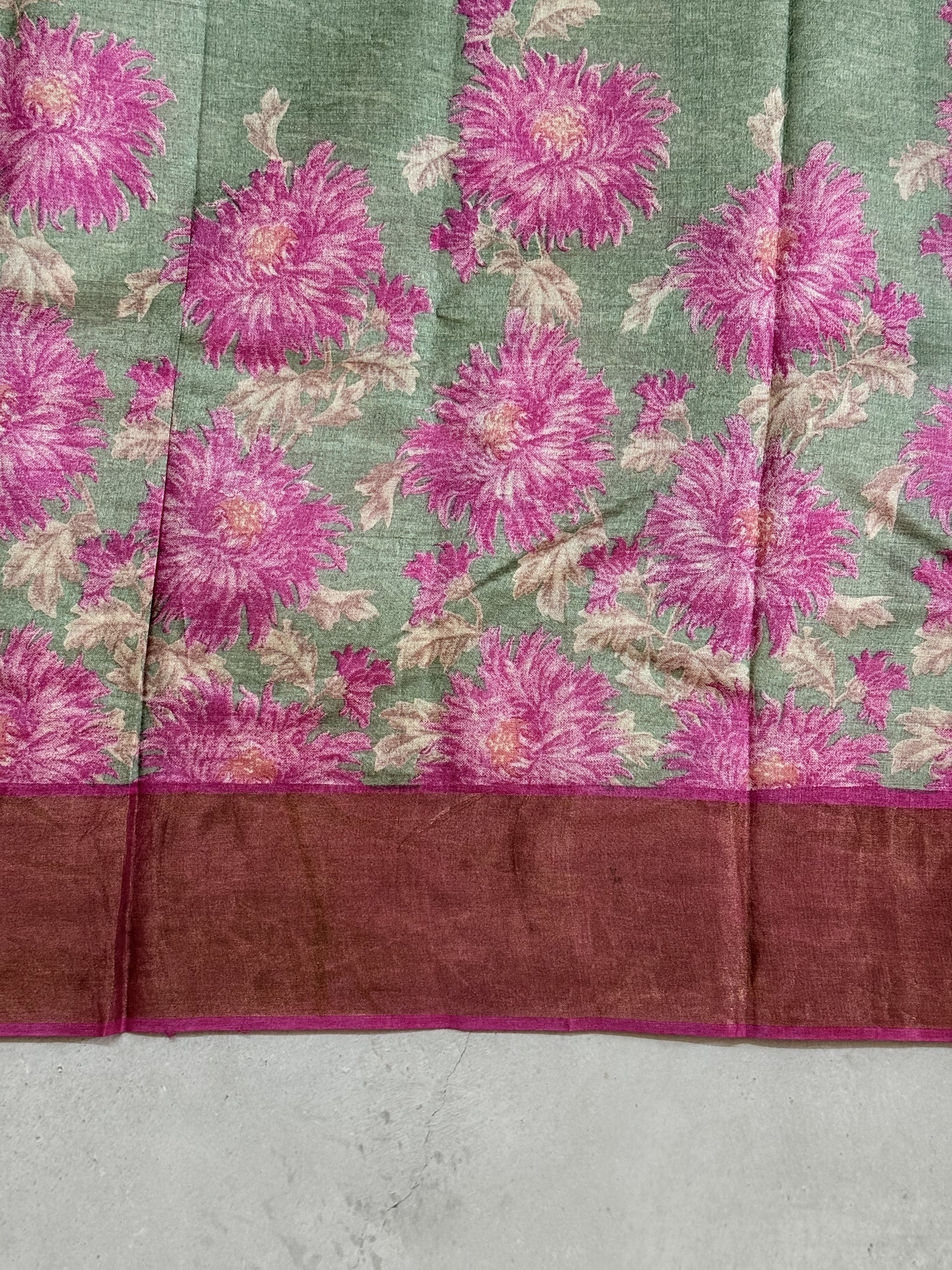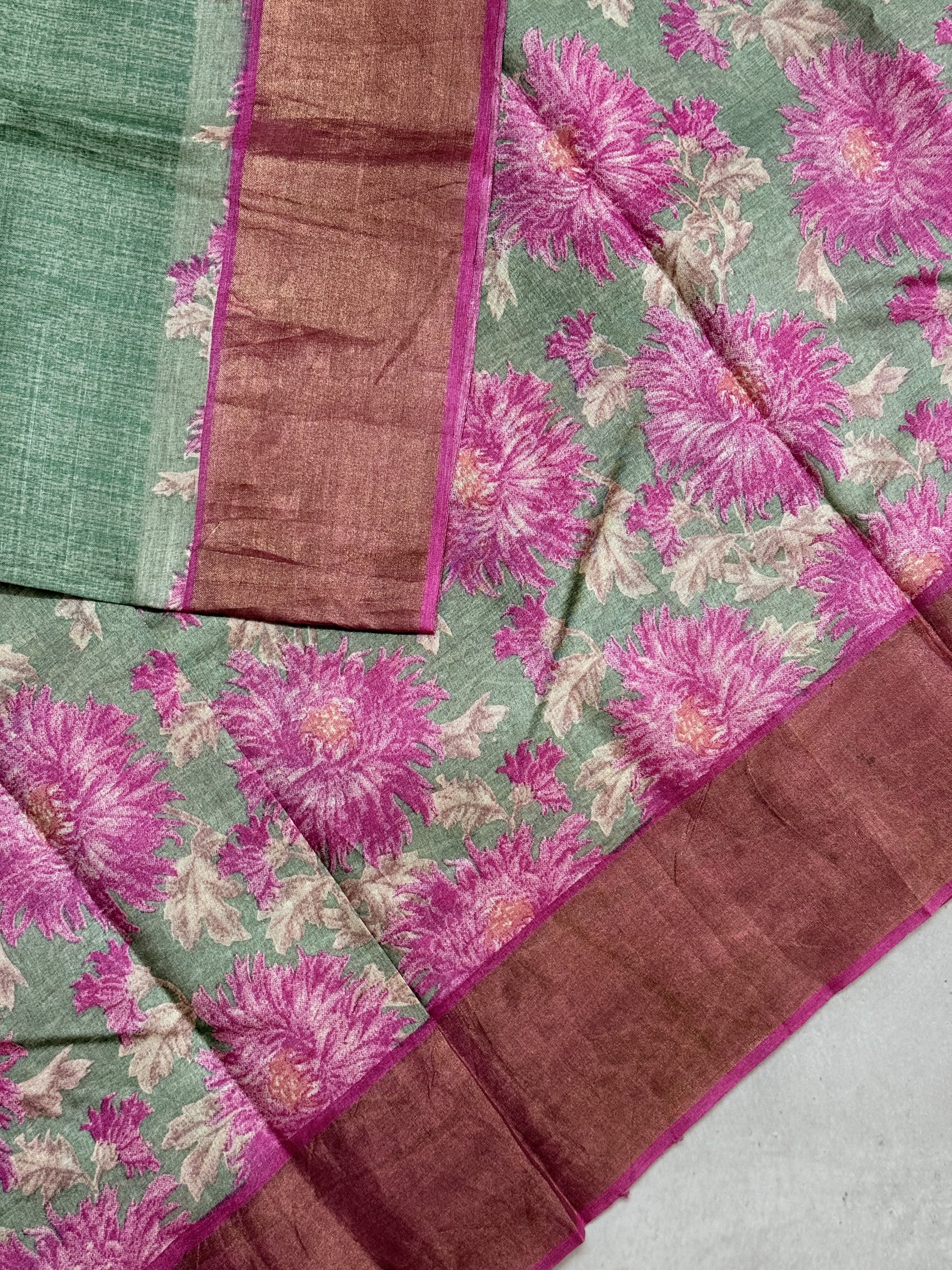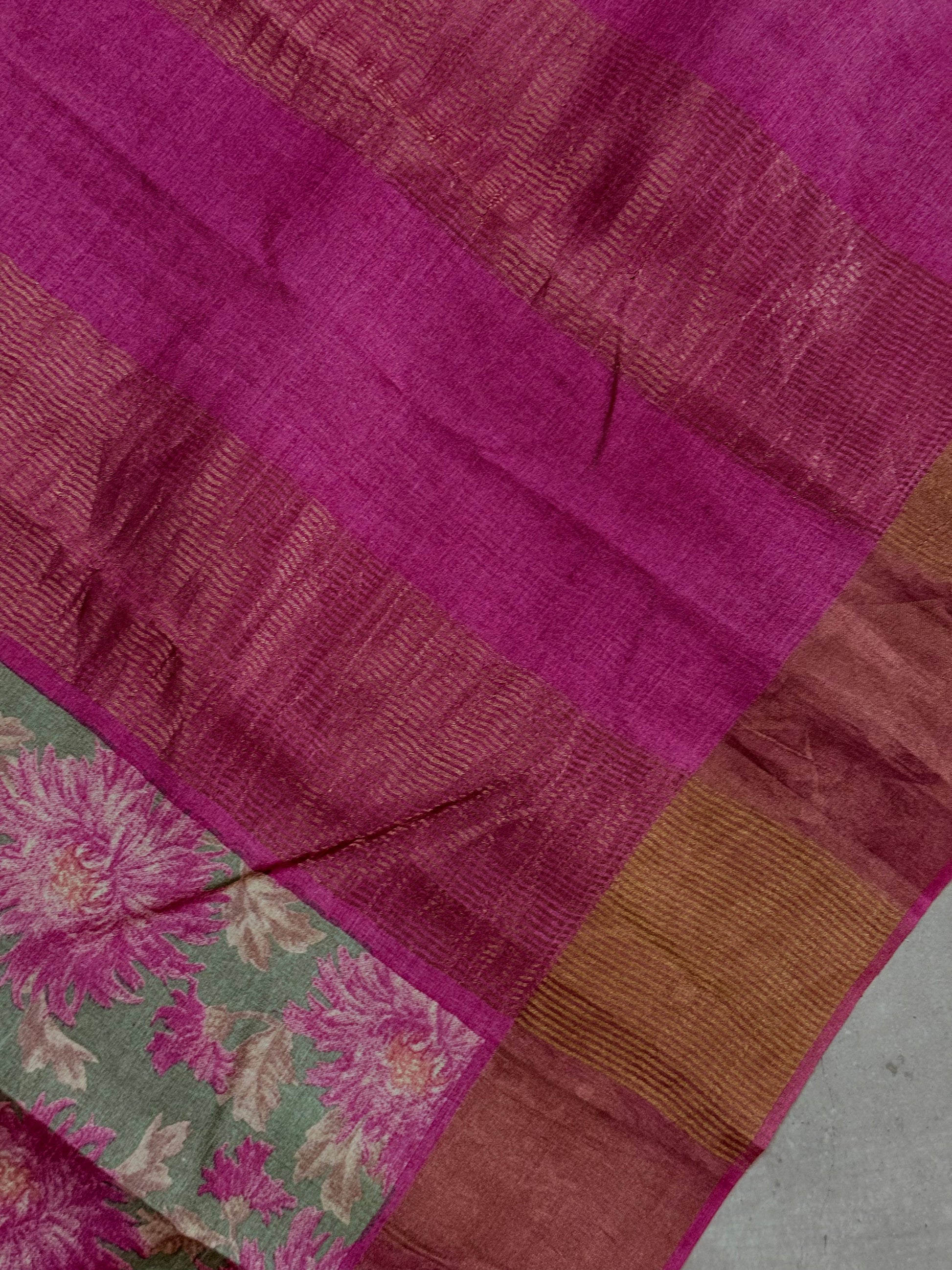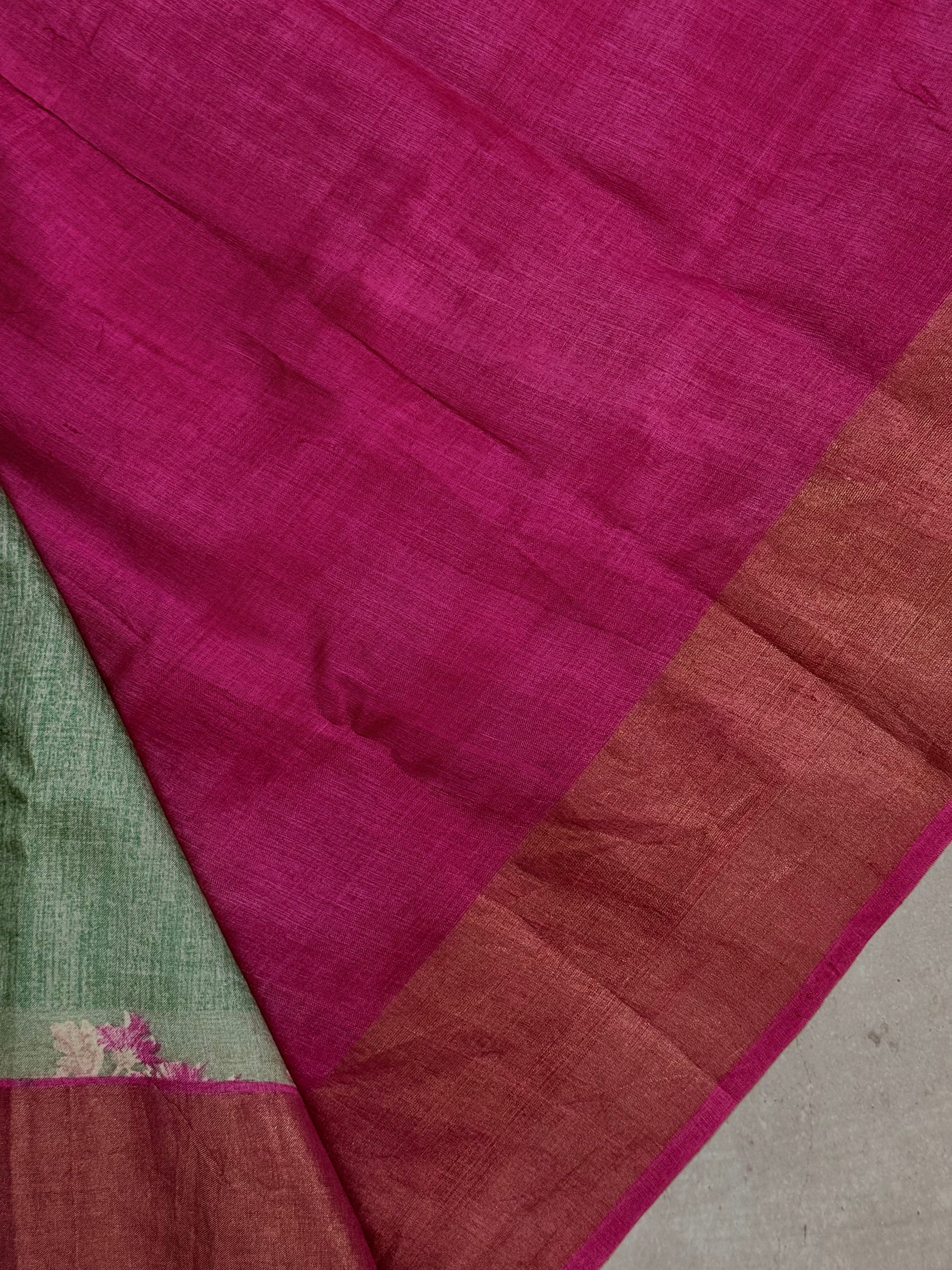 Aravinda | Green and Pink Floral Printed Tussar Silk Saree