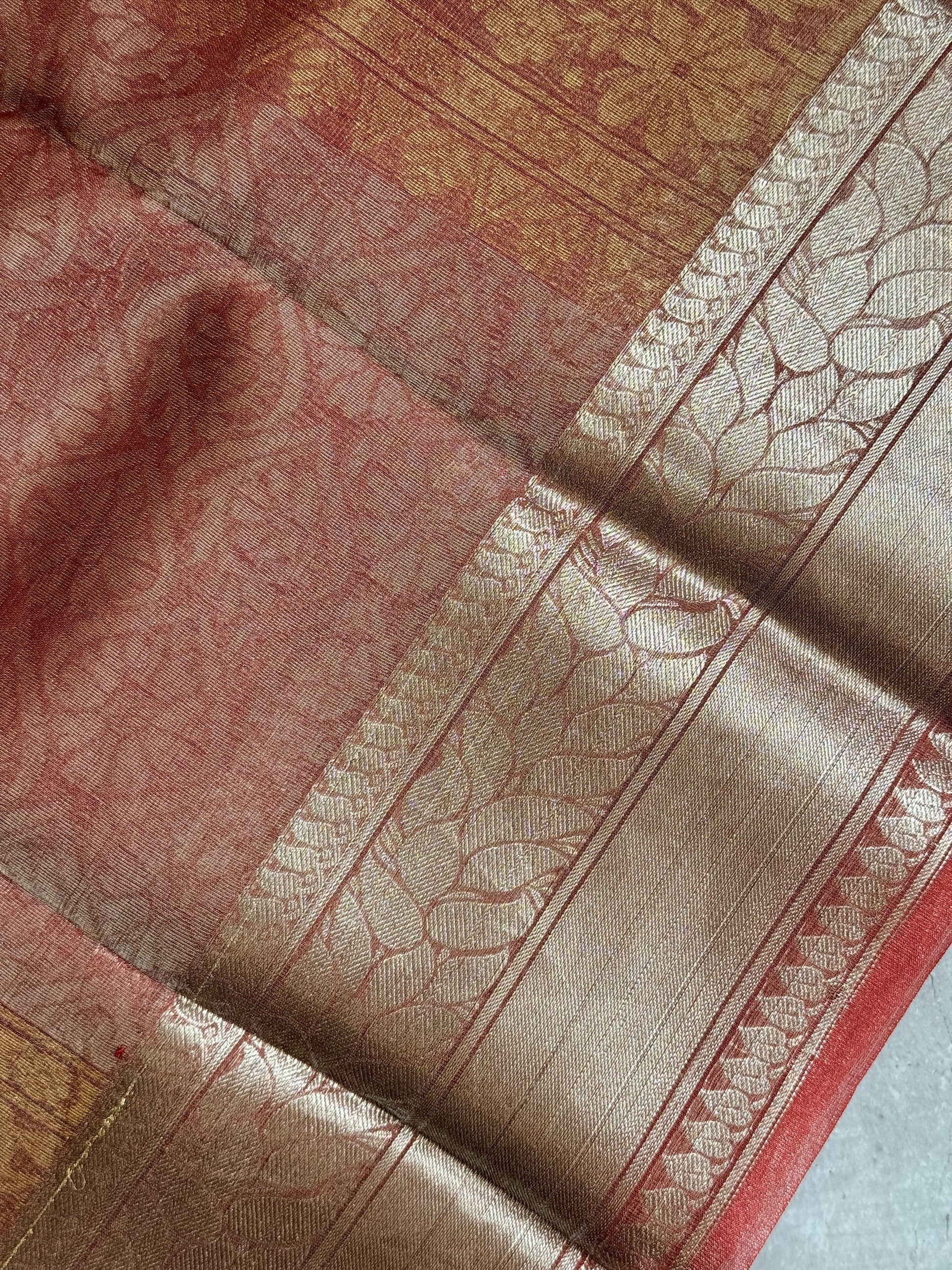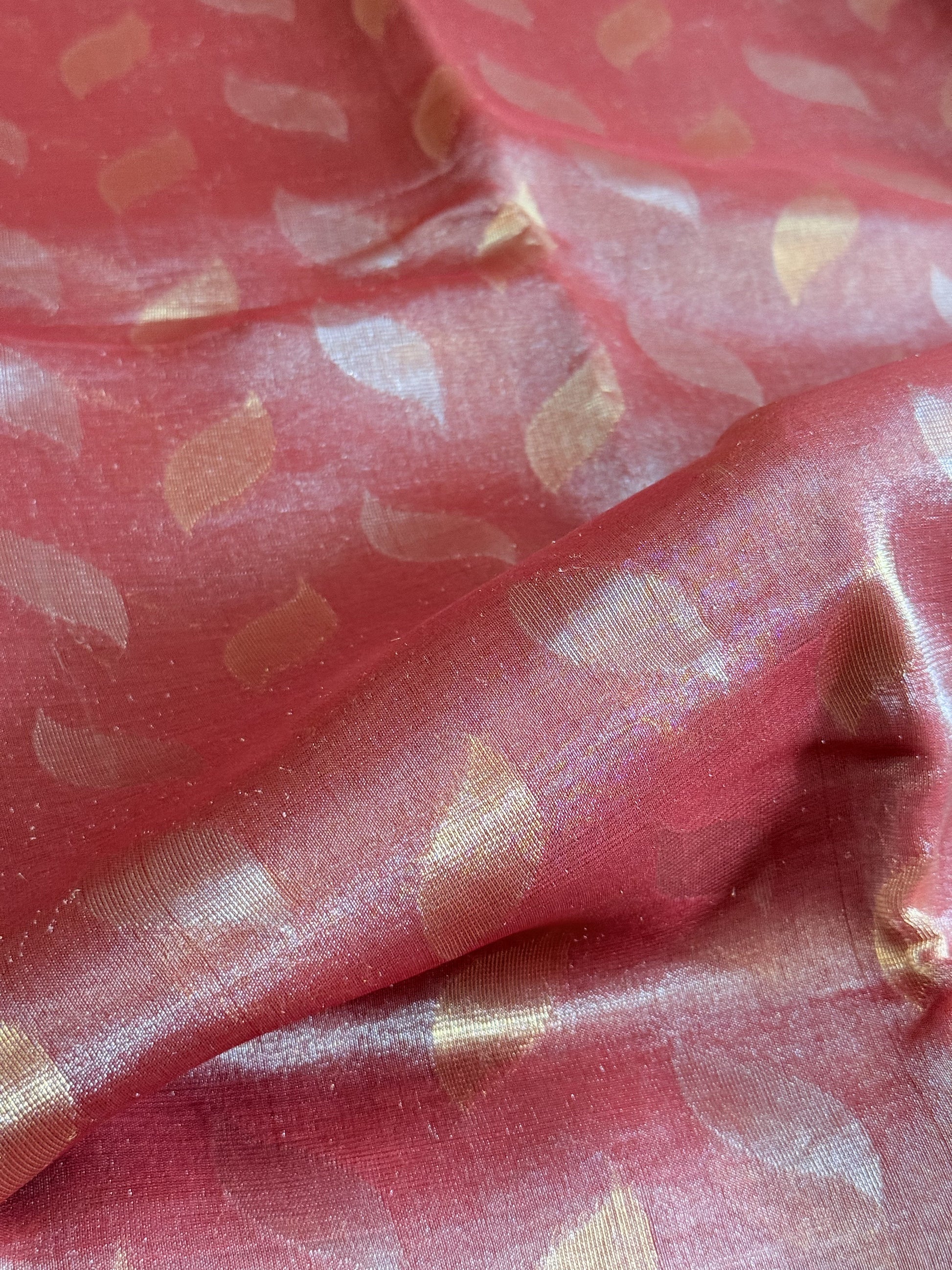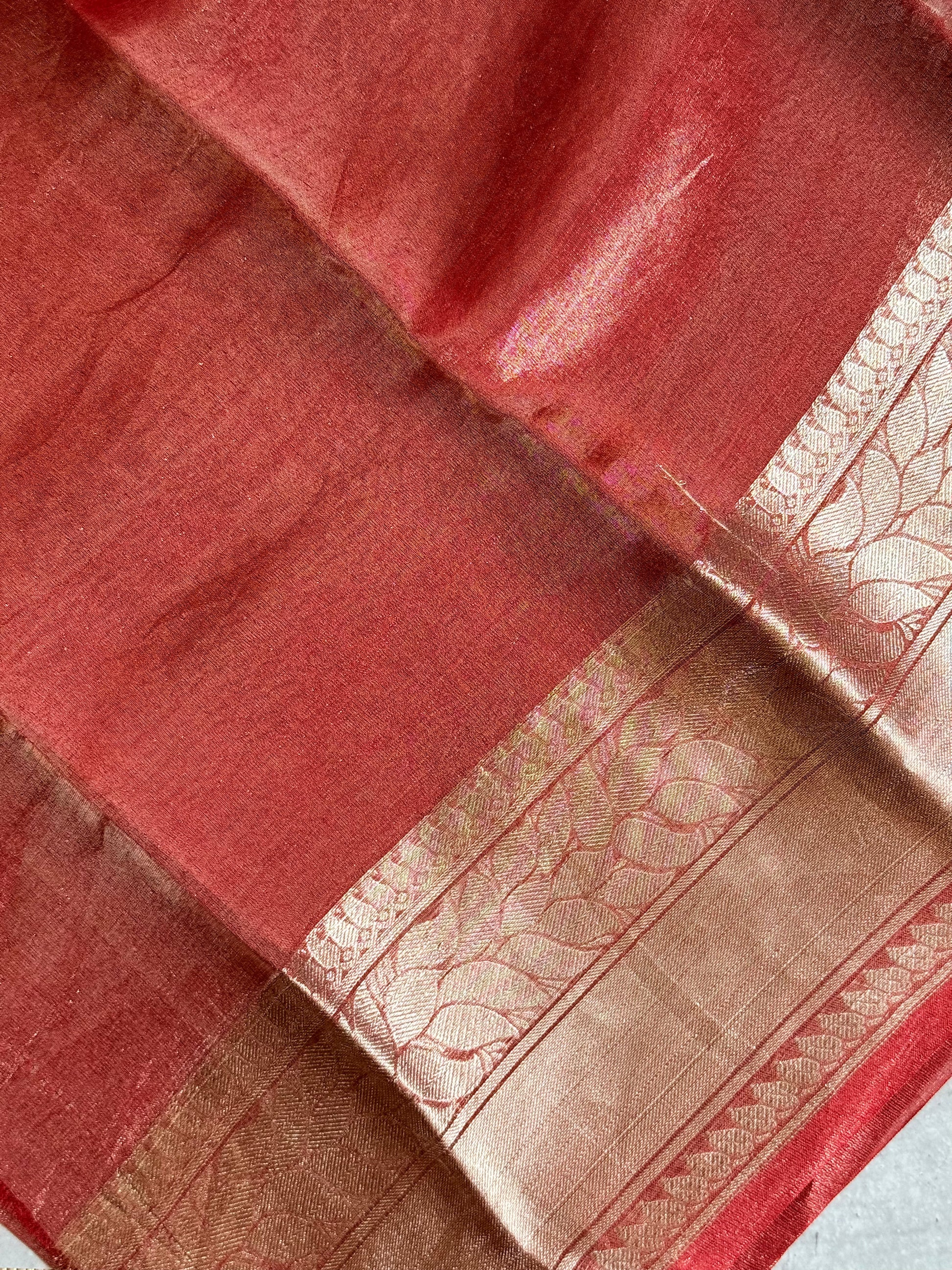 A Glass Tissue Silk saree is a breathtaking blend of elegance and opulence, crafted from fine silk with a delicate, lustrous finish that mimics the sheen of glass. The fabric’s unique texture, light as air yet rich in appearance, features a subtle metallic shimmer, giving it a glamorous and refined look. Often adorned with intricate zari work or traditional motifs, these sarees exude sophistication and are perfect for grand occasions like weddings and festivals. With its graceful drape and luxurious sheen, a Glass Tissue Silk saree is a statement of timeless beauty and exquisite craftsmanship.