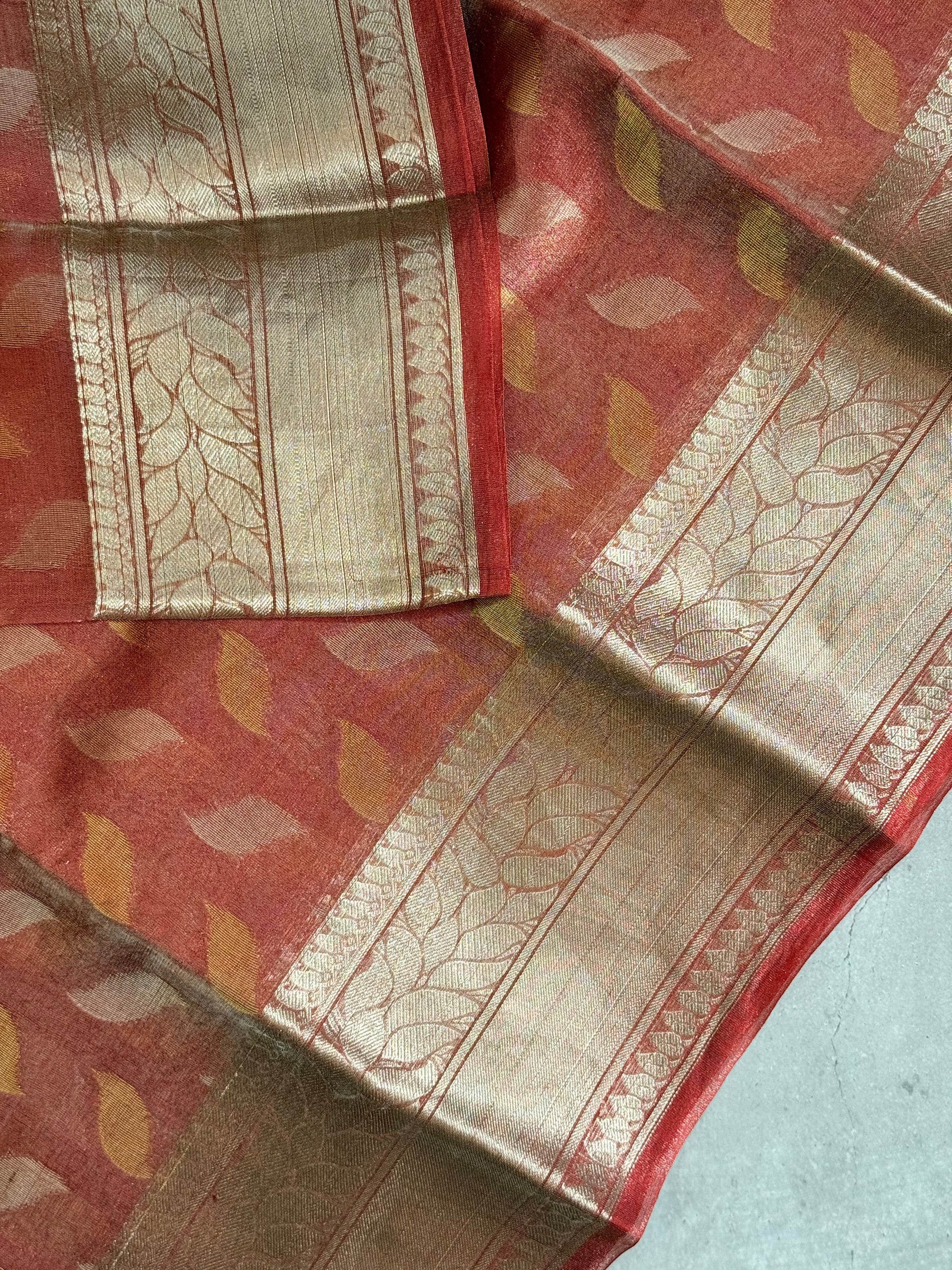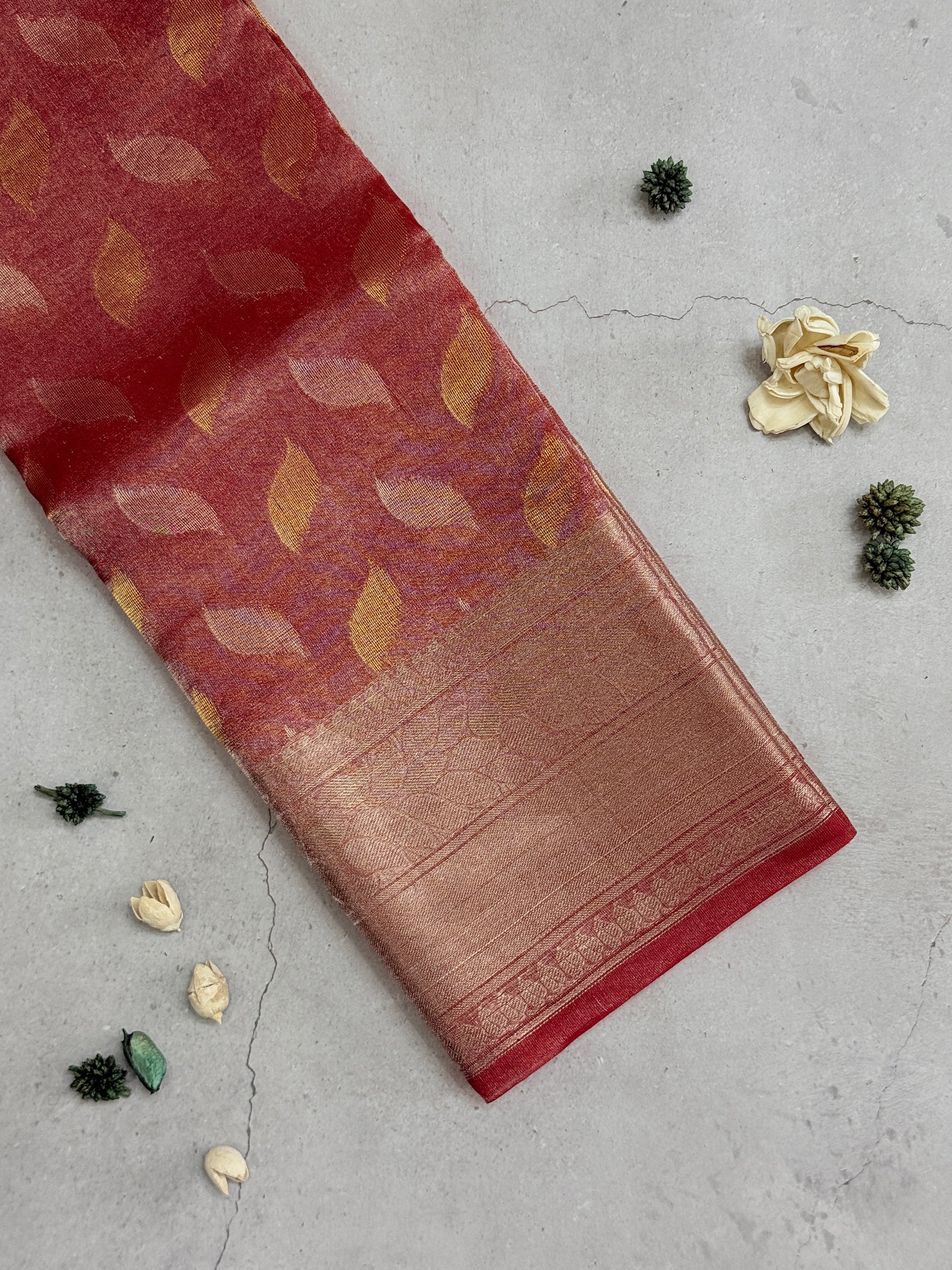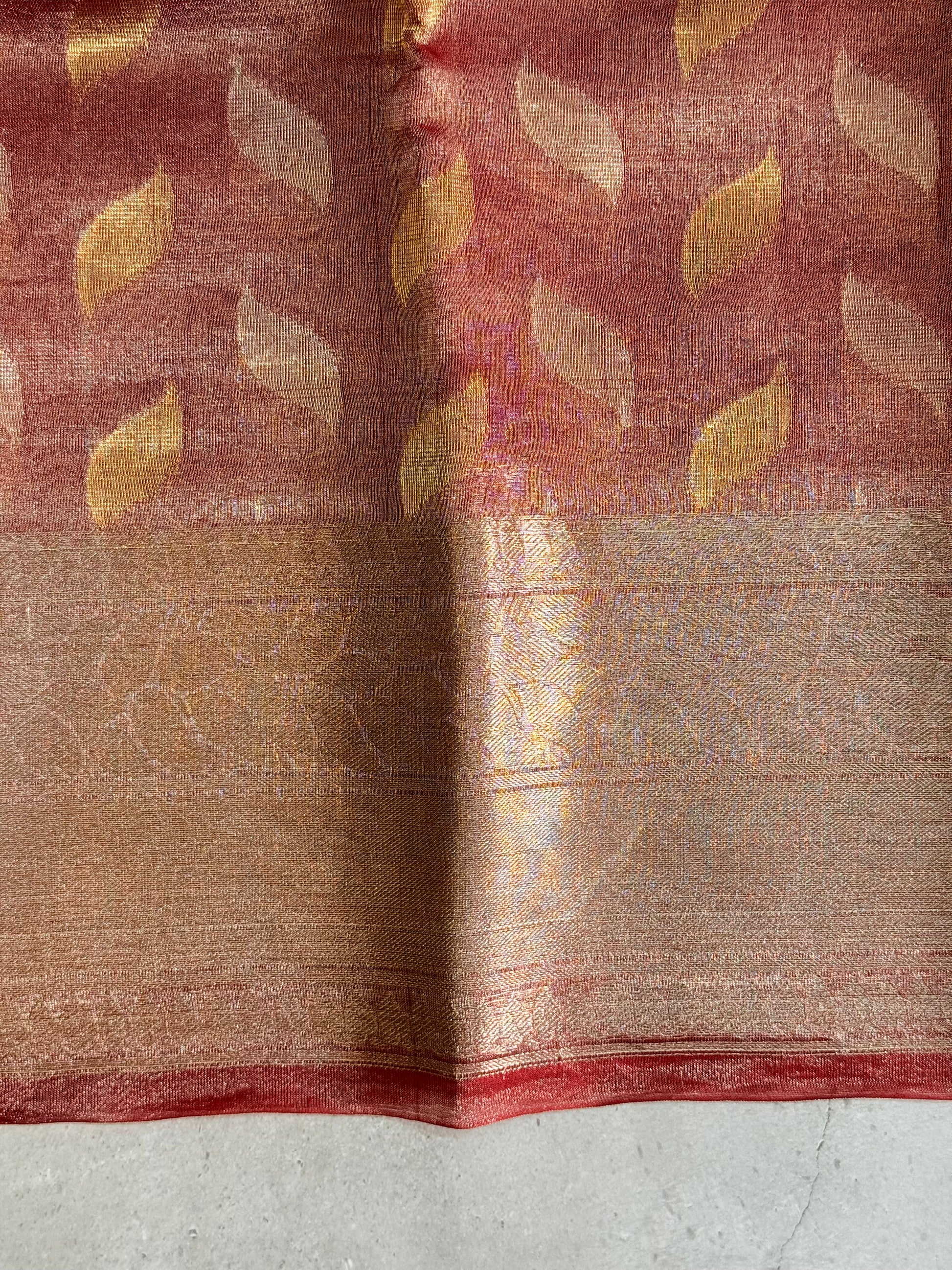 A Glass Tissue Silk saree is a breathtaking blend of elegance and opulence, crafted from fine silk with a delicate, lustrous finish that mimics the sheen of glass. The fabric’s unique texture, light as air yet rich in appearance, features a subtle metallic shimmer, giving it a glamorous and refined look. Often adorned with intricate zari work or traditional motifs, these sarees exude sophistication and are perfect for grand occasions like weddings and festivals. With its graceful drape and luxurious sheen, a Glass Tissue Silk saree is a statement of timeless beauty and exquisite craftsmanship.