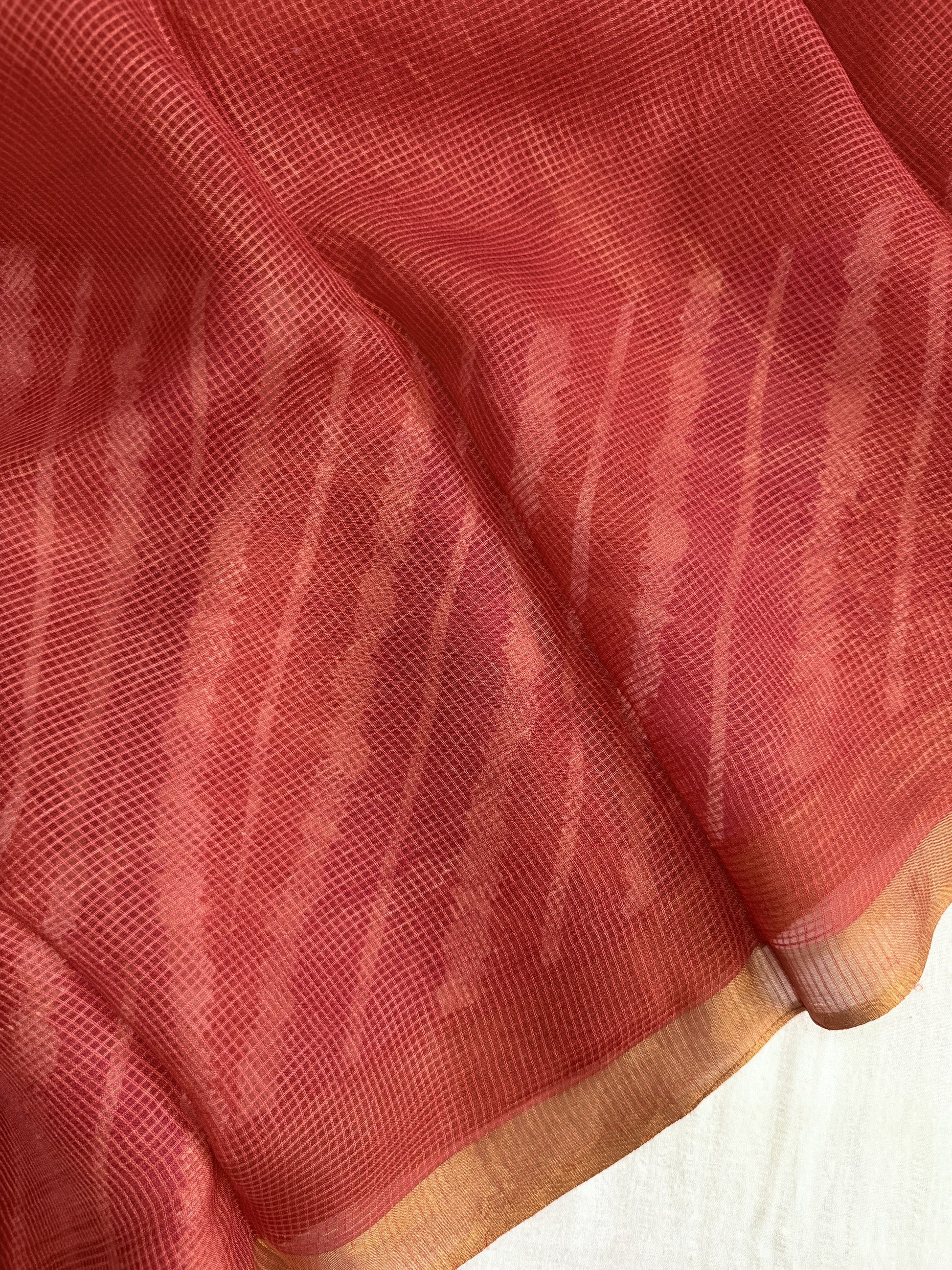 Handwoven with a fine blend of Kota’s airy structure and Gicha Tussar’s natural richness, this saree offers a refined yet breathable drape. The subtle gold zari border adds a hint of sophistication, making it perfect for intimate gatherings, festive mornings, or graceful day events. Understated yet opulent, it’s a piece that feels as beautiful as it looks.