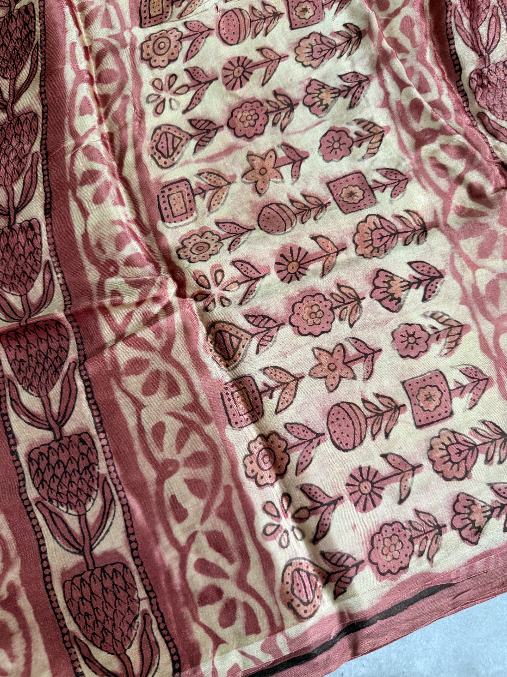 Ivaana| Brown and Peach Floral Block Printed Modal Silk Saree