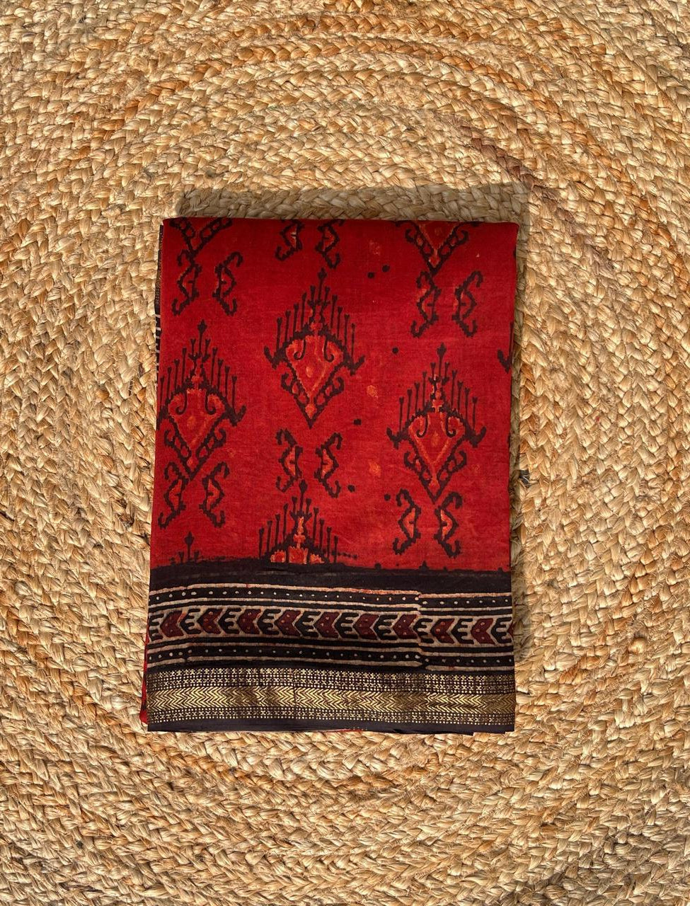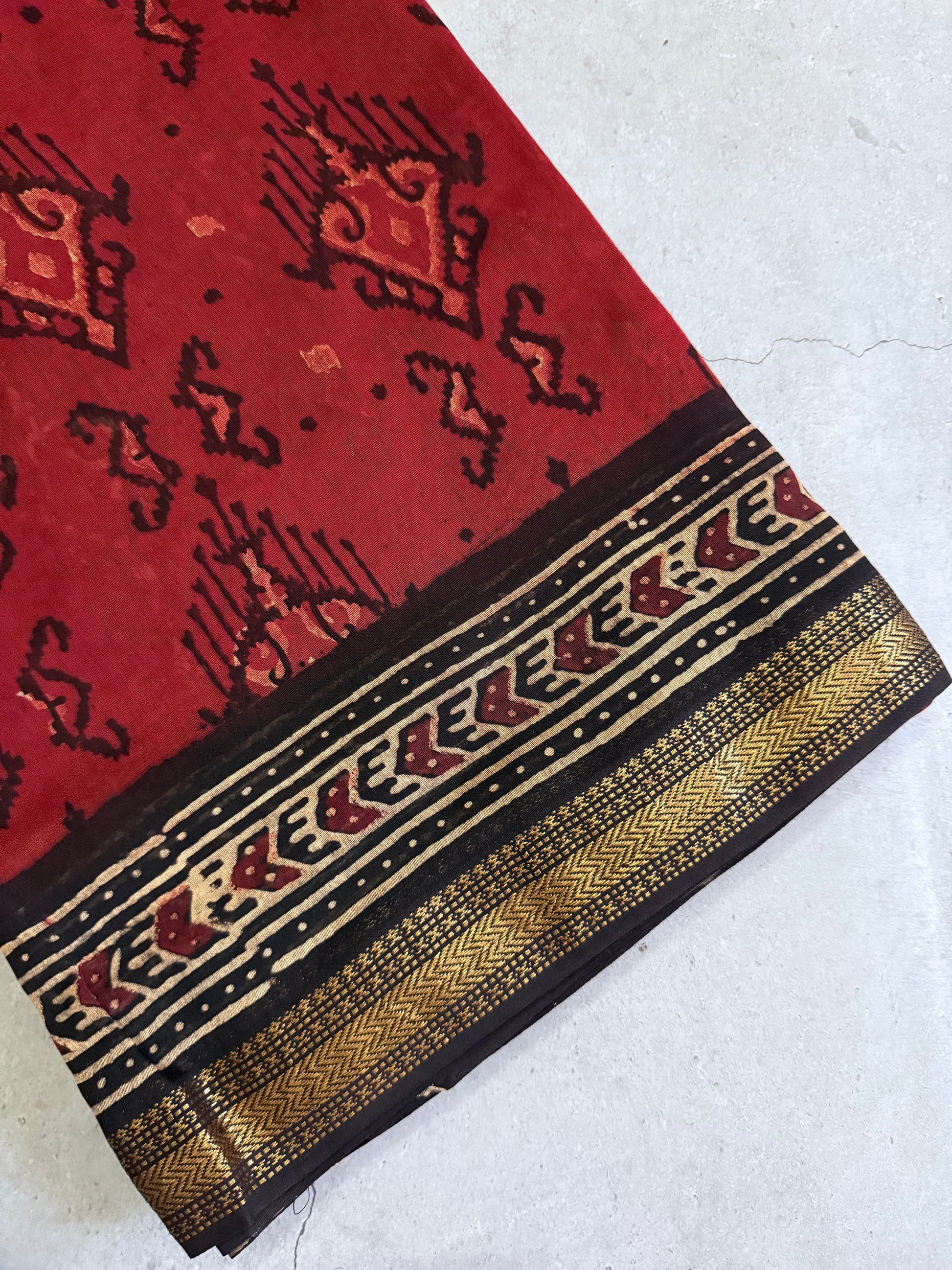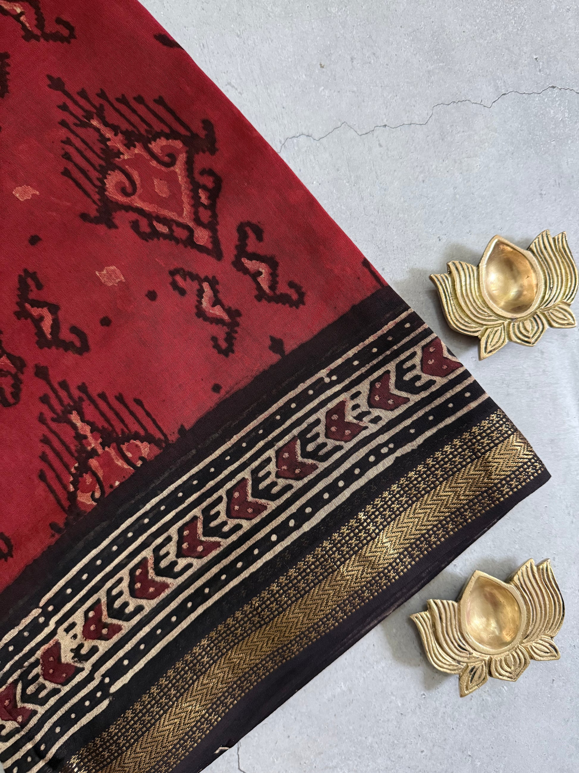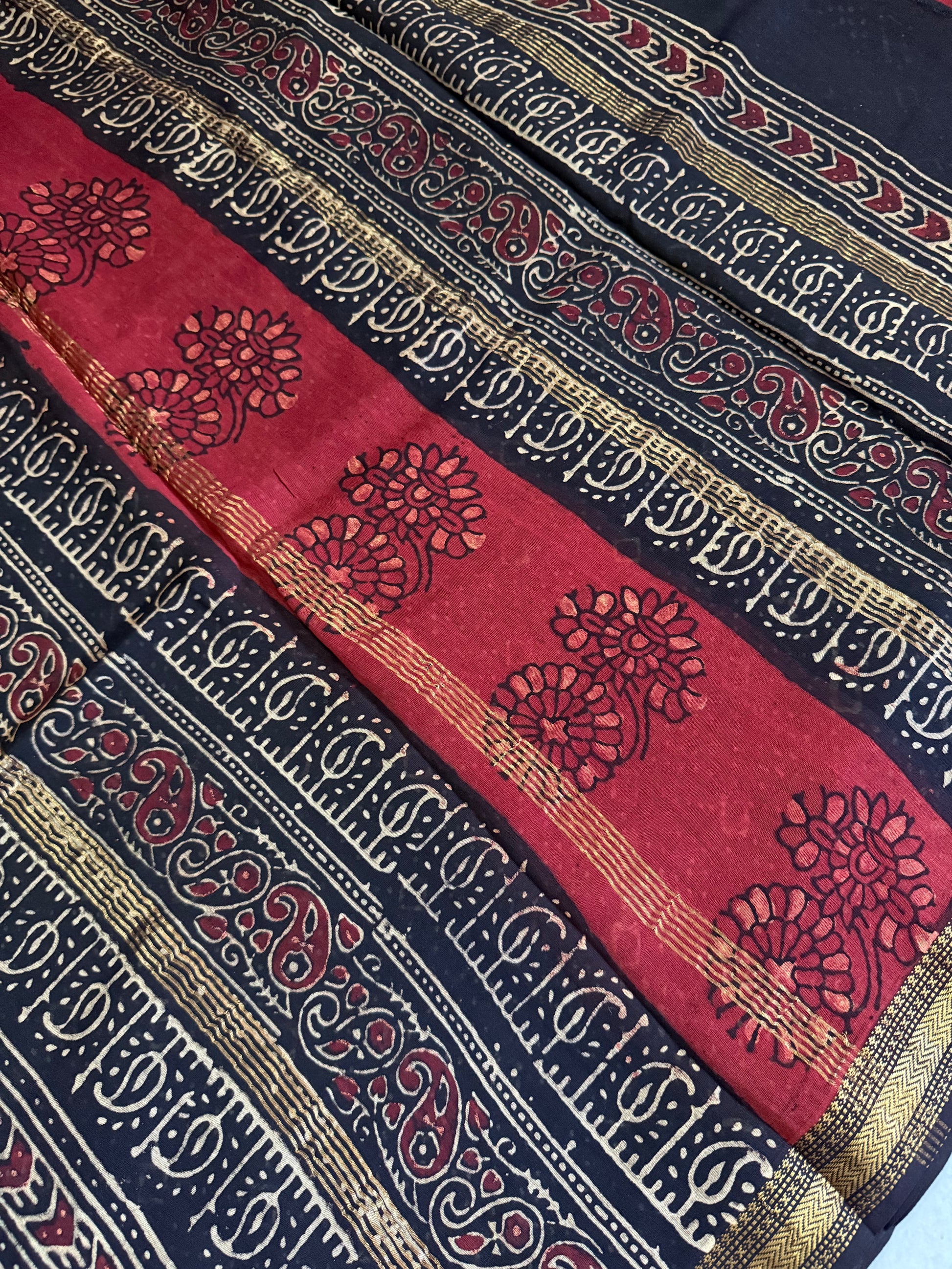 Kameshwari | Red and Black Block Printed Maheshwari Saree