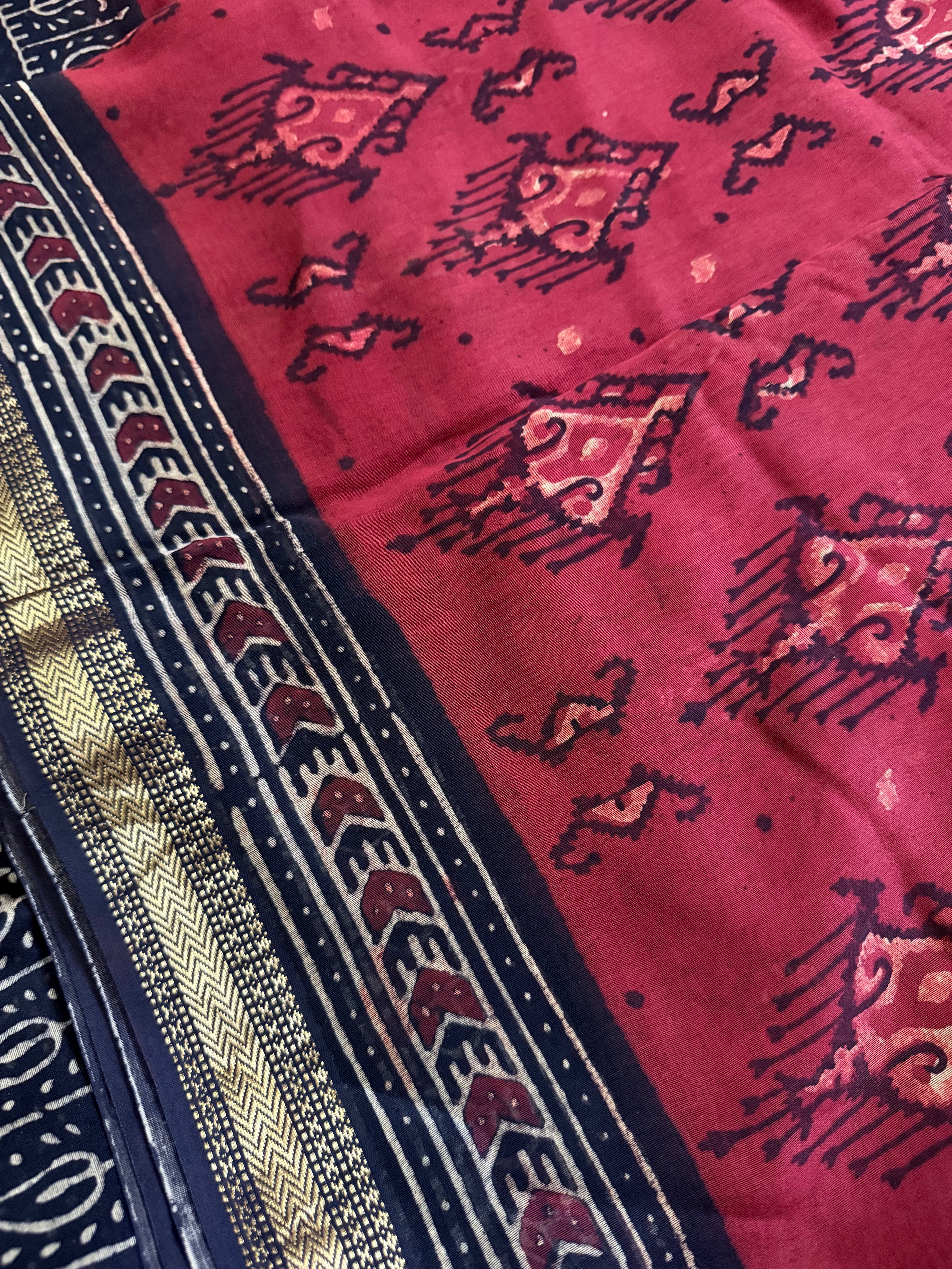 Woven in the heart of Madhya Pradesh, Maheshwari weaves are known for their fine texture, delicate zari borders, and subtle sheen. This saree is adorned with hand-block printed motifs using traditional techniques, making each piece truly unique.