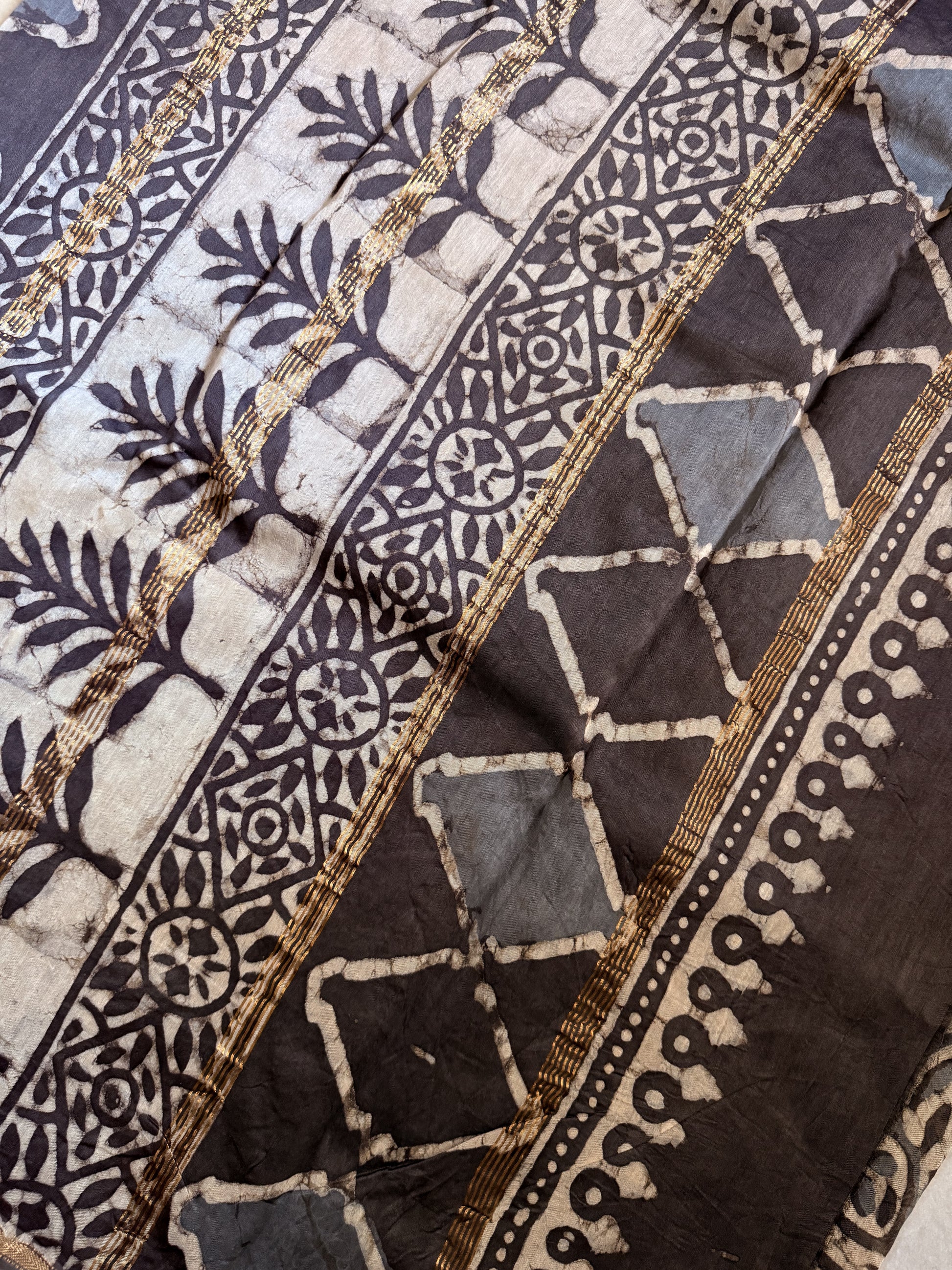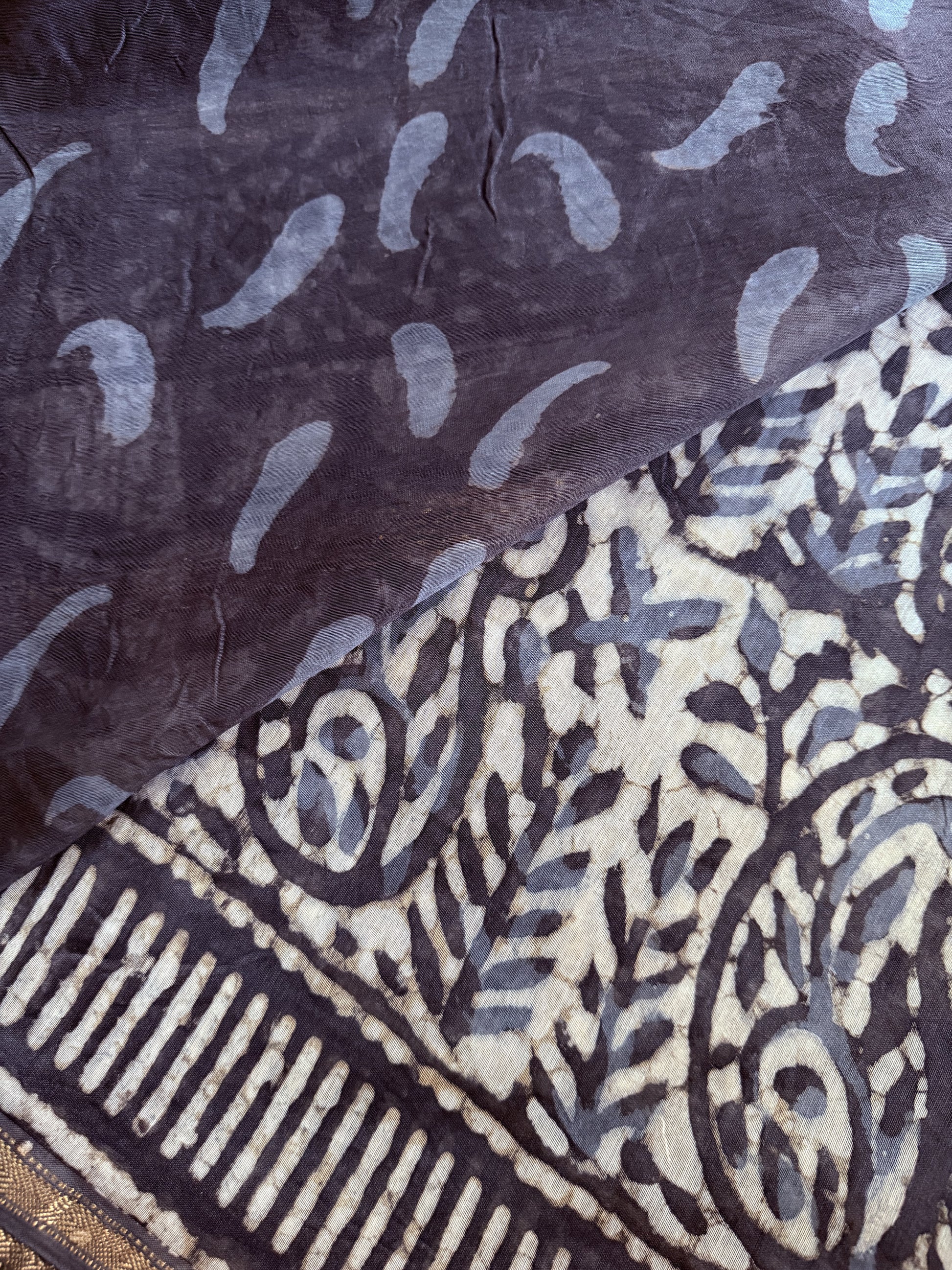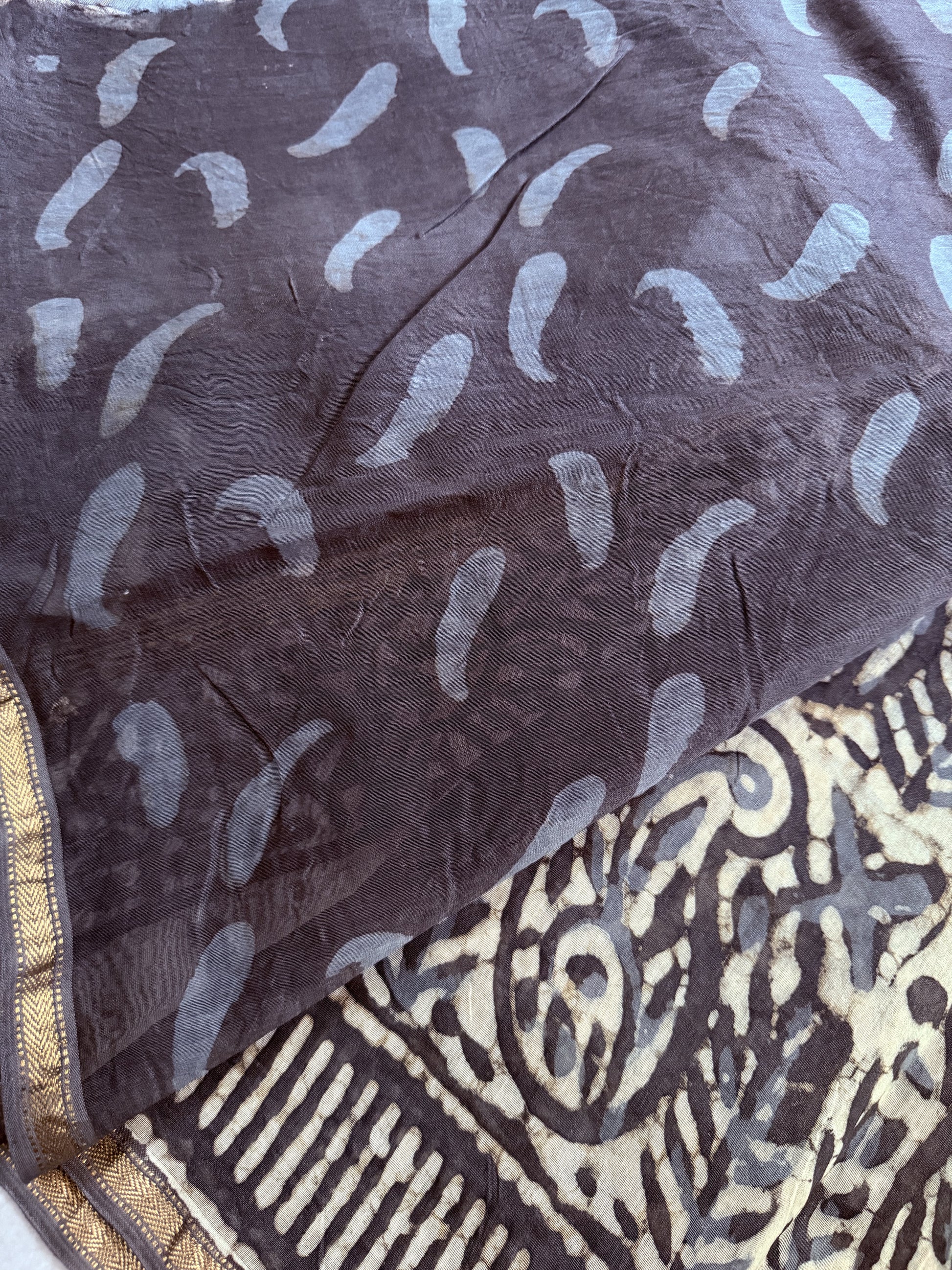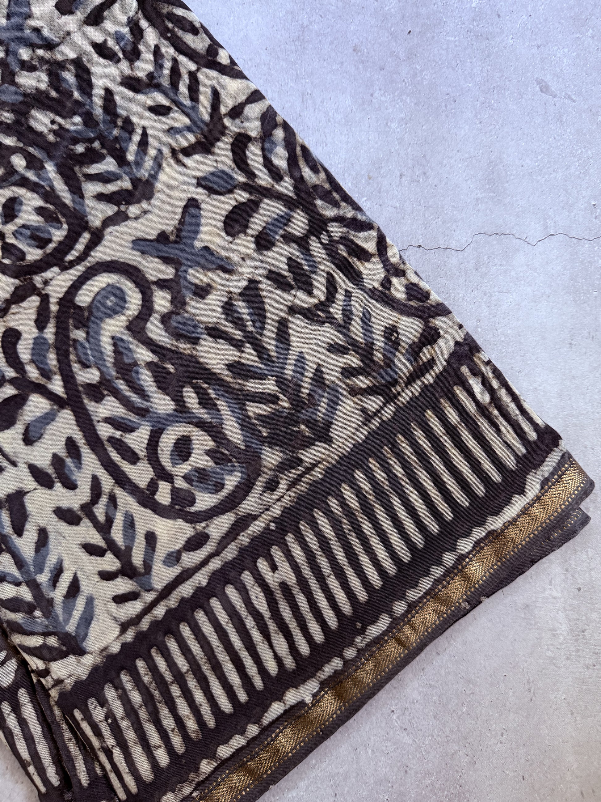 Woven from a delicate blend of silk and cotton, the fabric carries a soft sheen and whisper-light drape. What makes this drape stand apart is the hand block printing — done meticulously by artisans using natural dyes and centuries-old techniques. The combination of sheer elegance and detailed artistry makes it a versatile choice for mindful dressing, whether it's a festive gathering or a graceful day event.