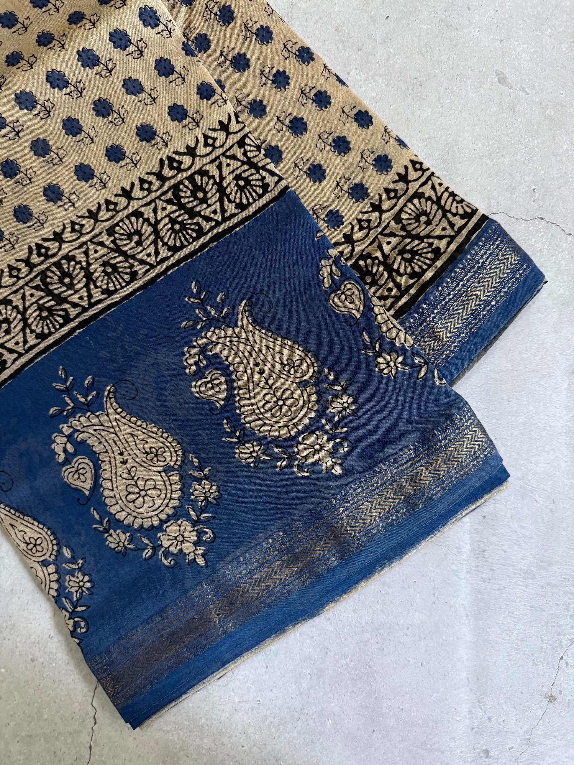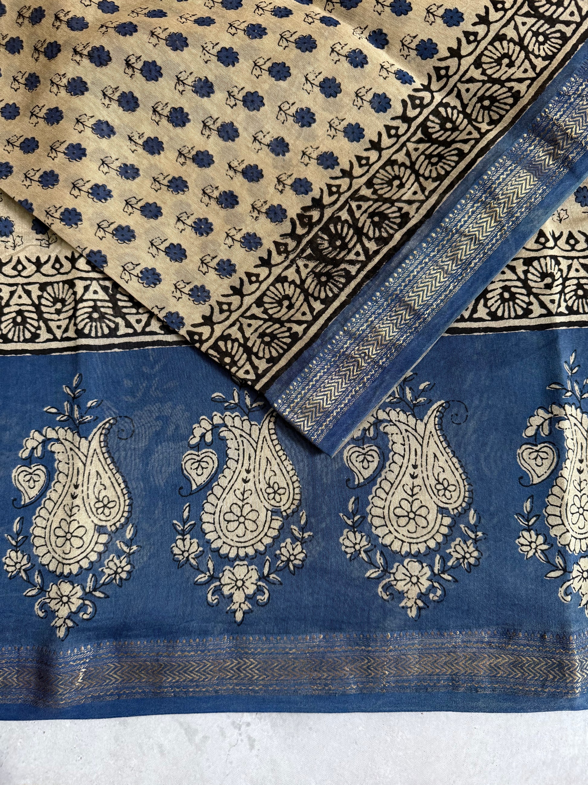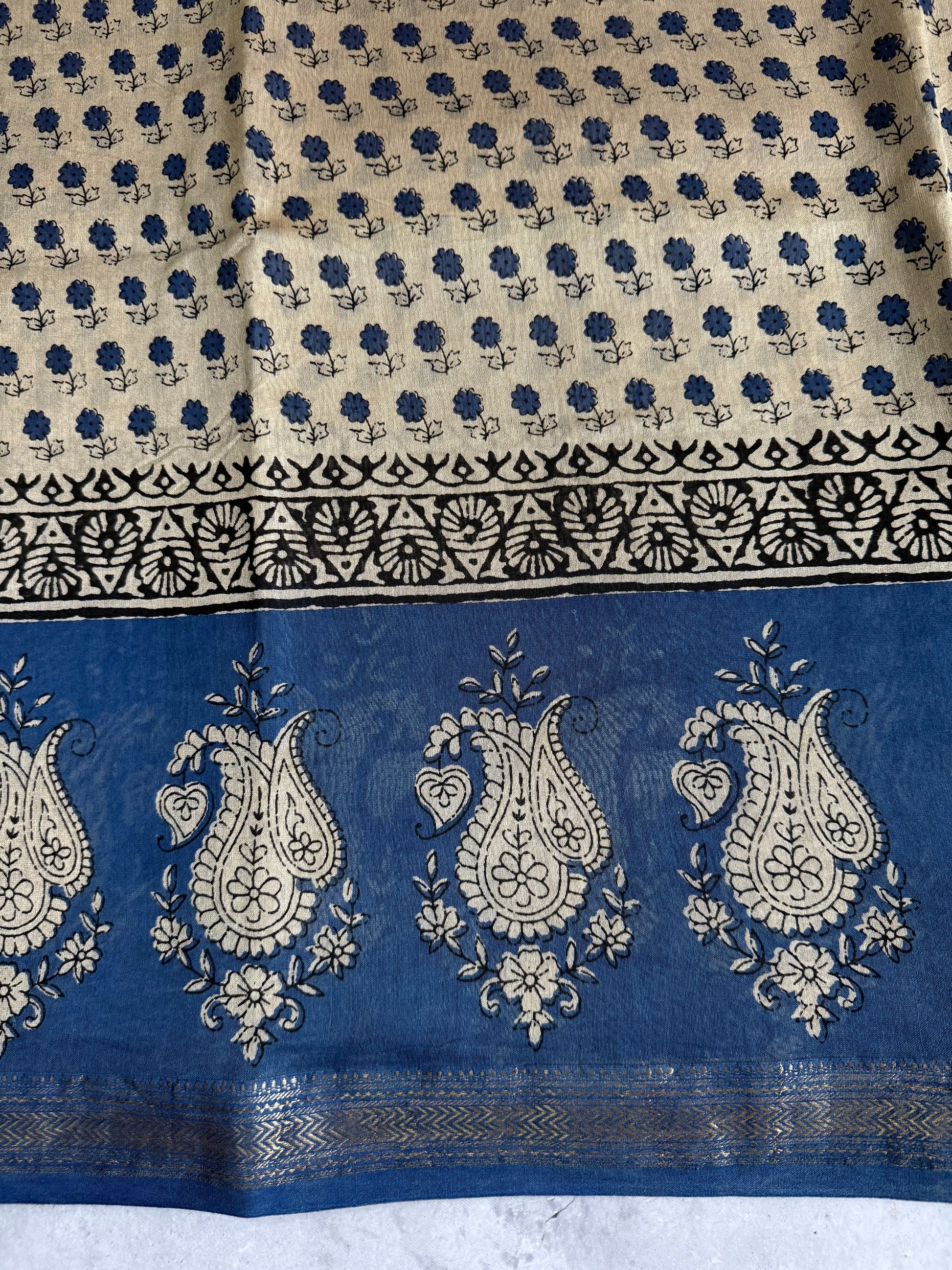 Lepa |Beige and Blue Block Printed Maheshwari Saree