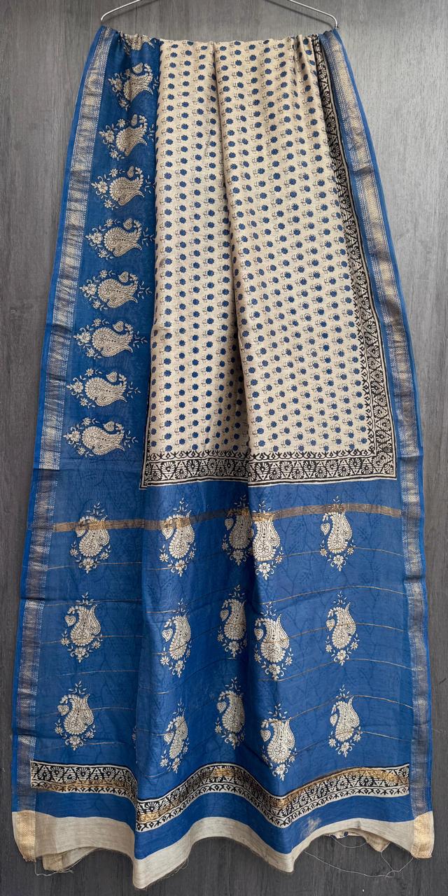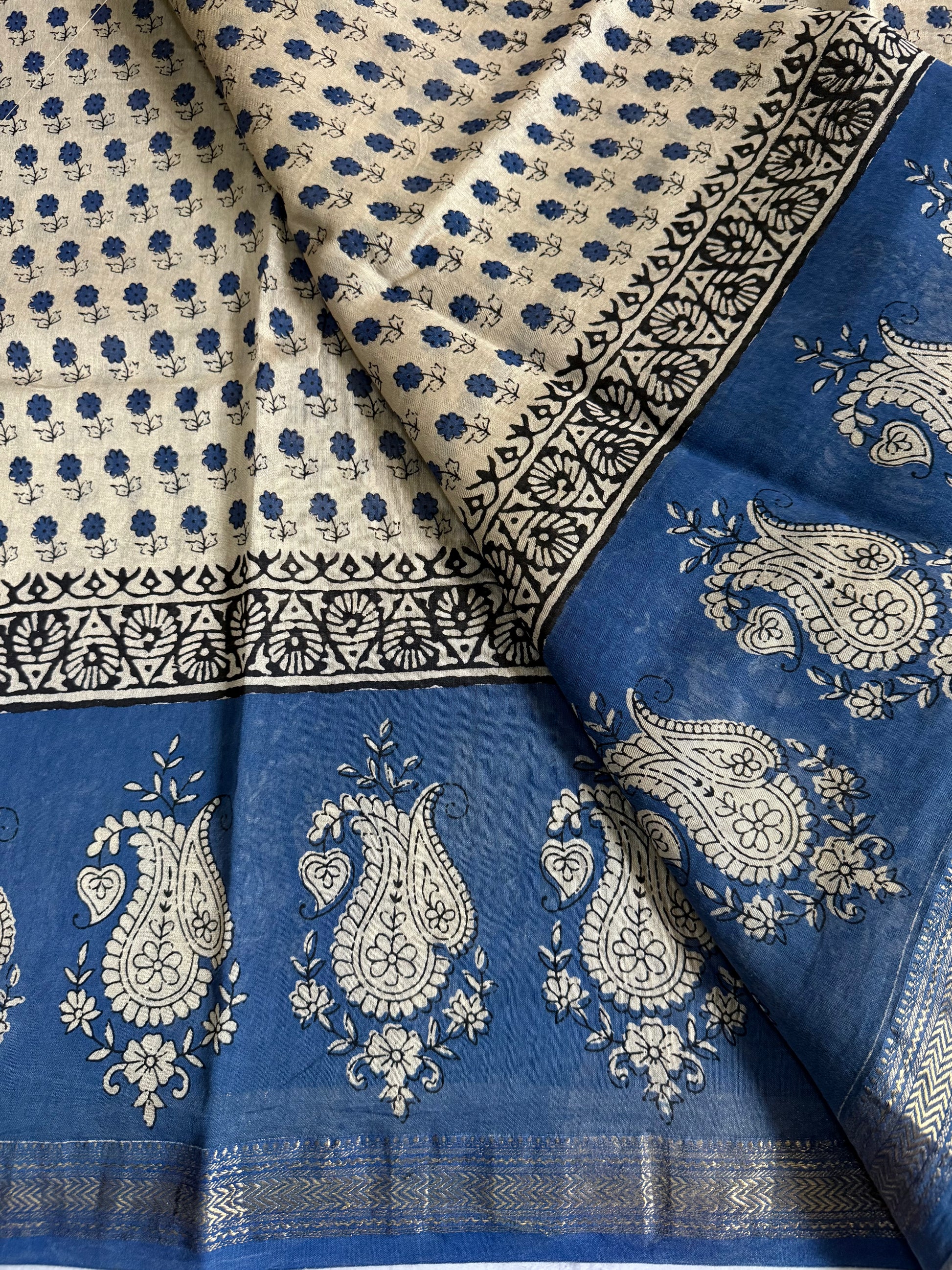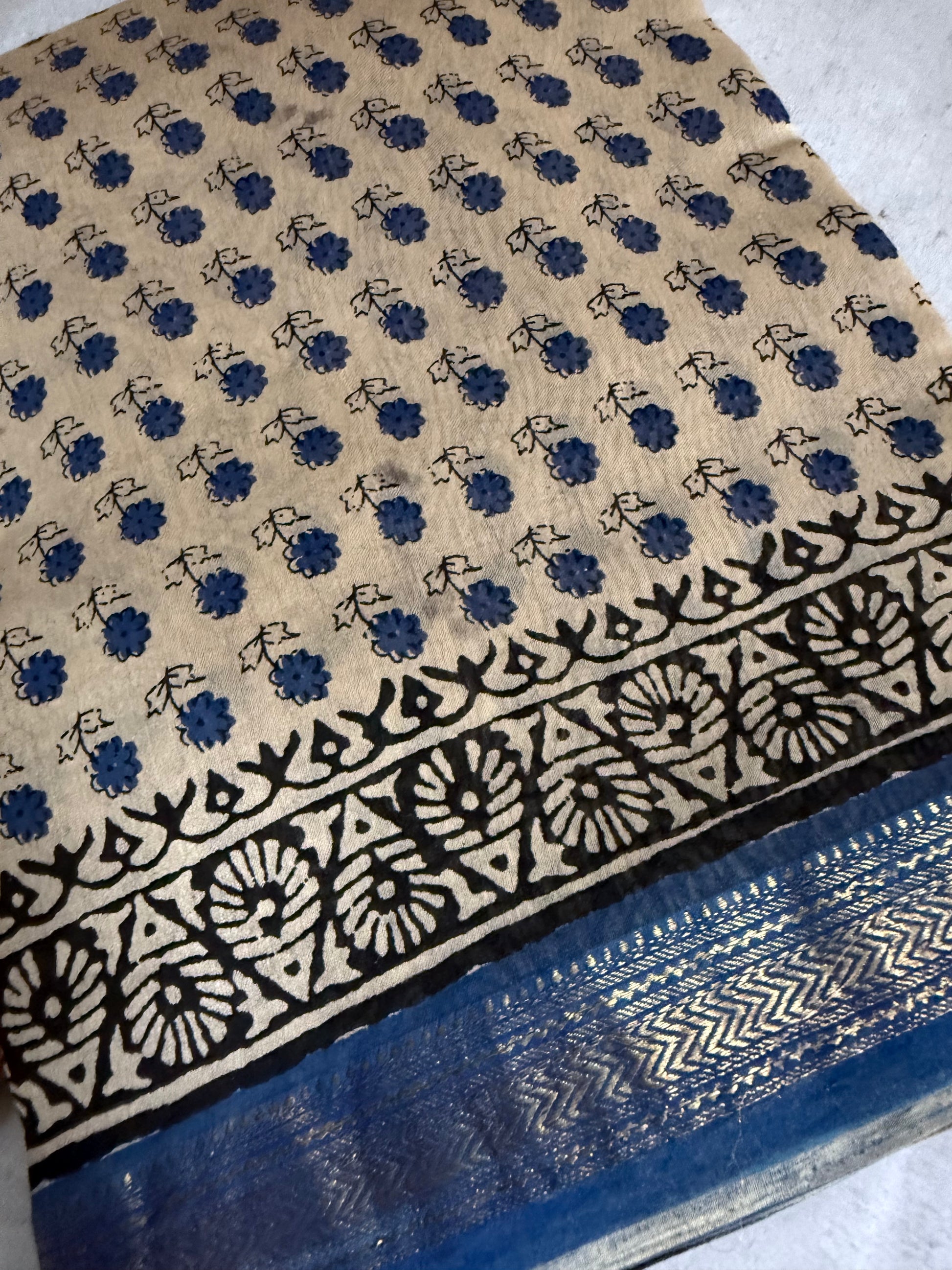 Lepa |Beige and Blue Block Printed Maheshwari Saree