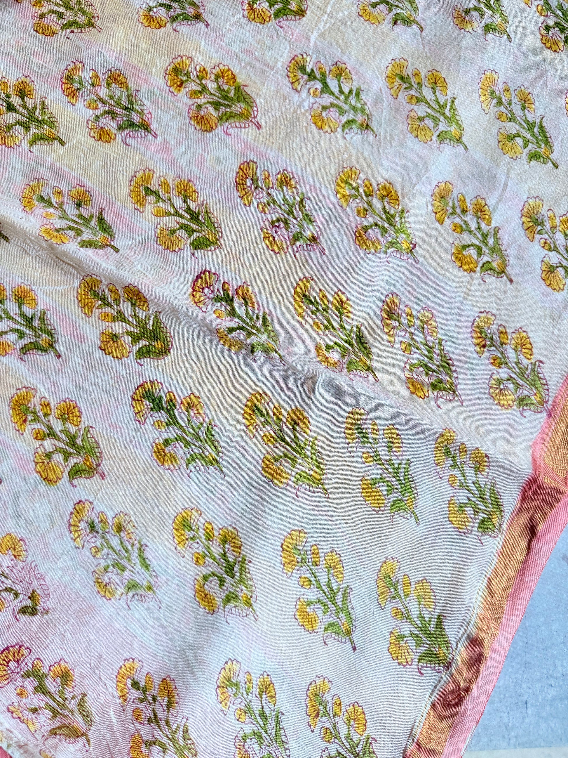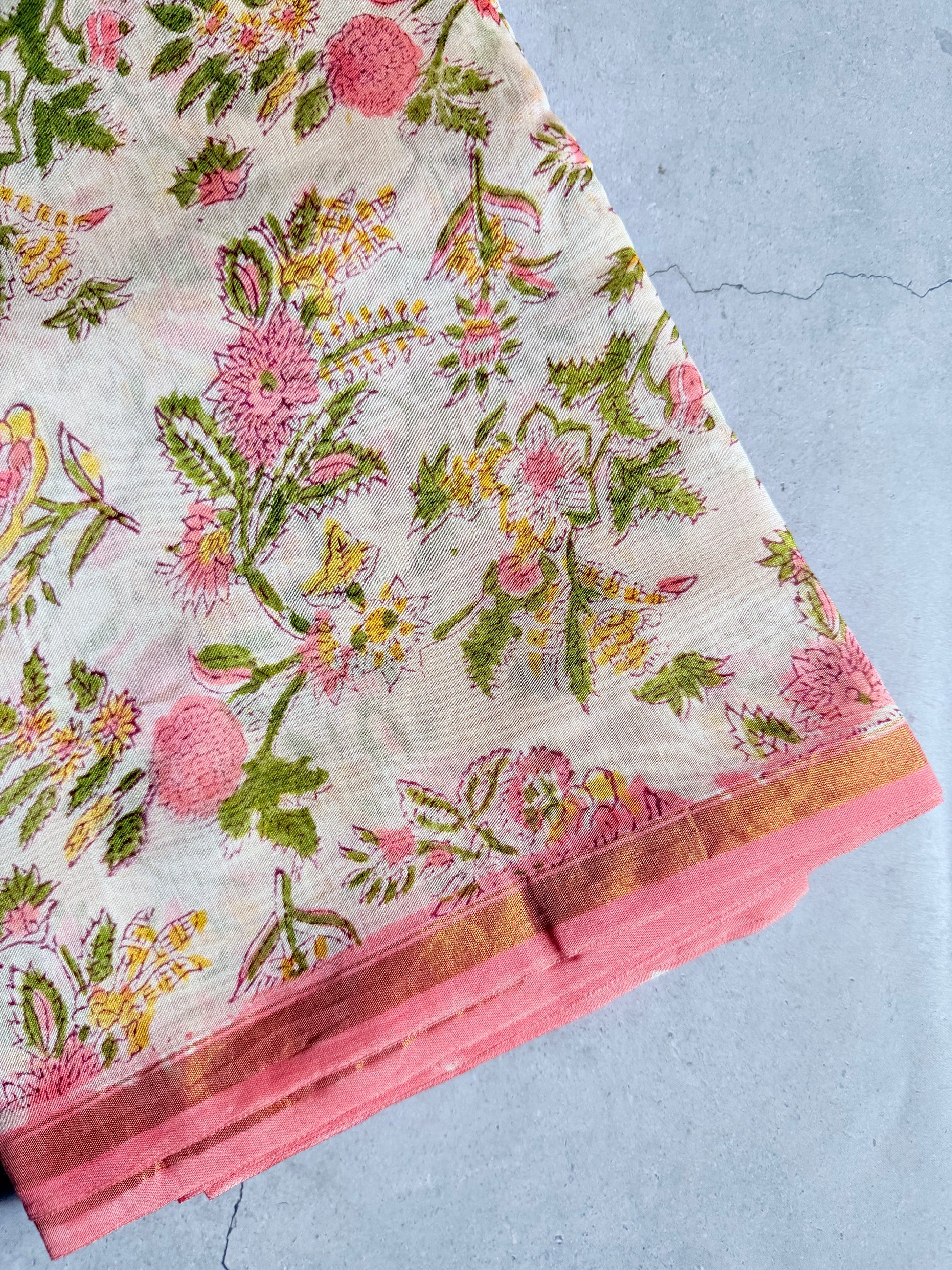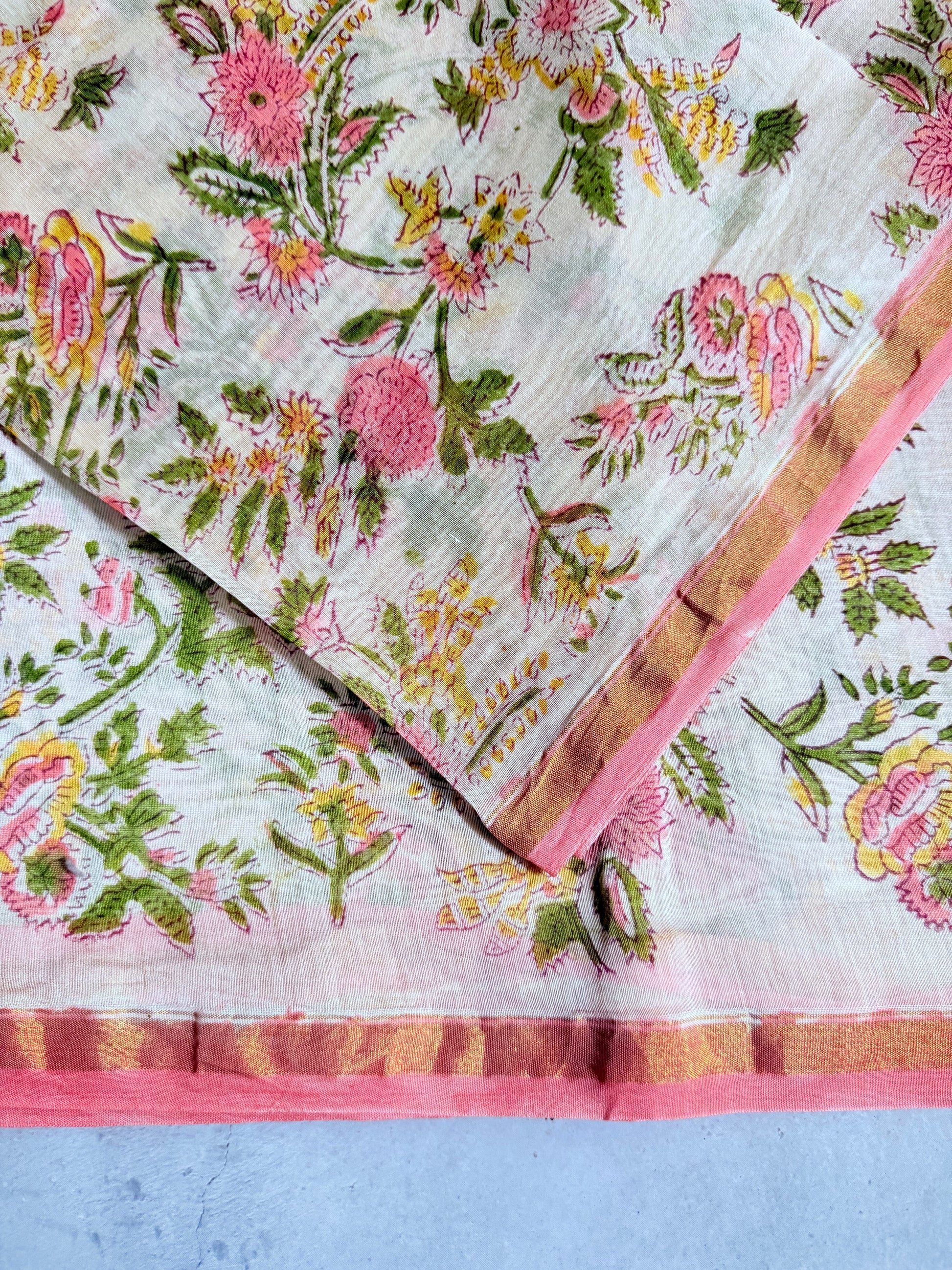 Mallika | Pink and White Floral Block Printed Chanderi Saree