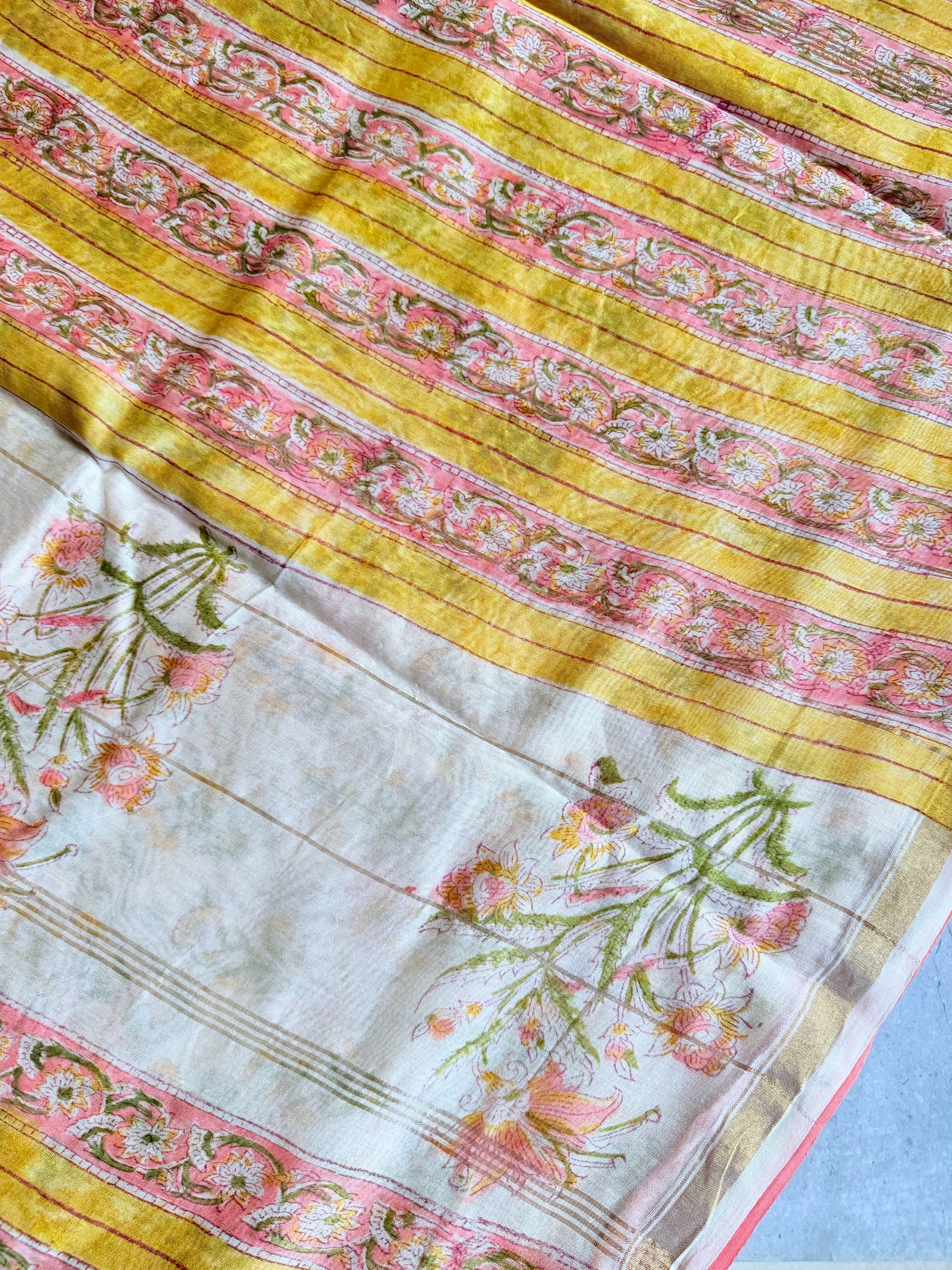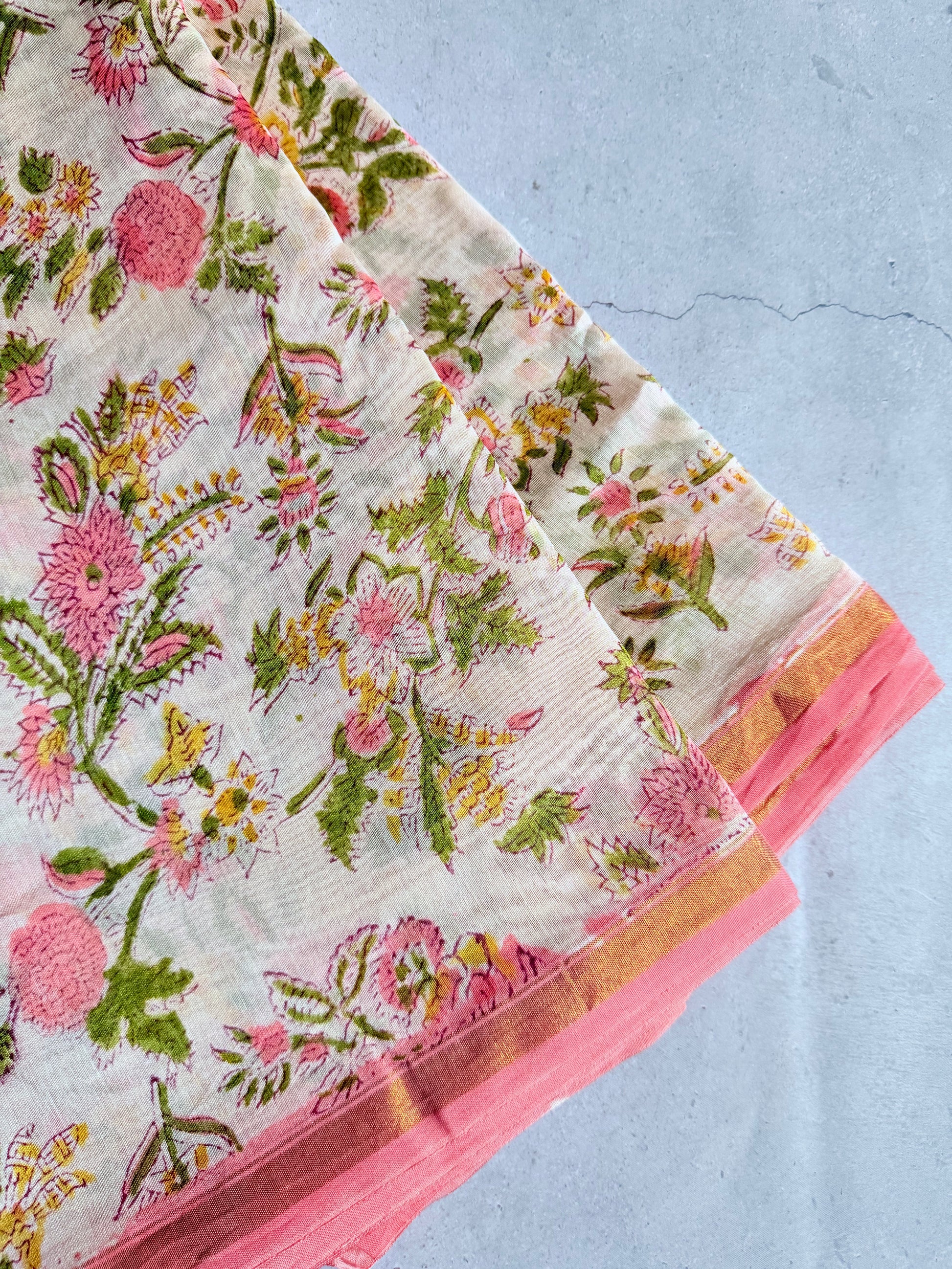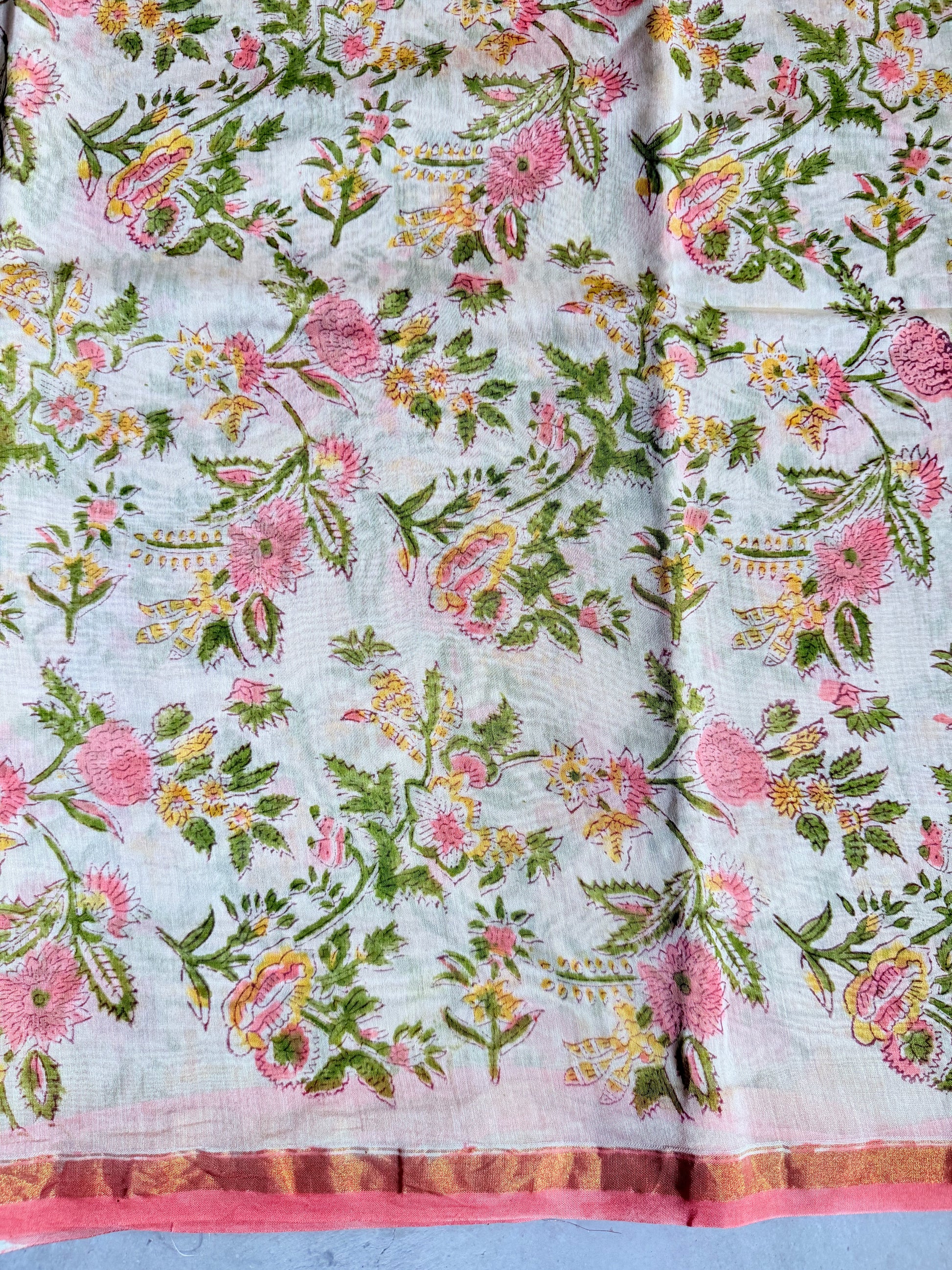 Mallika | Pink and White Floral Block Printed Chanderi Saree