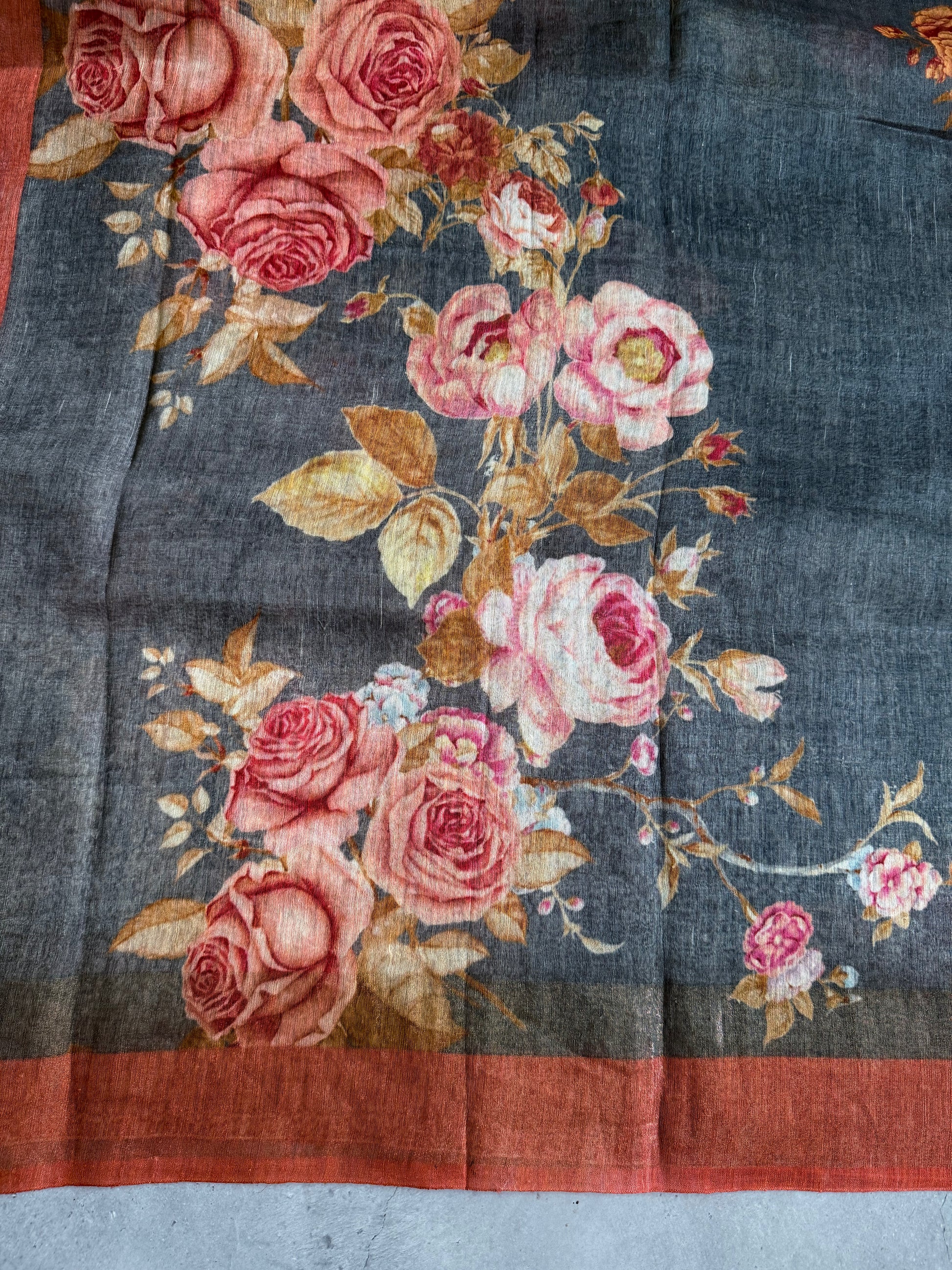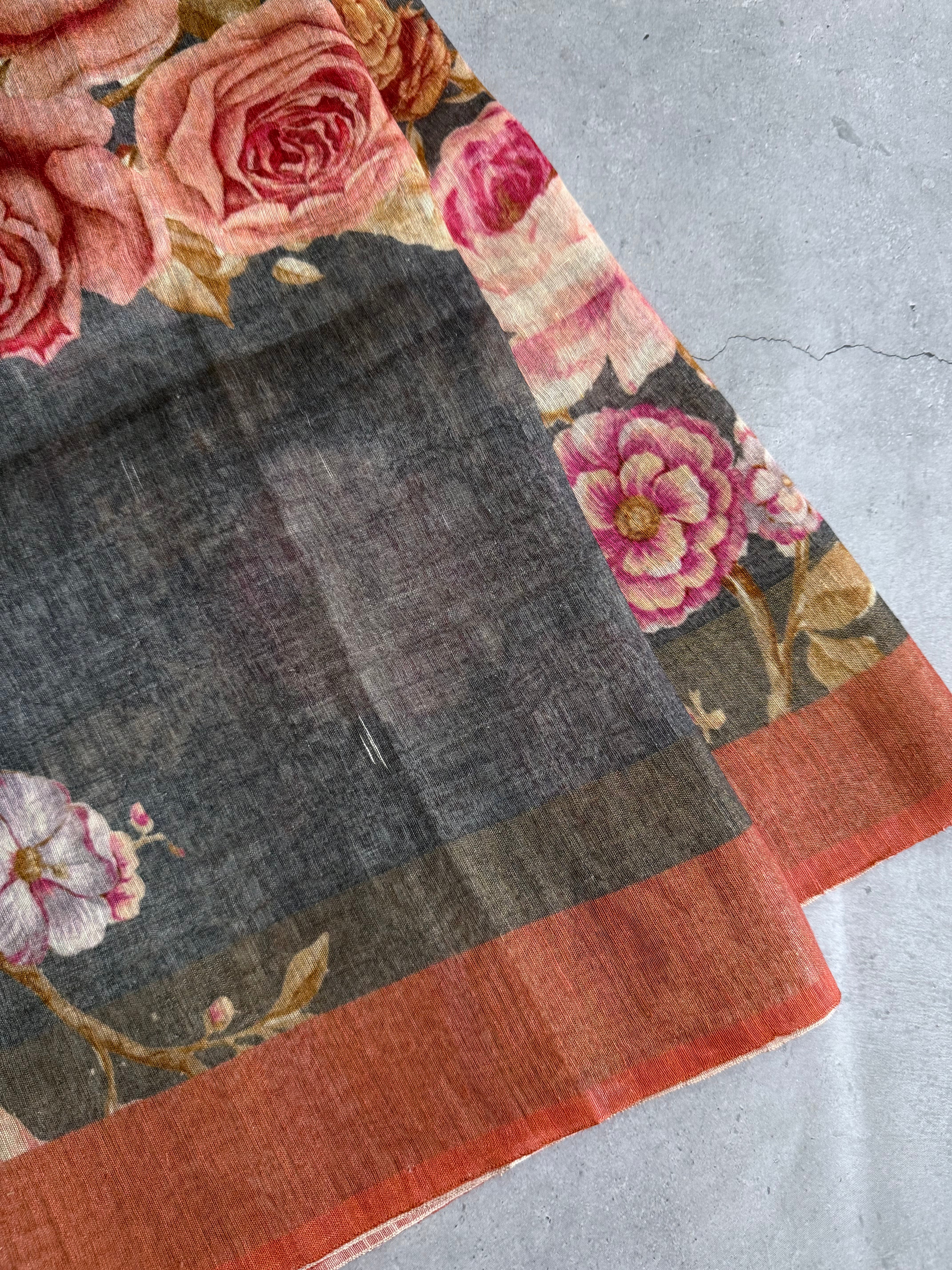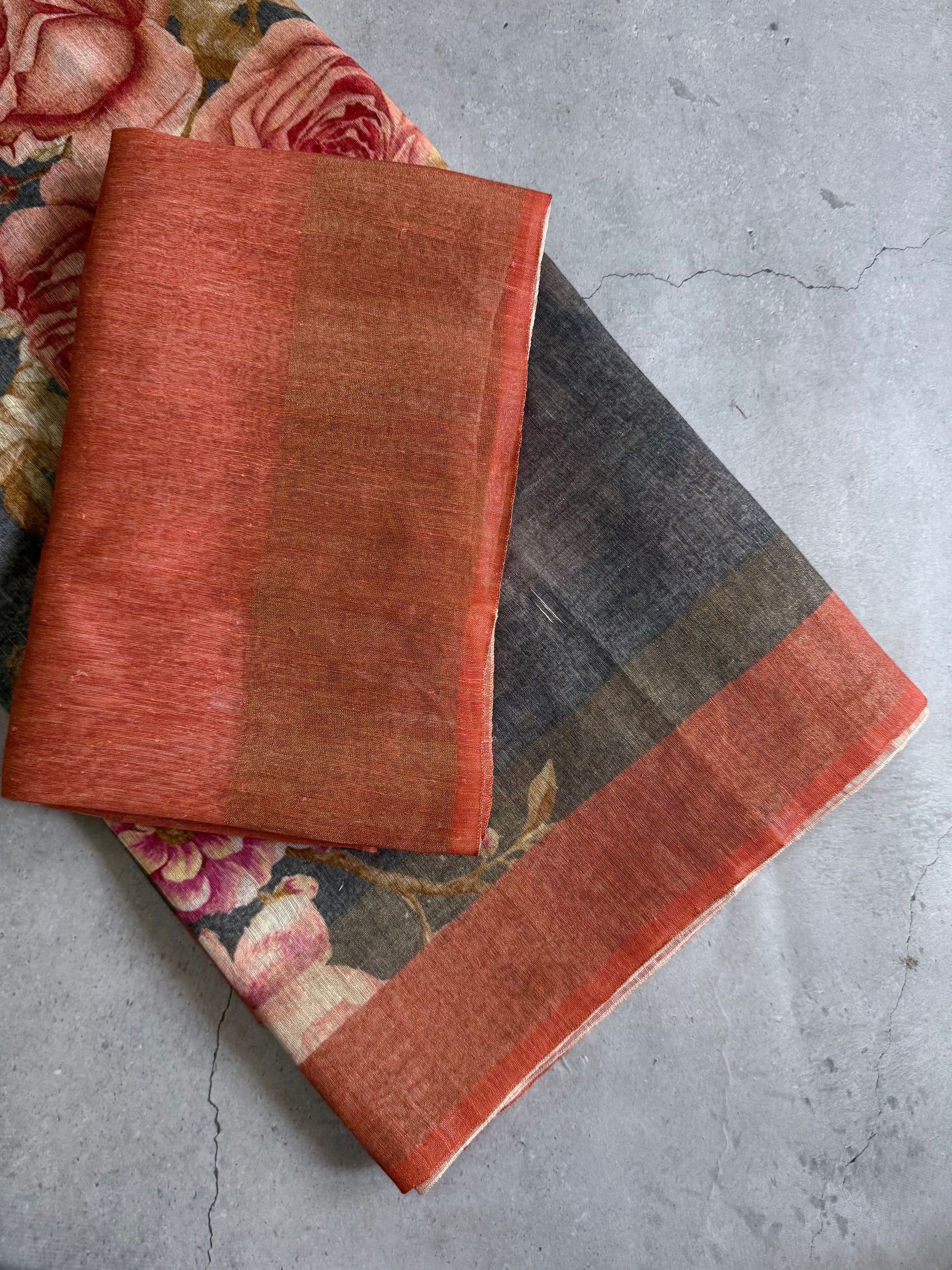 Manjari | Grey and Orange Floral Printed Linen Silk Saree