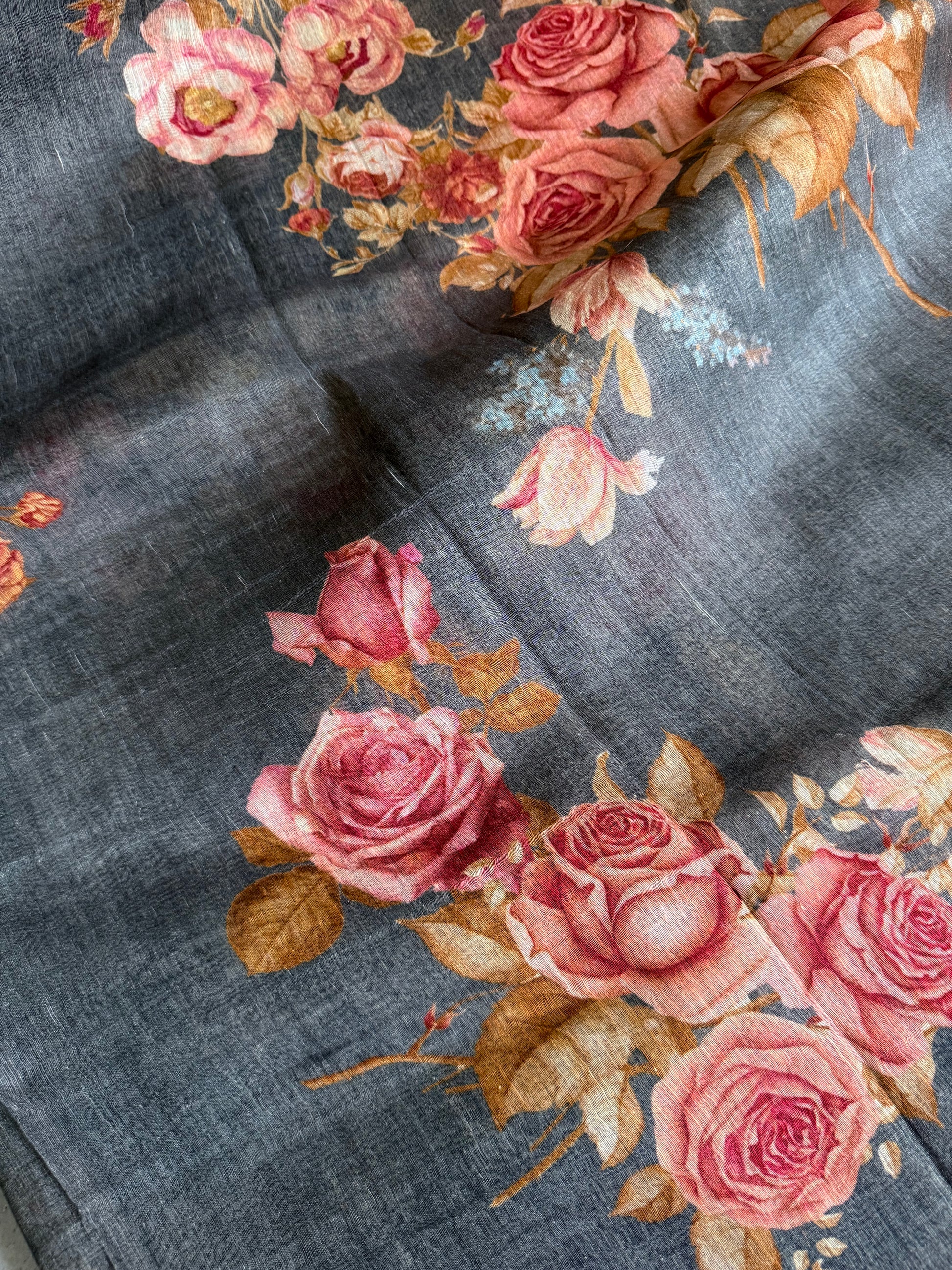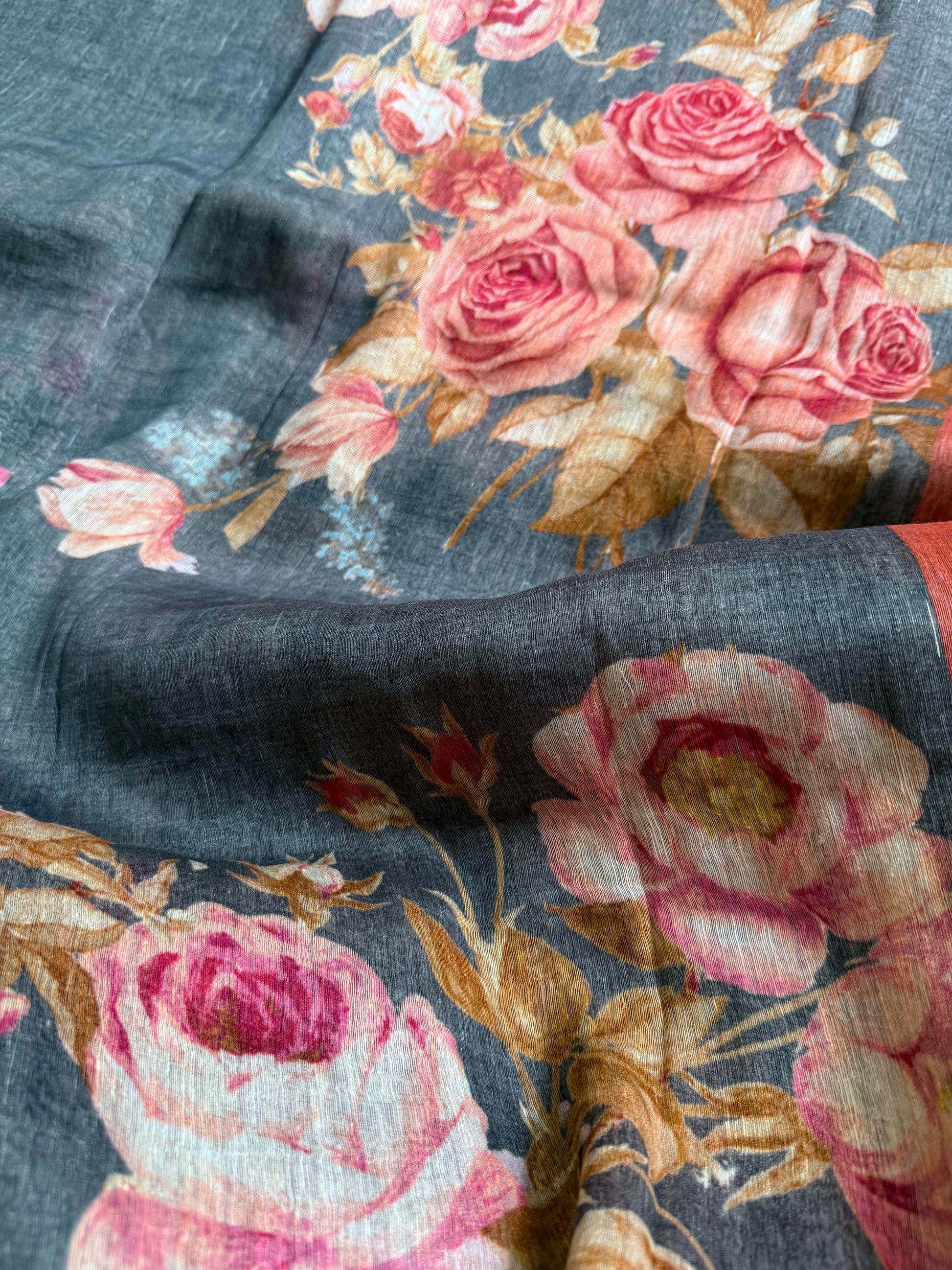 A Grey Floral Digital Printed Silk Linen Saree combines the elegance of silk and linen with modern digital printing technology, creating a stunning fusion of tradition and contemporary style. The saree features vibrant, intricate digital prints of lotus flowers, often in rich red tones, along with complementary colors for a striking visual appeal. The soft, lightweight fabric offers a graceful drape, while the luxurious feel of silk and the breathable texture of linen make it perfect for both day and evening wear. Ideal for festive occasions, weddings, or casual events, this saree exudes sophistication and artistry, adding a touch of elegance to any wardrobe.