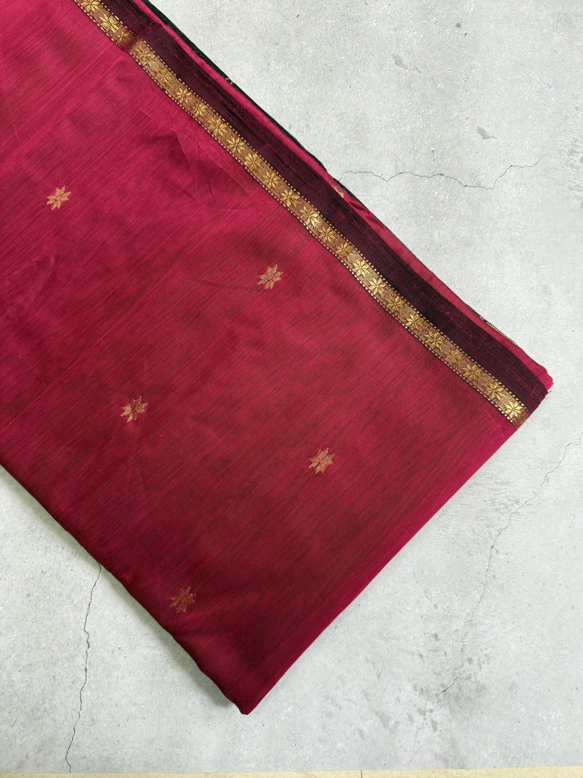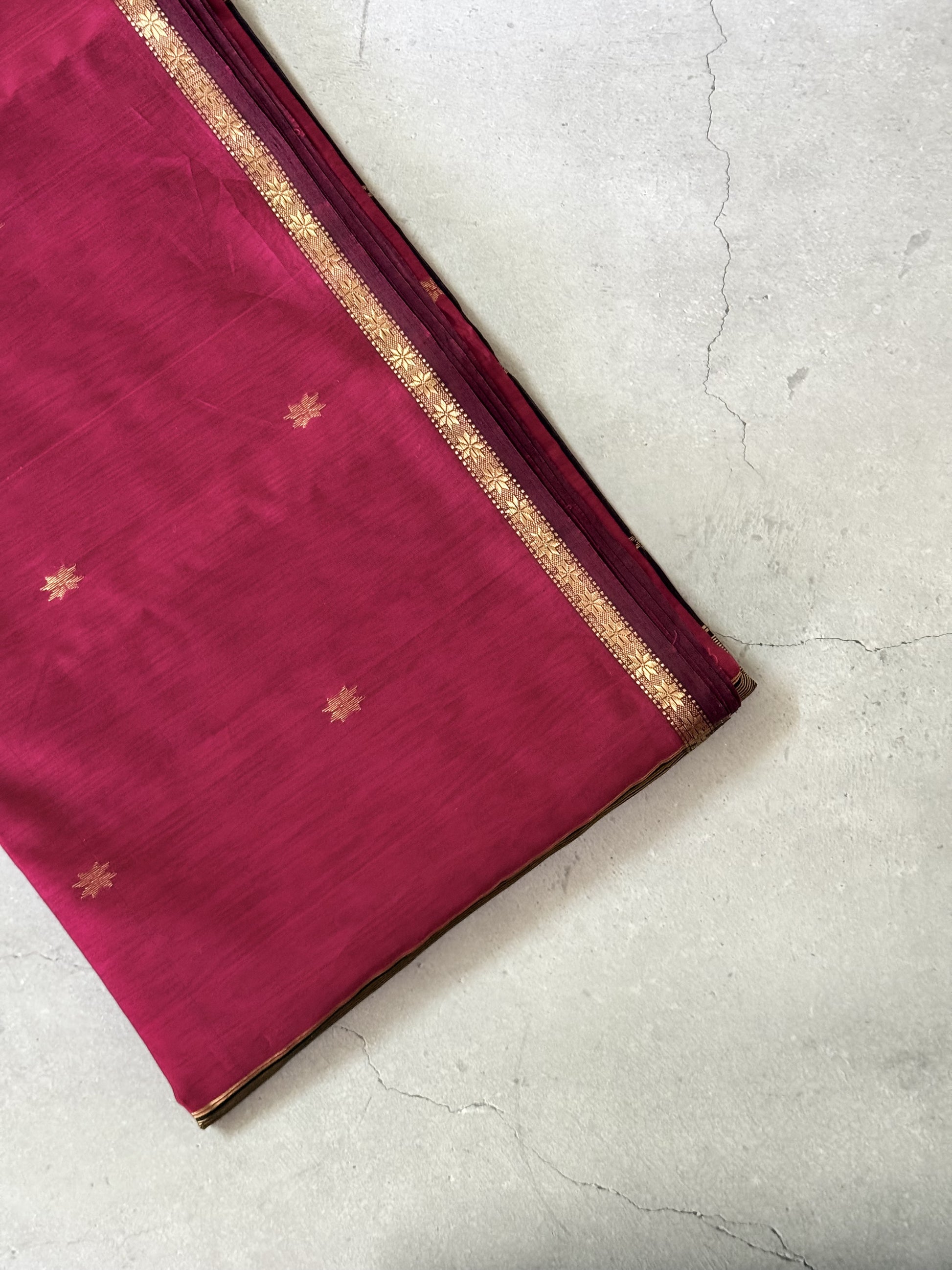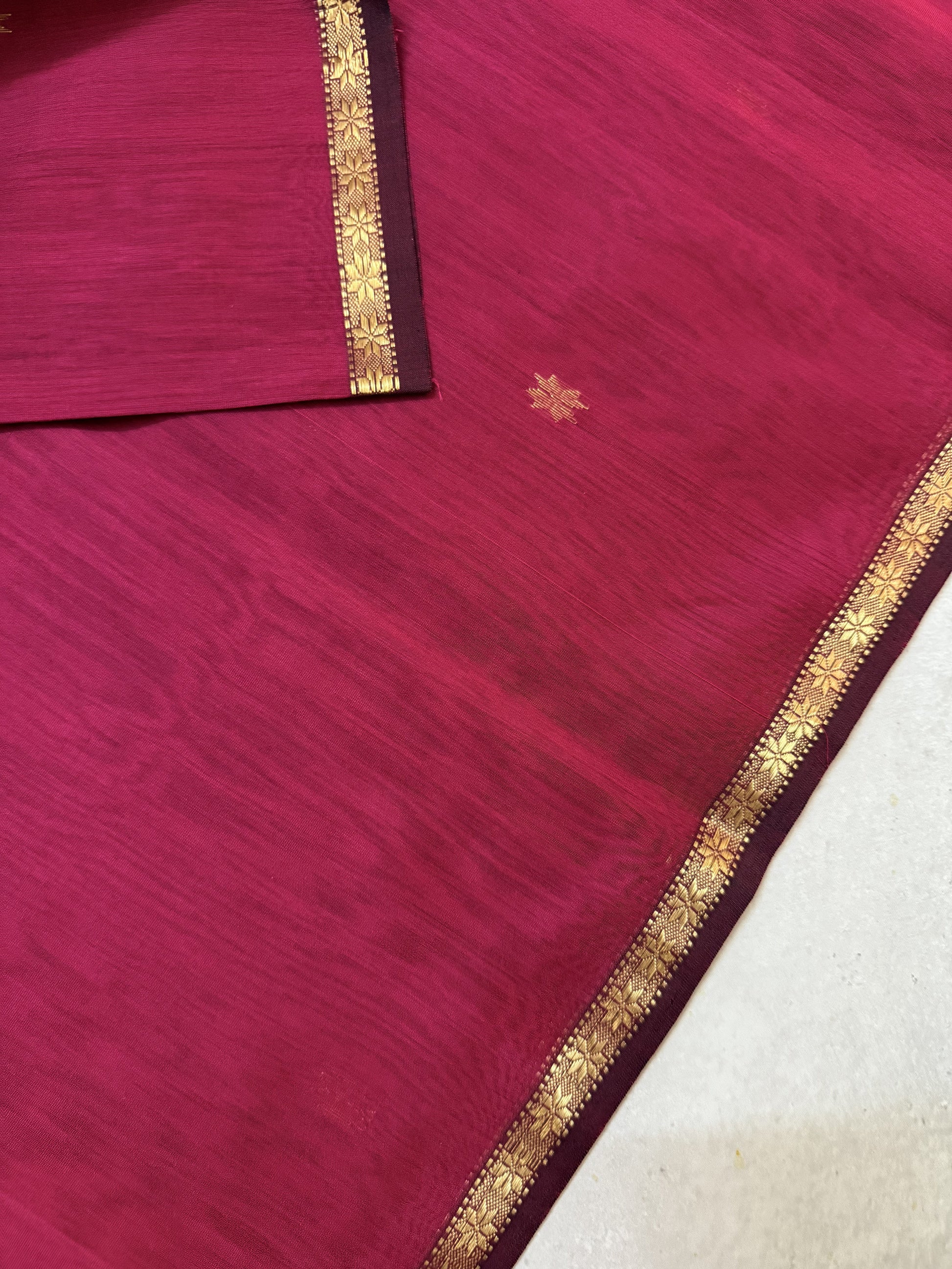 Maheswari Silk Cotton is celebrated for its perfect fusion of sophistication and comfort. The silk lends a rich sheen and graceful drape, while the cotton ensures breathability and softness. The borders, often intricately woven with metallic threads, enhance the saree’s opulence and elegance. This harmonious blend results in a visually stunning fabric that seamlessly merges traditional charm with contemporary appeal, making it perfect for both festive occasions and refined daily wear.