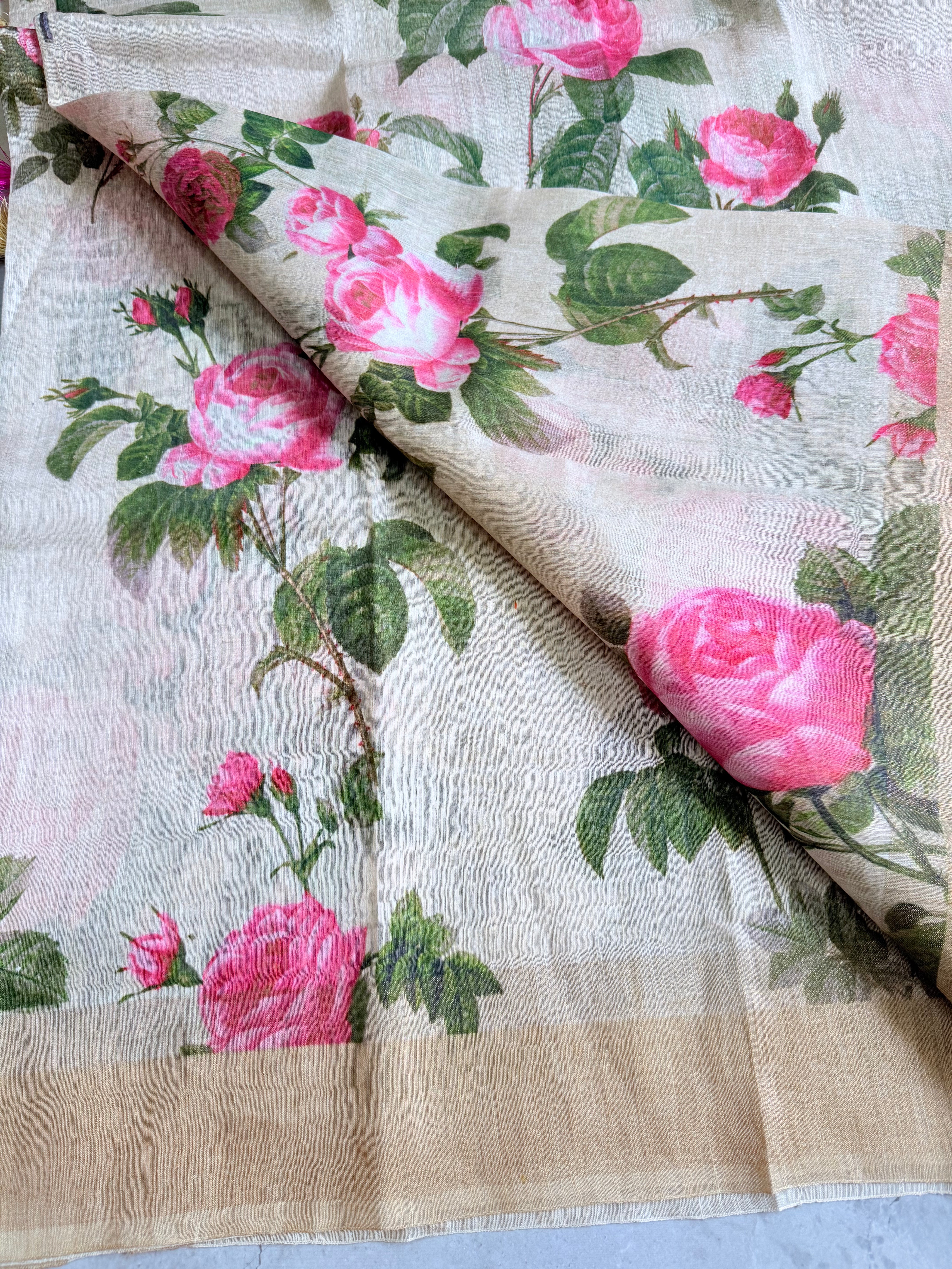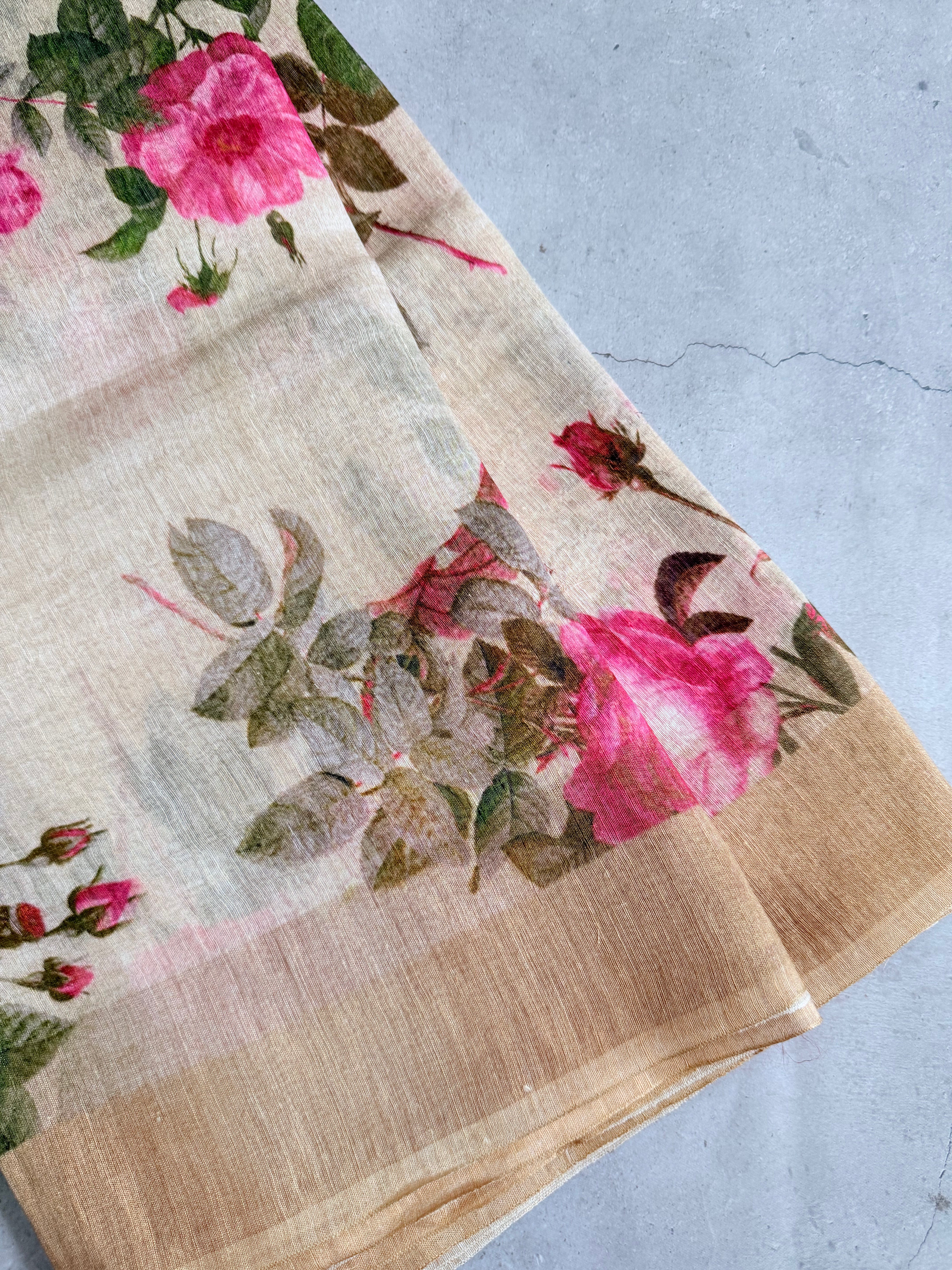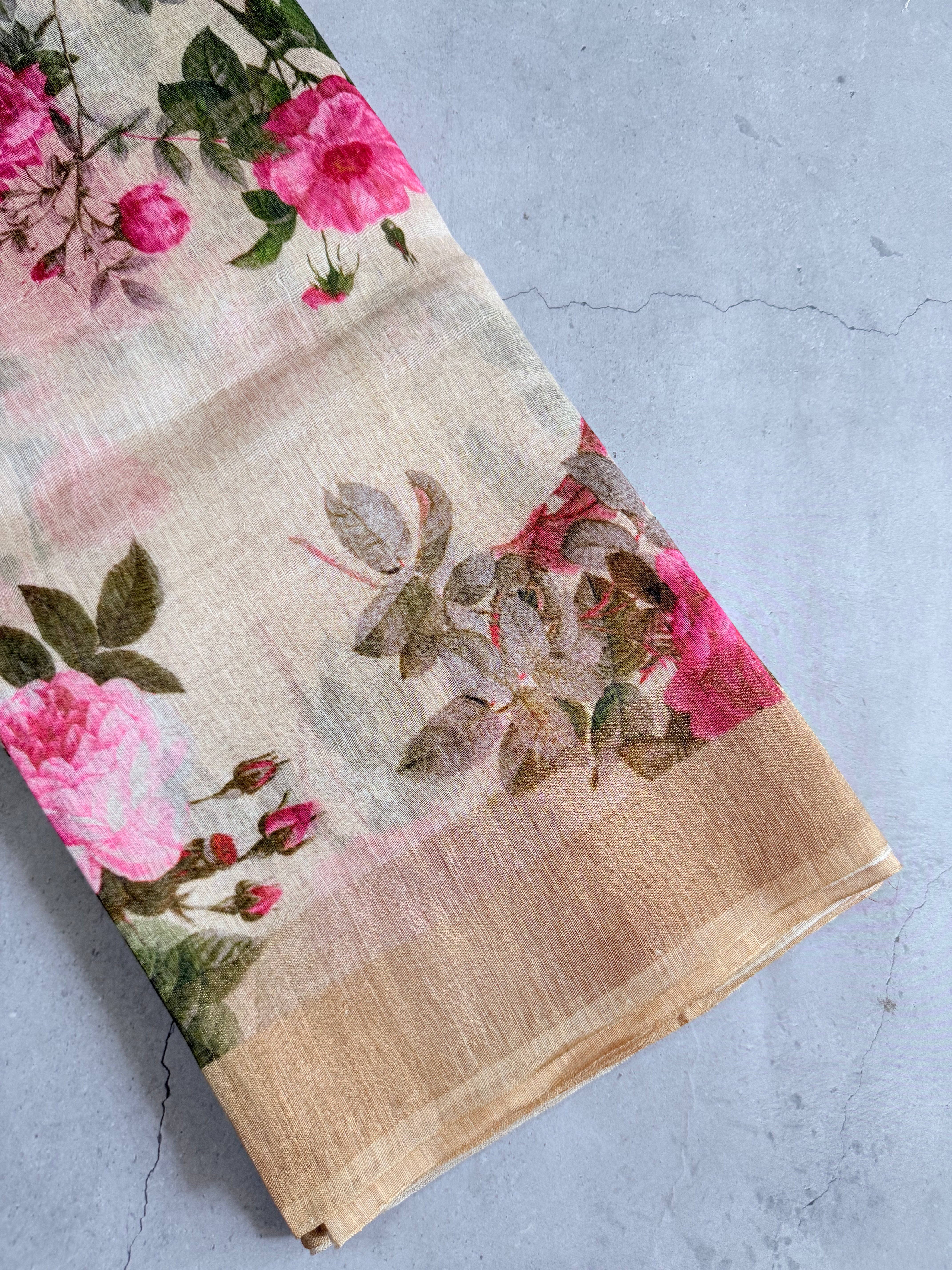 Mridula | Beige and Pink Floral Printed Linen Silk Saree