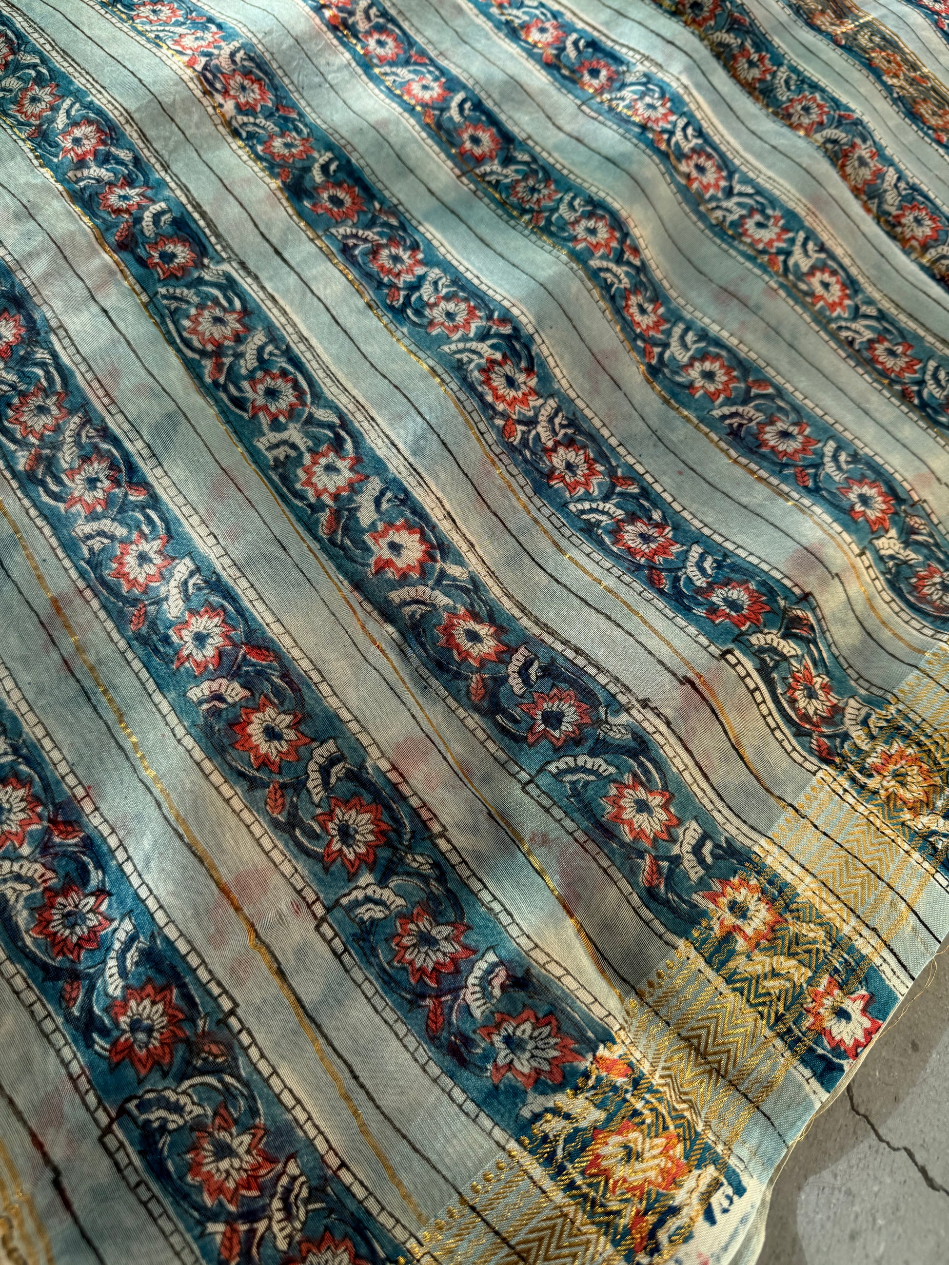 Woven in the heart of Madhya Pradesh, Maheshwari weaves are known for their fine texture, delicate zari borders, and subtle sheen. This saree is adorned with hand-block printed motifs using traditional techniques, making each piece truly unique.