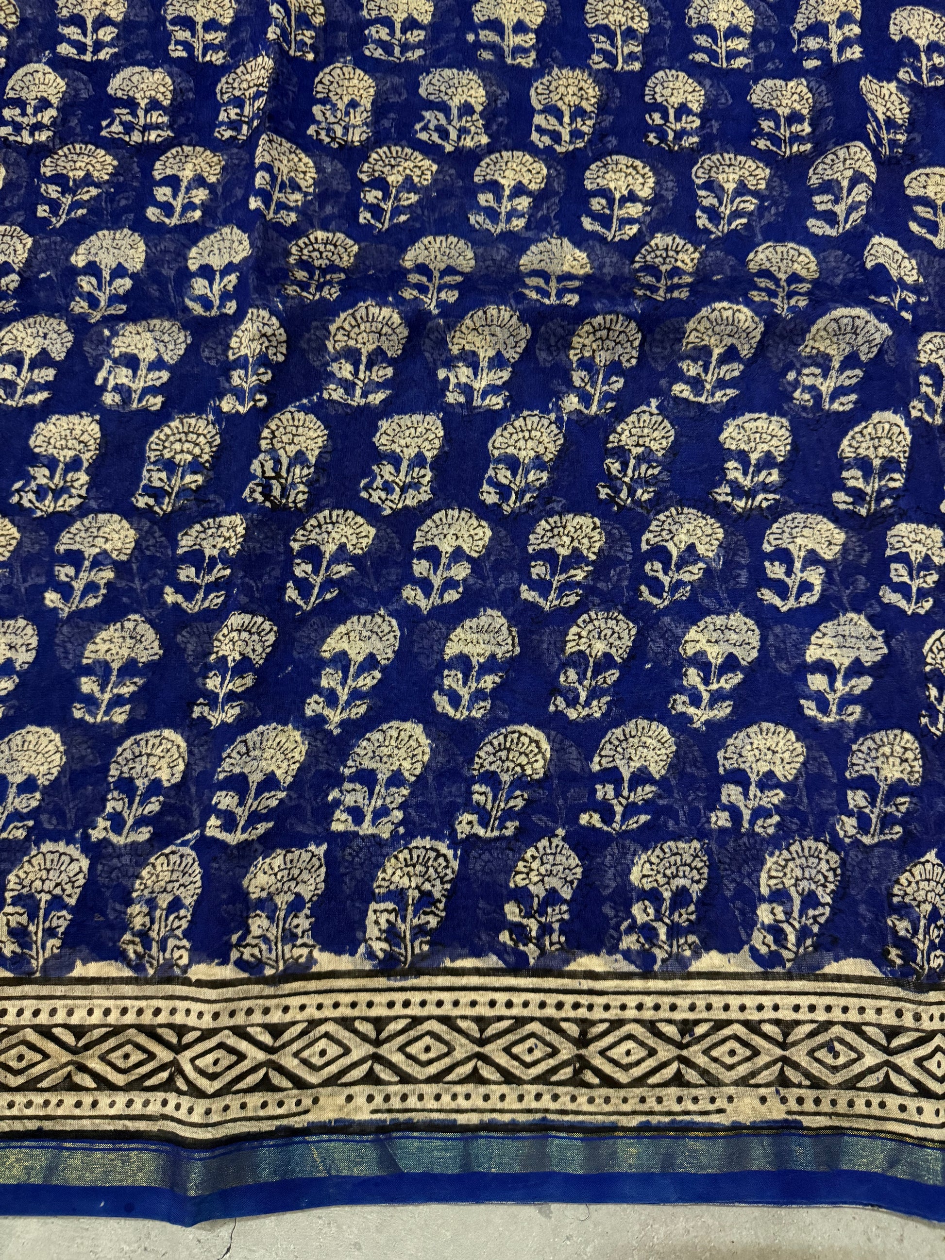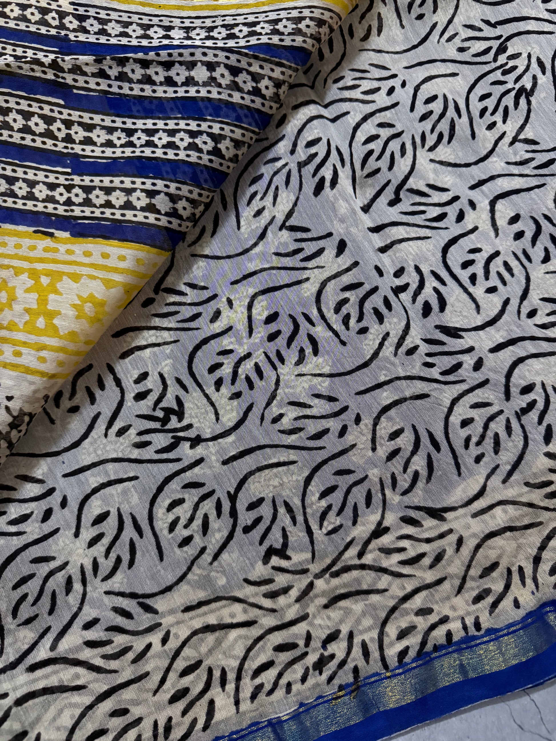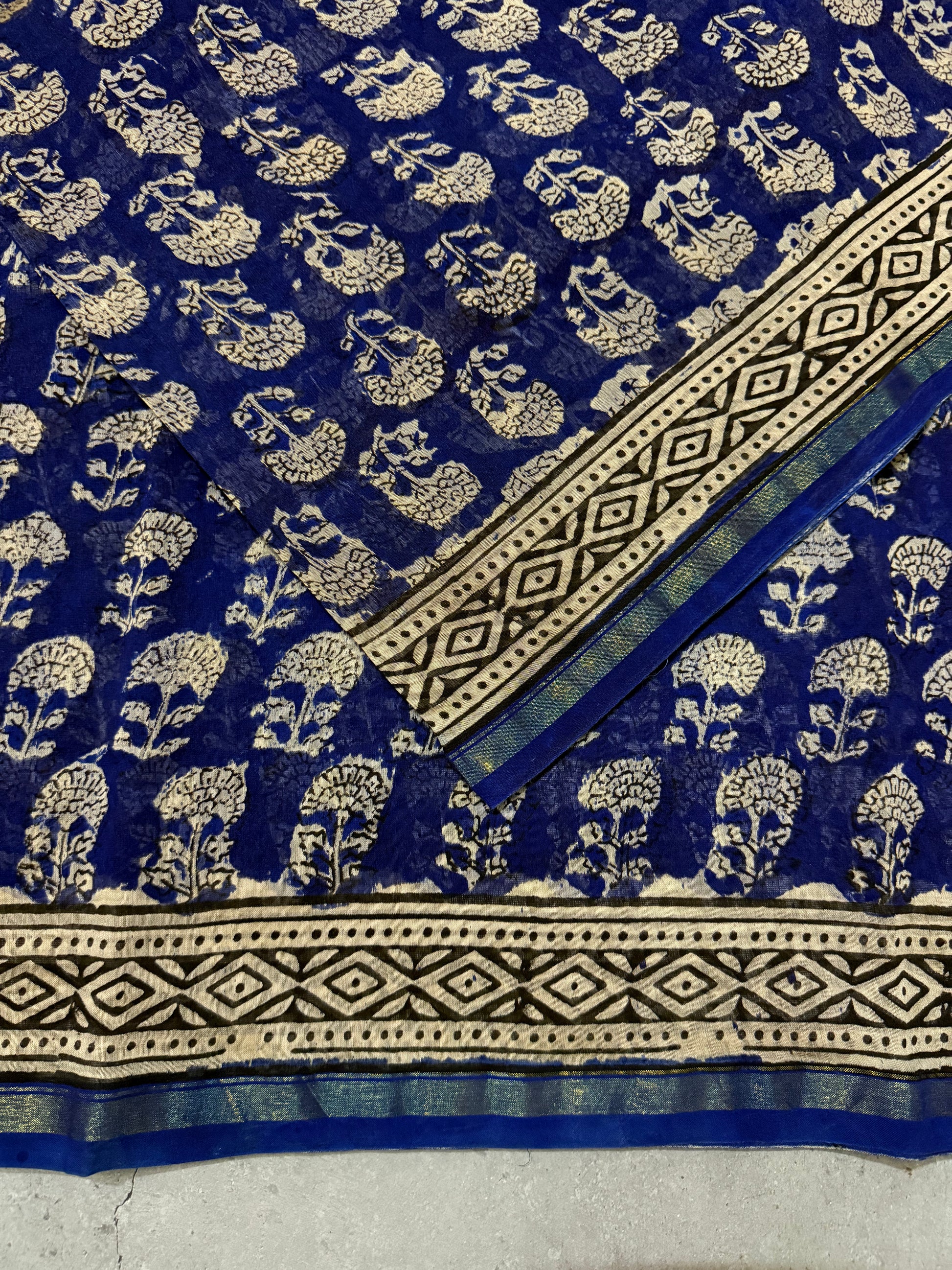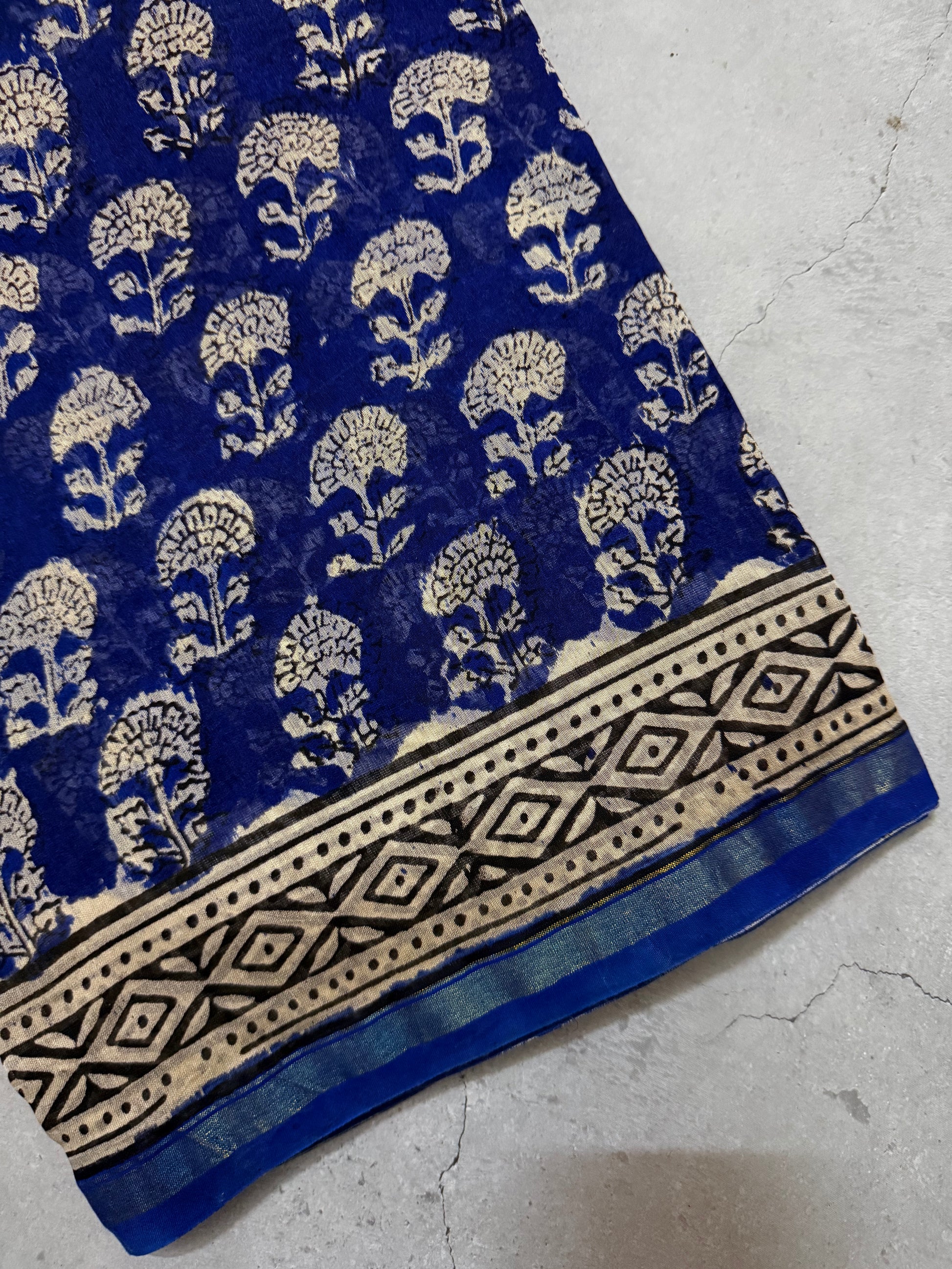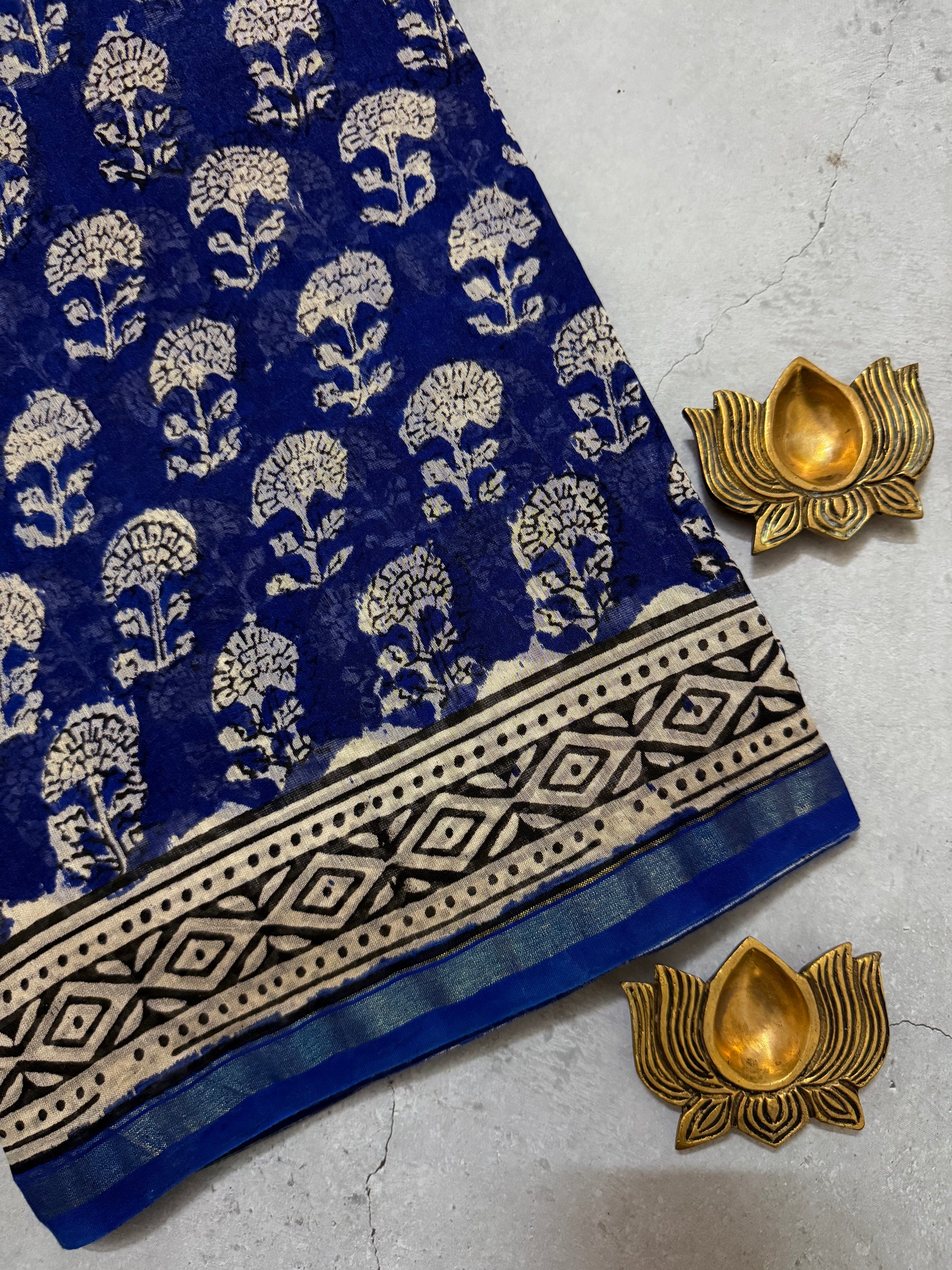 Oorja | Ink Blue and Yellow Floral Block Printed Chanderi Saree