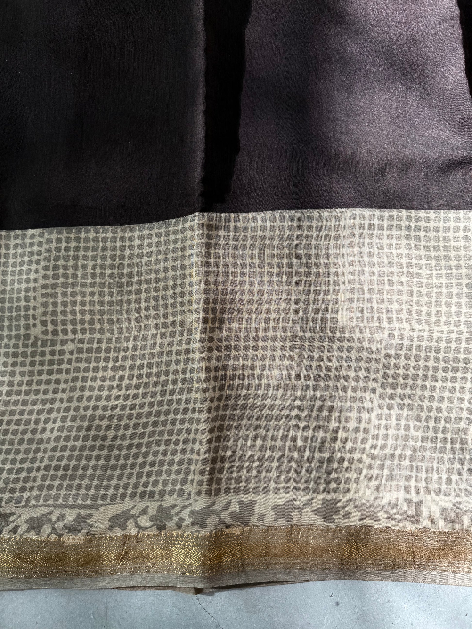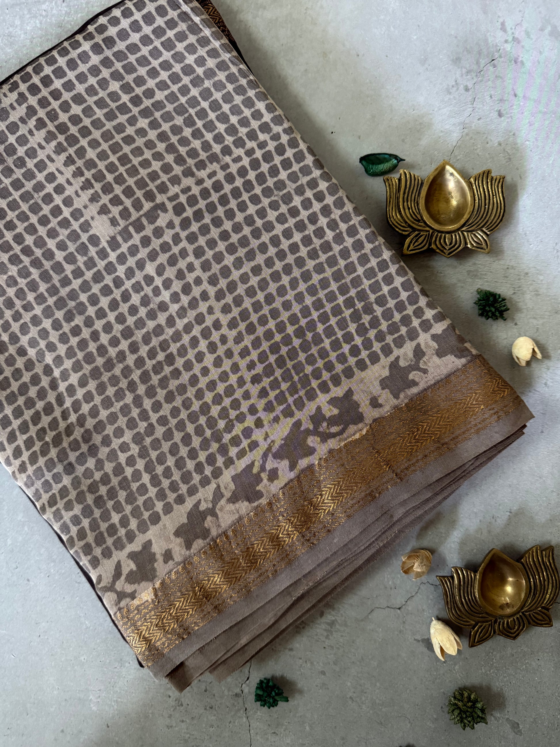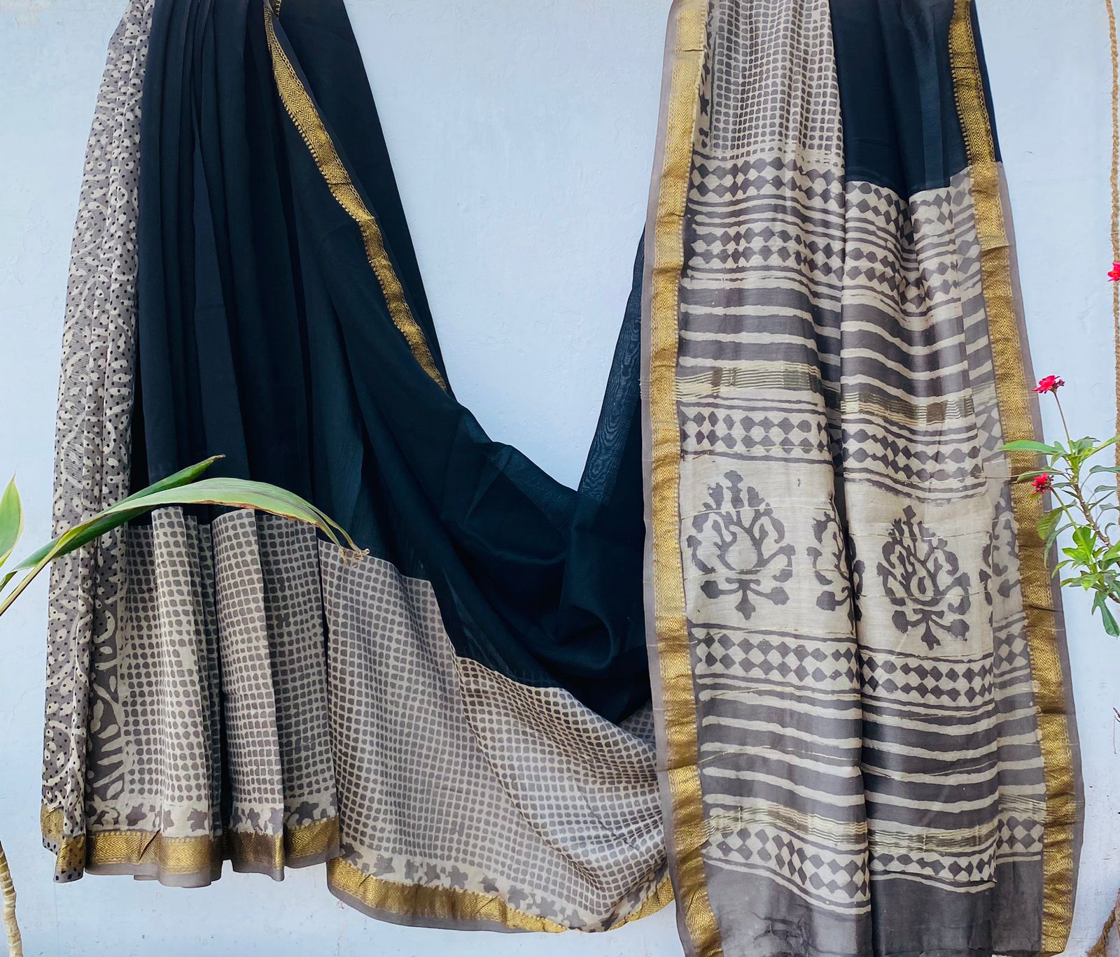 Parijna| Grey and Black Block Printed Maheshwari Saree