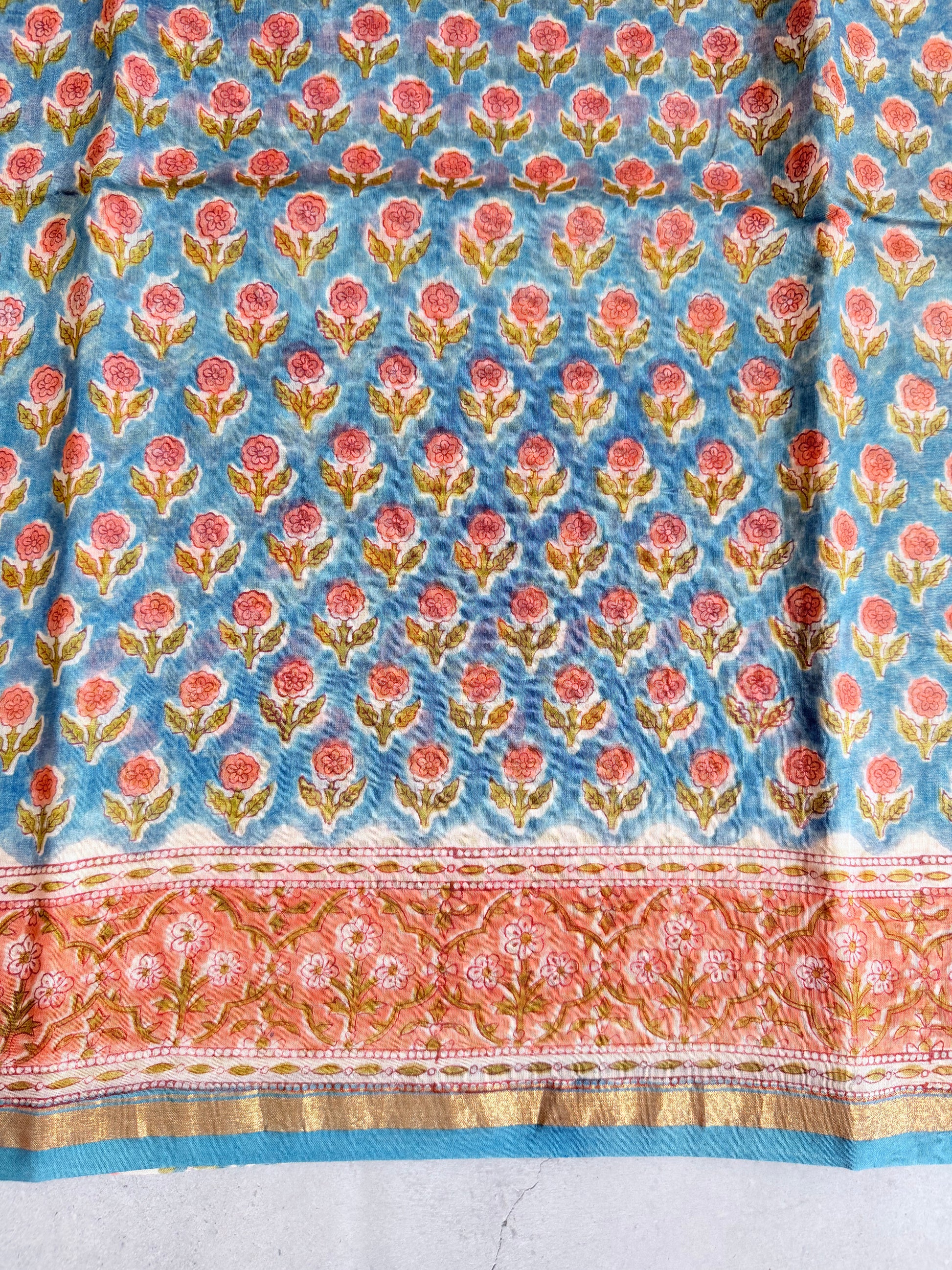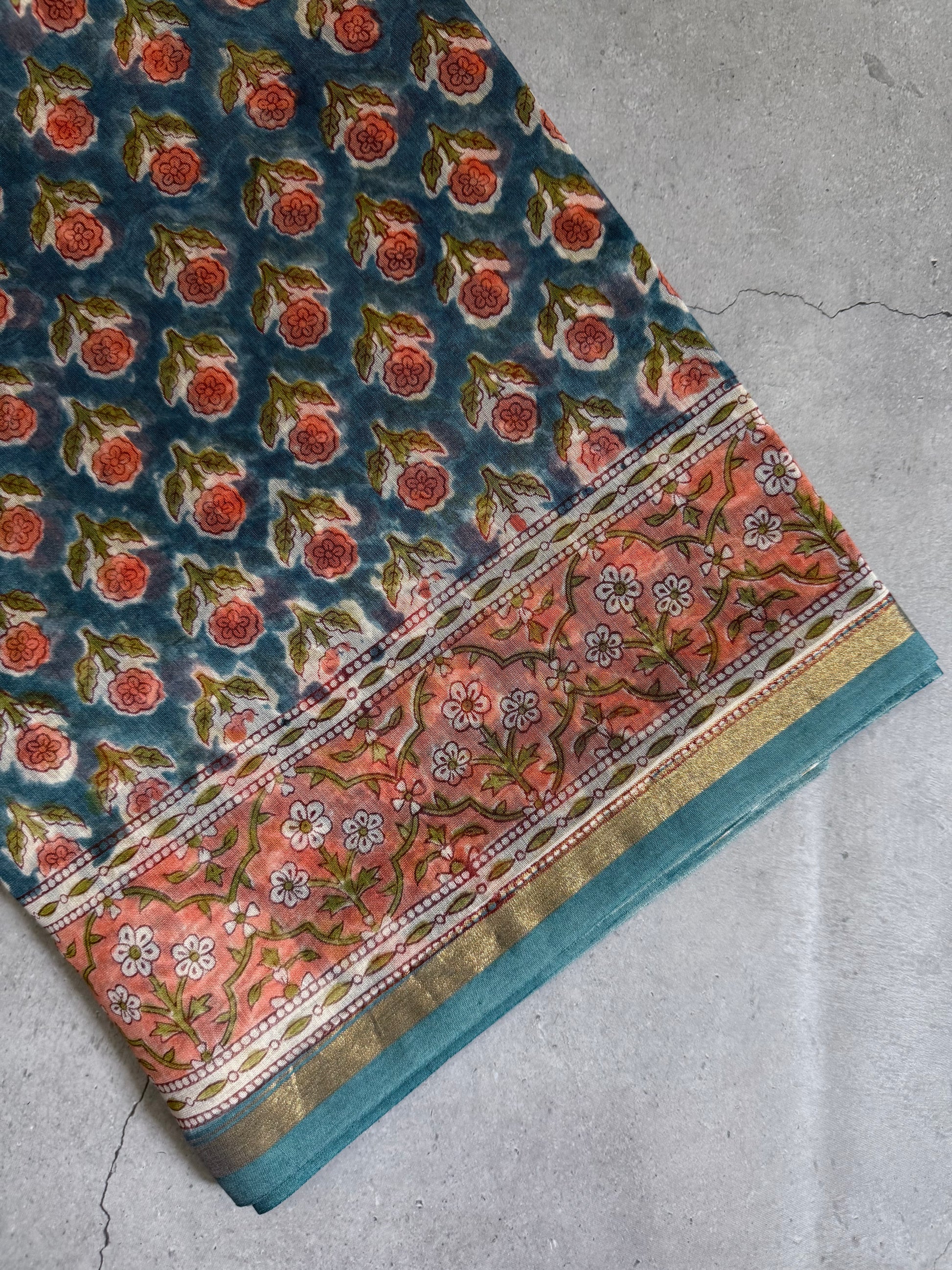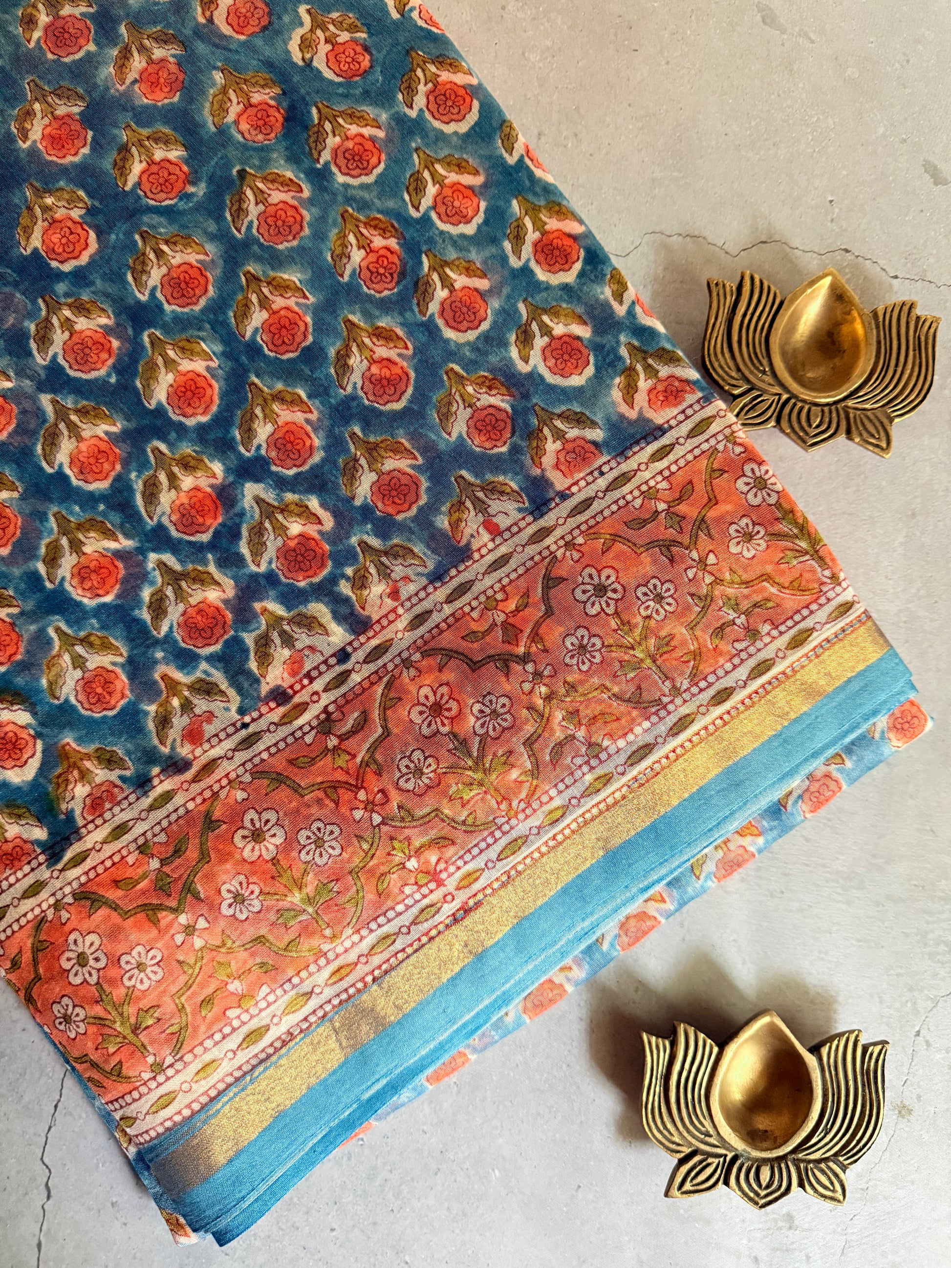 Prathika | Blue and Coral Floral Block Printed Chanderi Saree