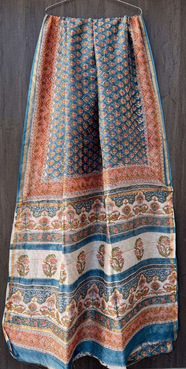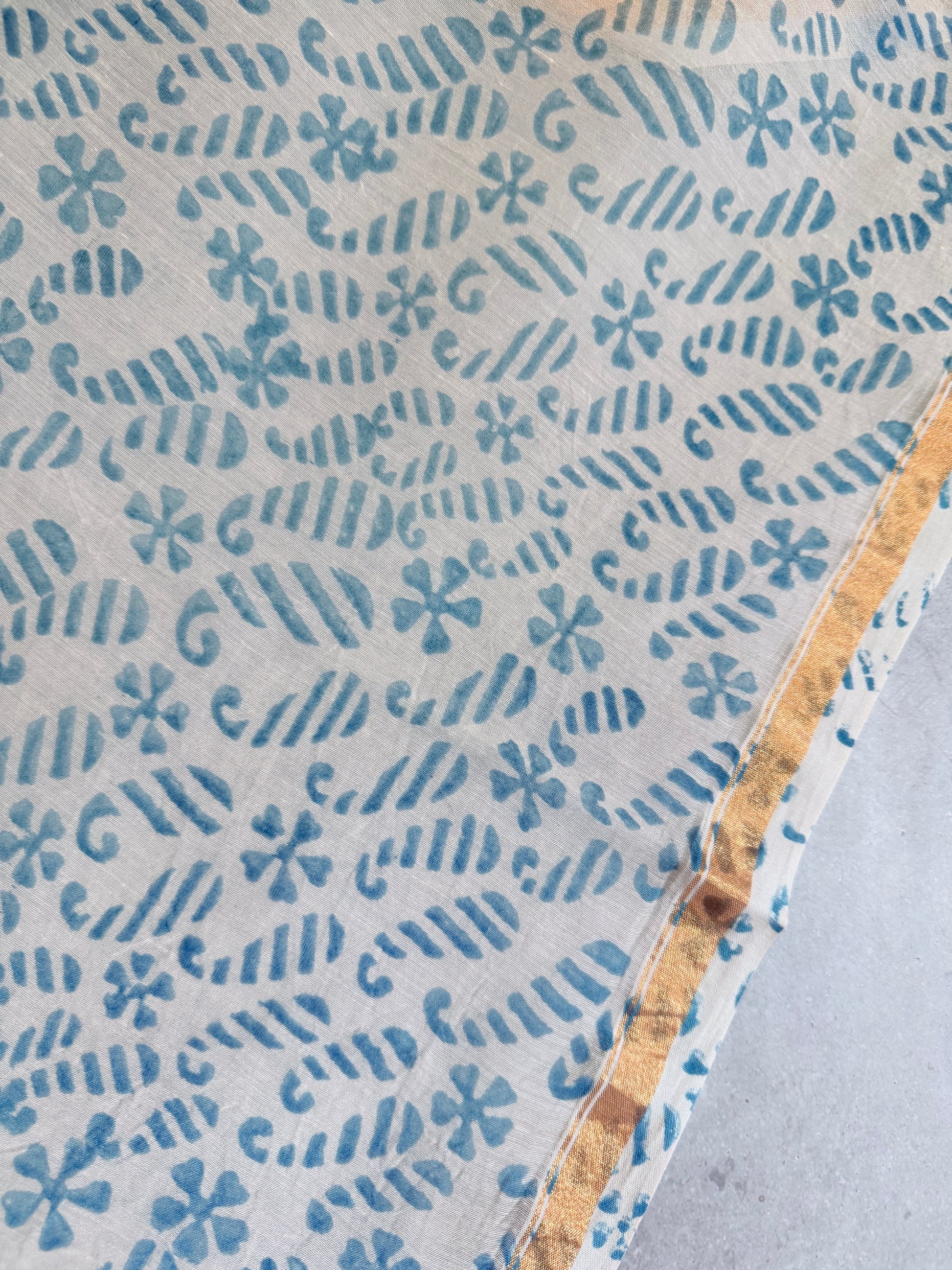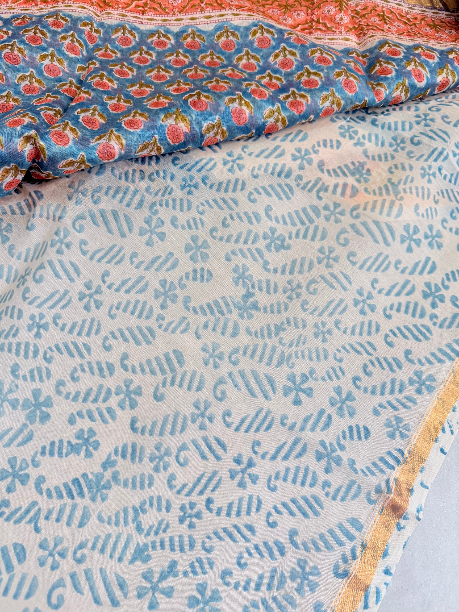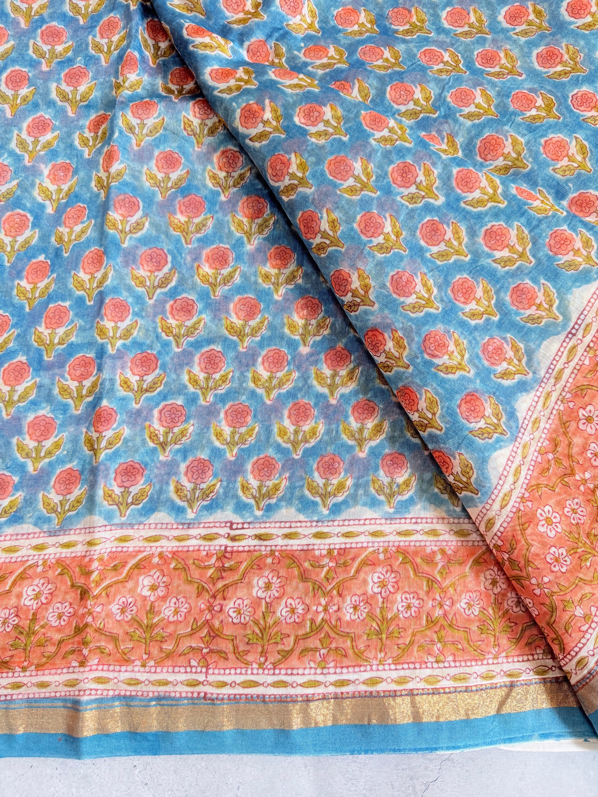 Prathika | Blue and Coral Floral Block Printed Chanderi Saree