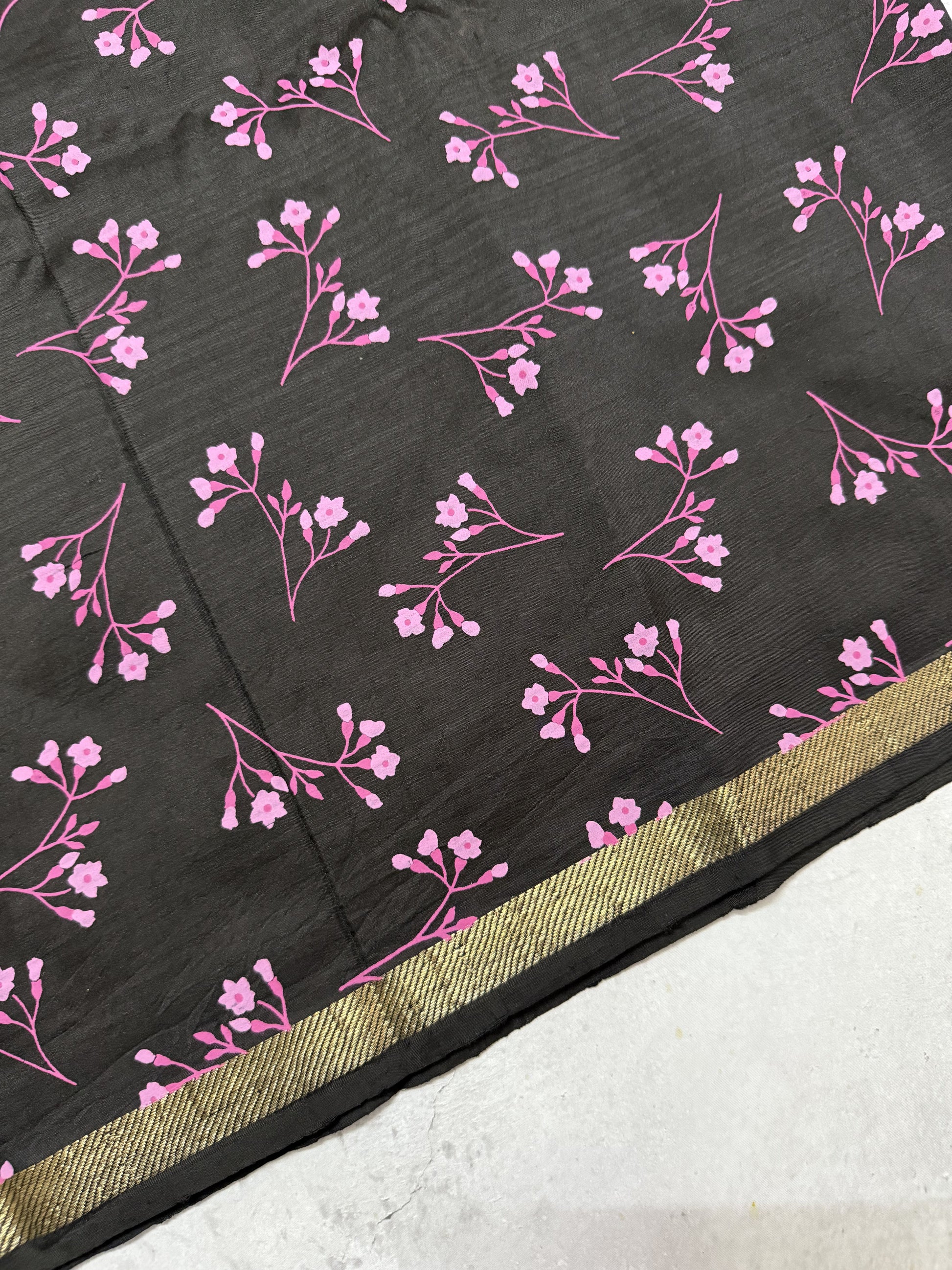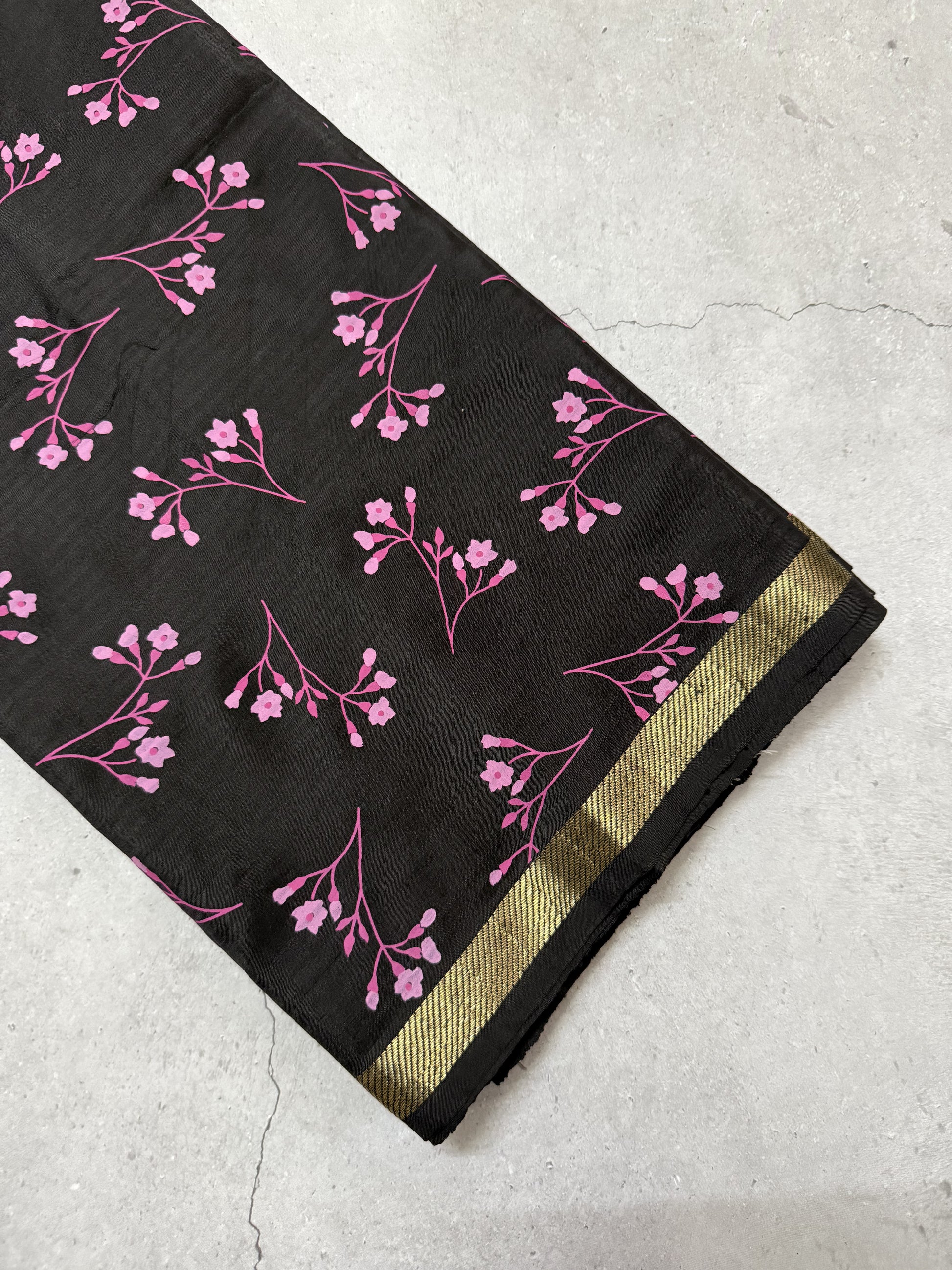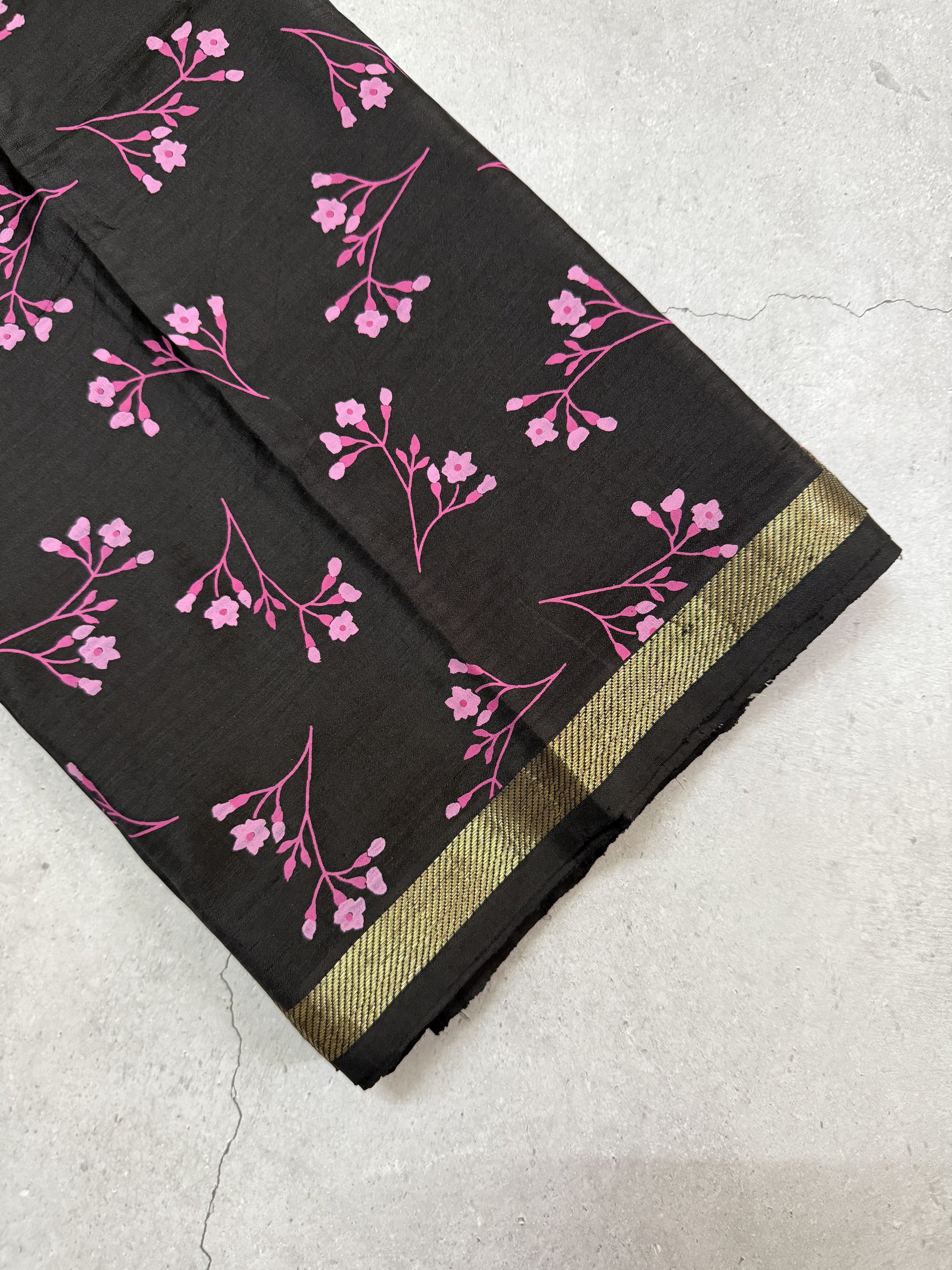 Woven in deep black, the saree’s smooth, lustrous base provides the perfect canvas for handcrafted block prints. The subtle gold zari-lined borders and pallu add just the right touch of elegance, letting the craftsmanship speak without overwhelming the design. Rooted in heritage and elevated through minimal styling, this drape is a celebration of both craft and character.