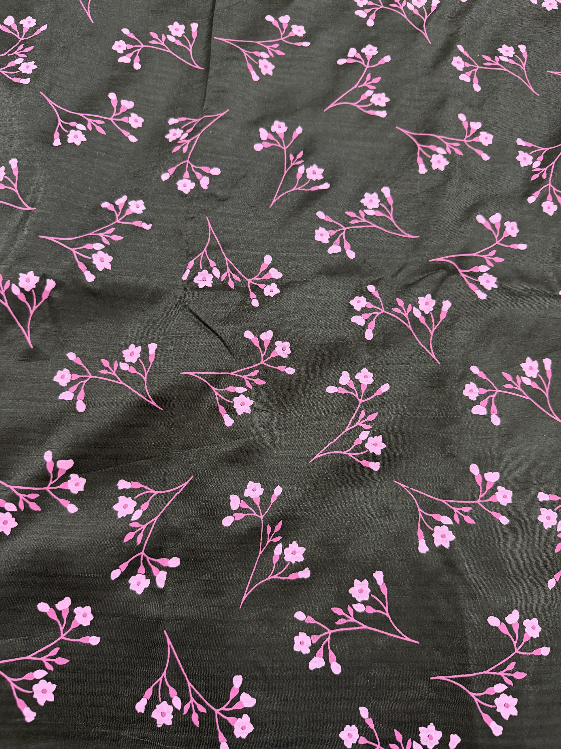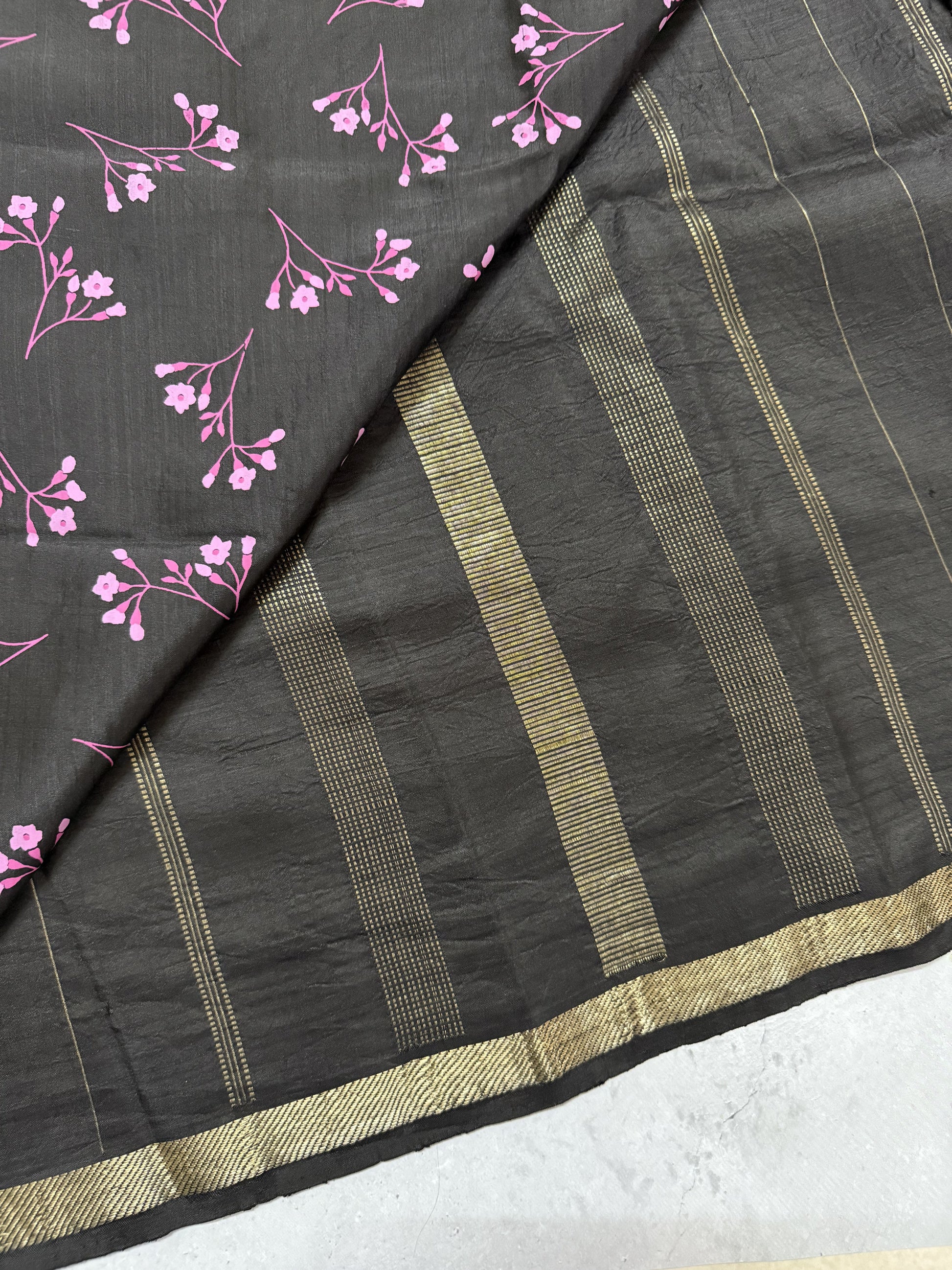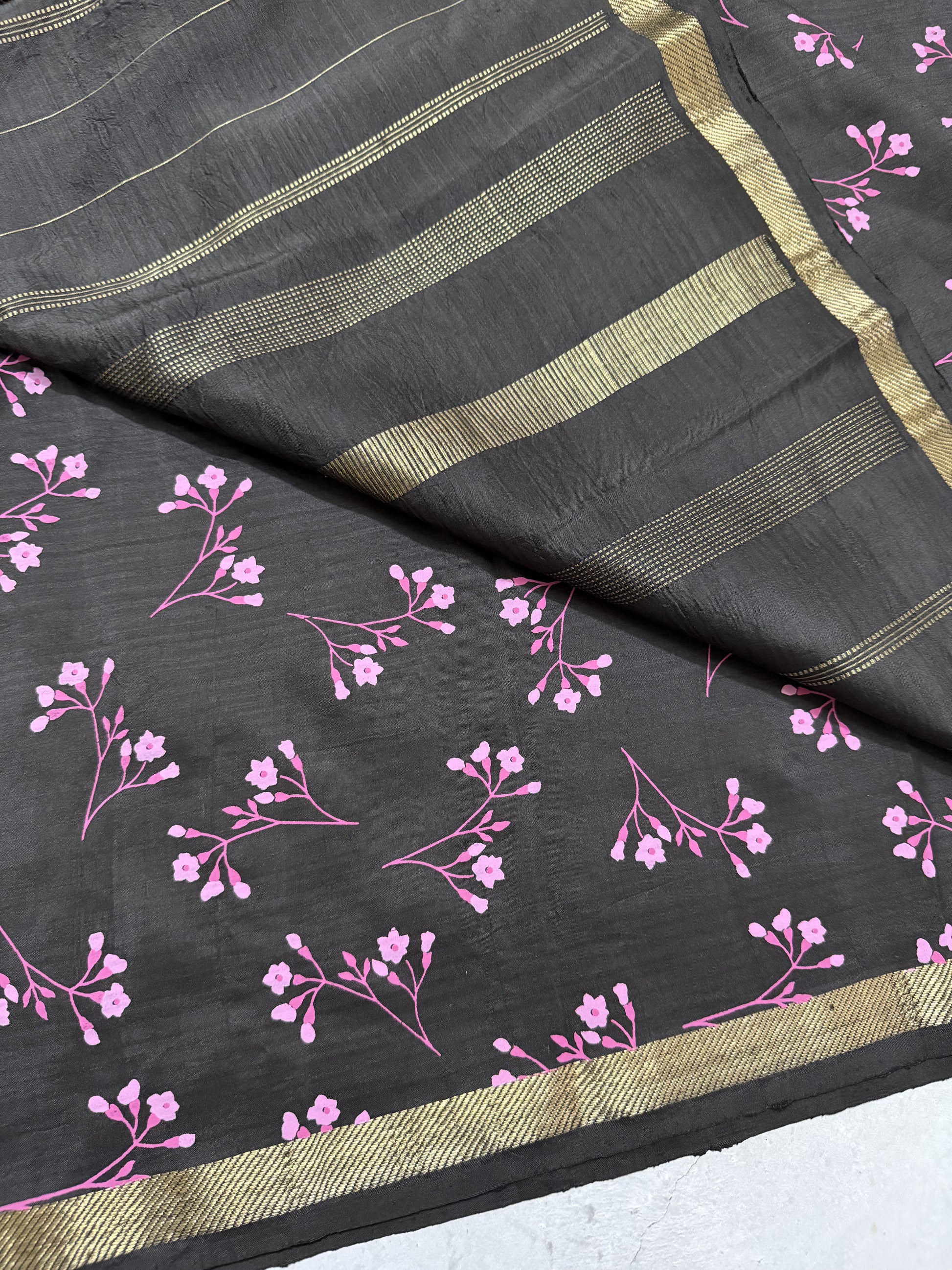 Woven in deep black, the saree’s smooth, lustrous base provides the perfect canvas for handcrafted block prints. The subtle gold zari-lined borders and pallu add just the right touch of elegance, letting the craftsmanship speak without overwhelming the design. Rooted in heritage and elevated through minimal styling, this drape is a celebration of both craft and character.