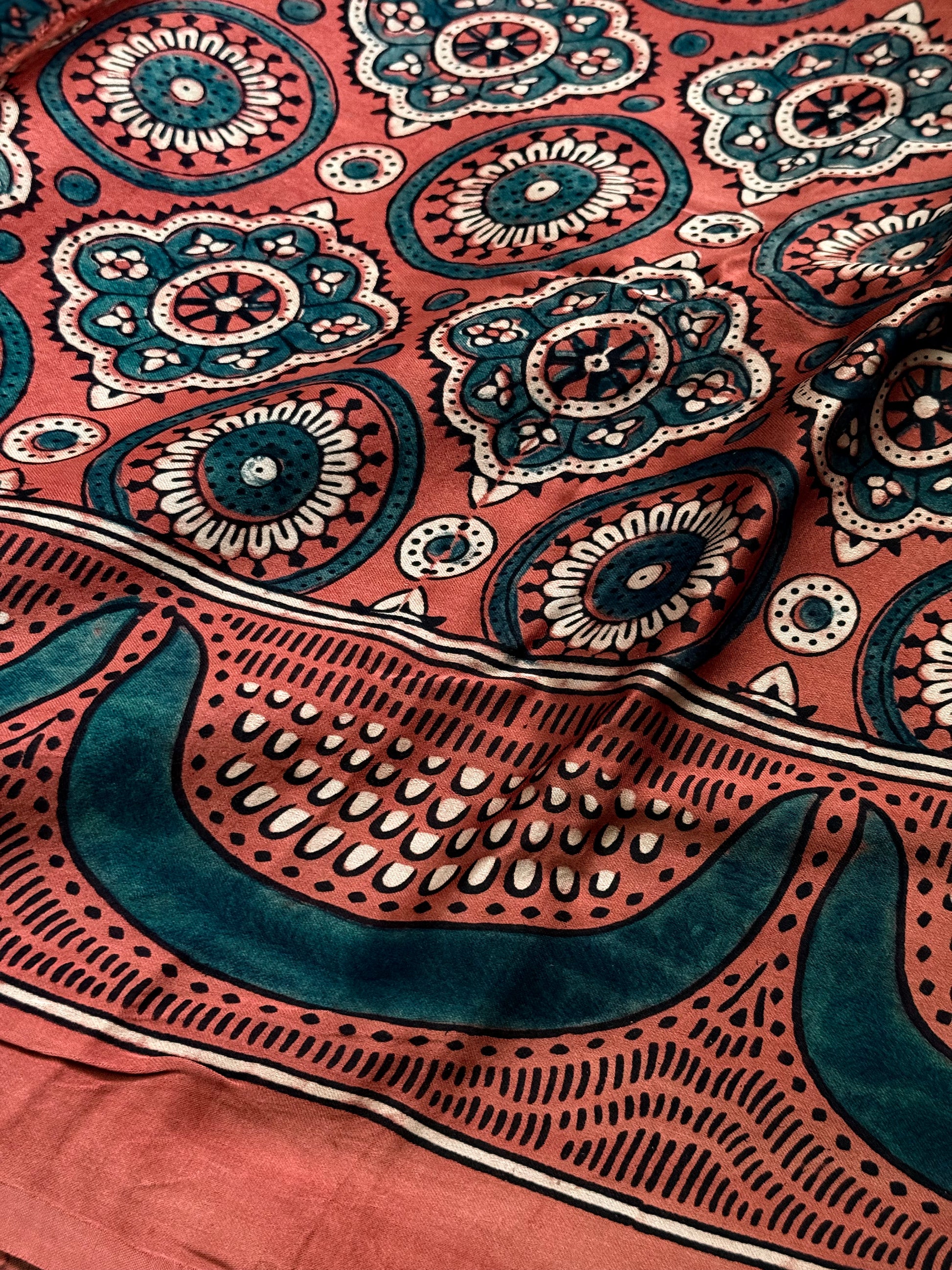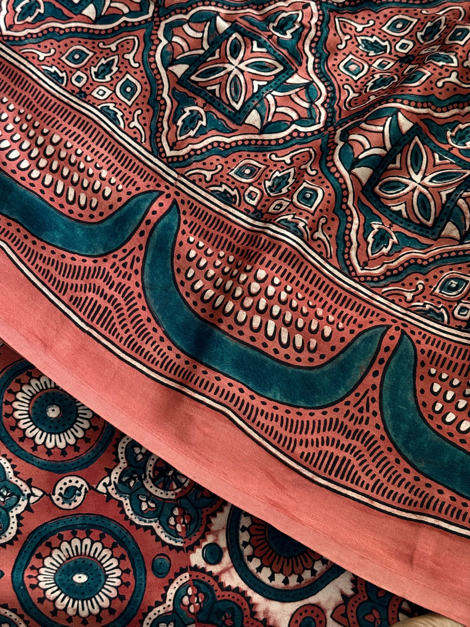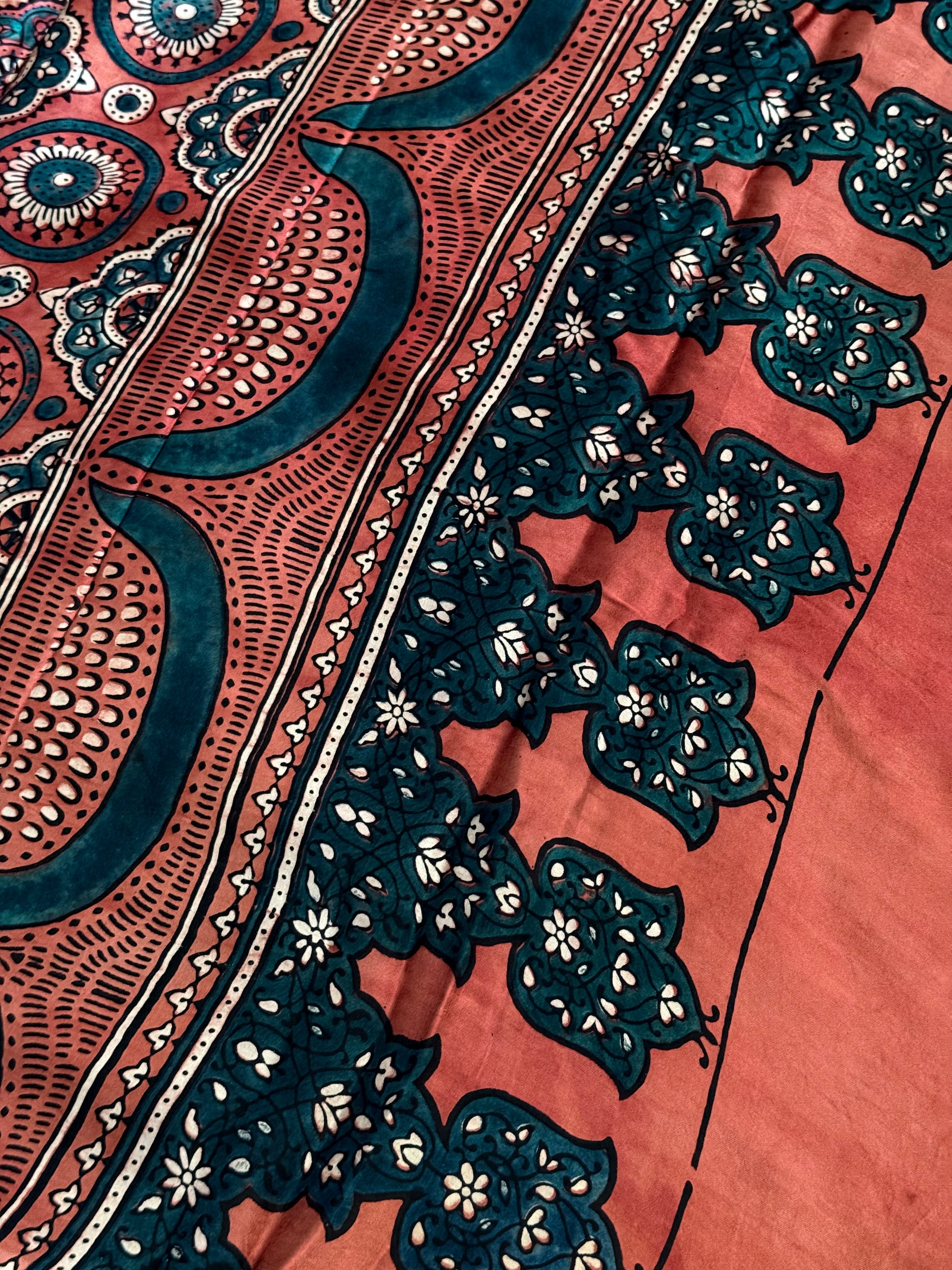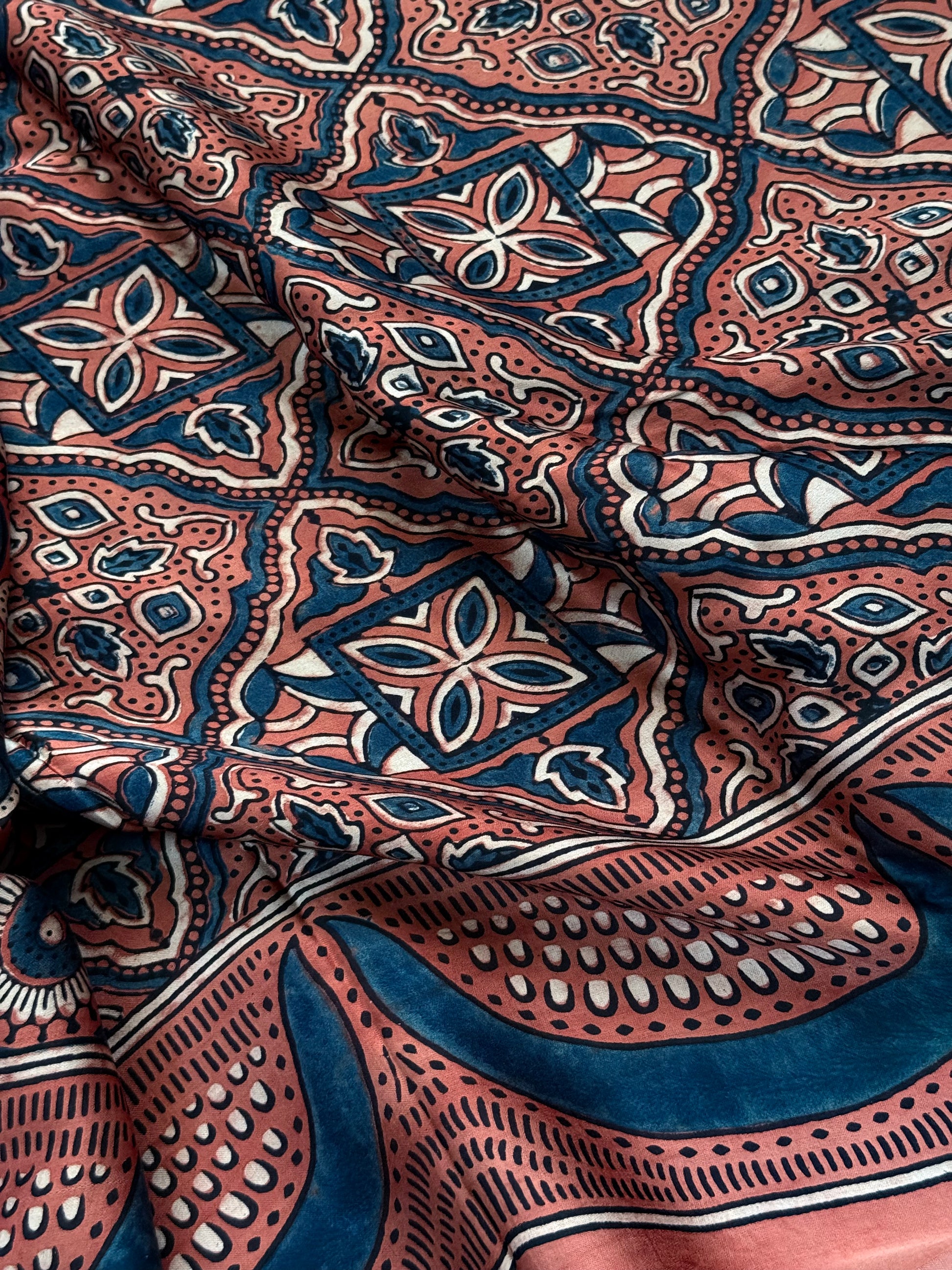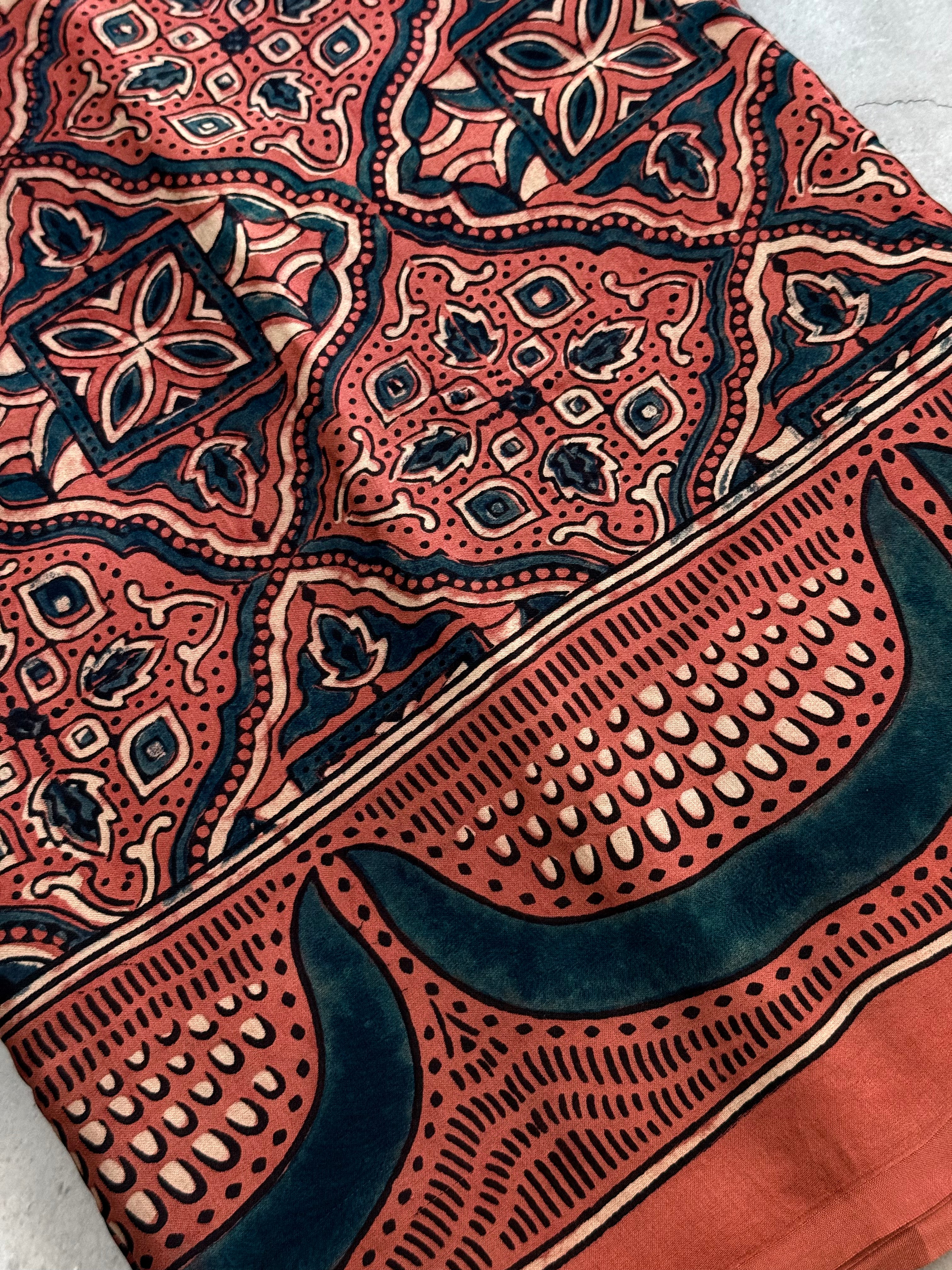 Ajrakh Block-Printed Modal Silk Saree is a beautiful fusion of traditional craftsmanship and modern luxury. The fabric combines the softness and fluidity of modal silk with the intricate, geometric, and nature-inspired patterns of Ajrakh block printing, a centuries-old technique originating from Gujarat and Rajasthan. This form of printing is known for its distinctive use of natural dyes and detailed, symmetrical designs, typically featuring bold motifs such as florals, paisleys, and geometric shapes.