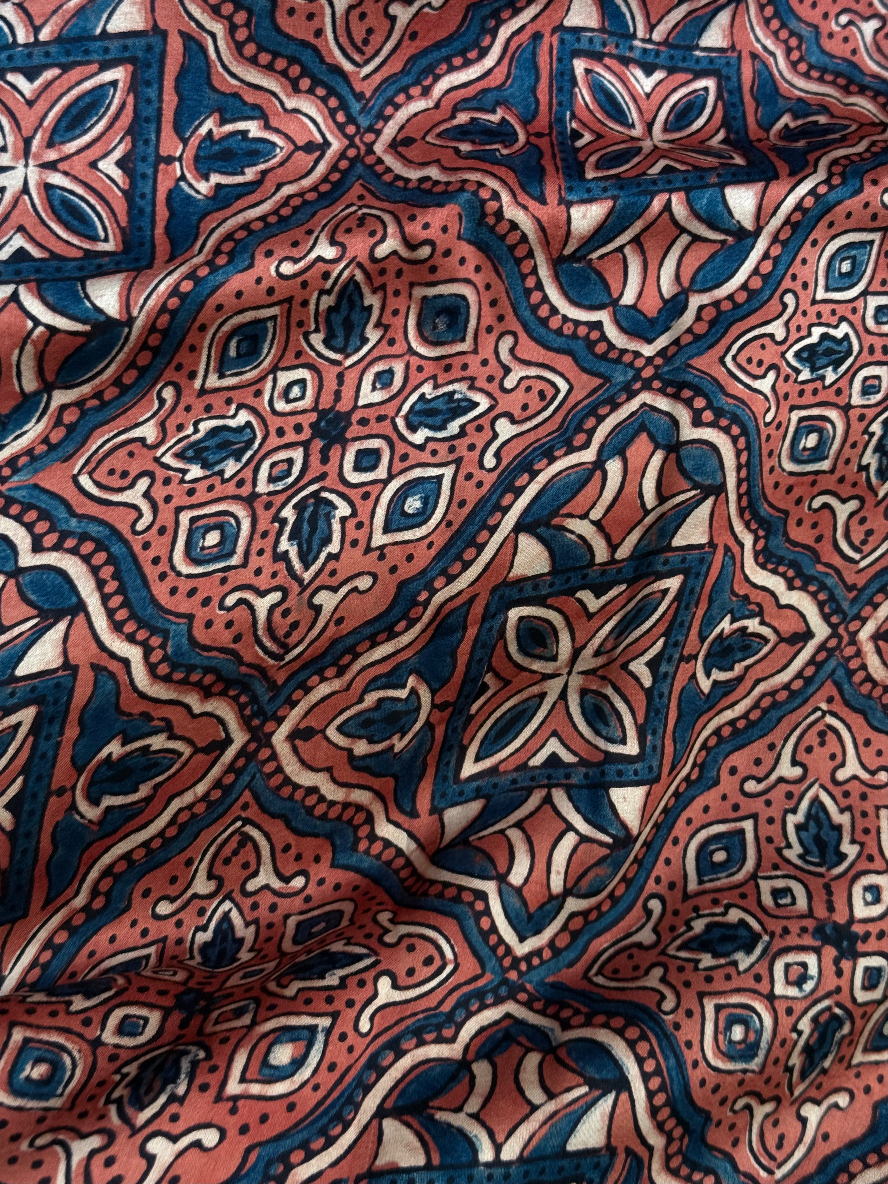 Modal Silk is a fiber derived from beech tree pulp, offering a silky smooth texture that is soft to the touch, breathable, and comfortable against the skin. Its lightness and sheen enhance the colors of the Ajrakh prints, allowing them to appear vibrant and rich, while still maintaining a fluid drape.