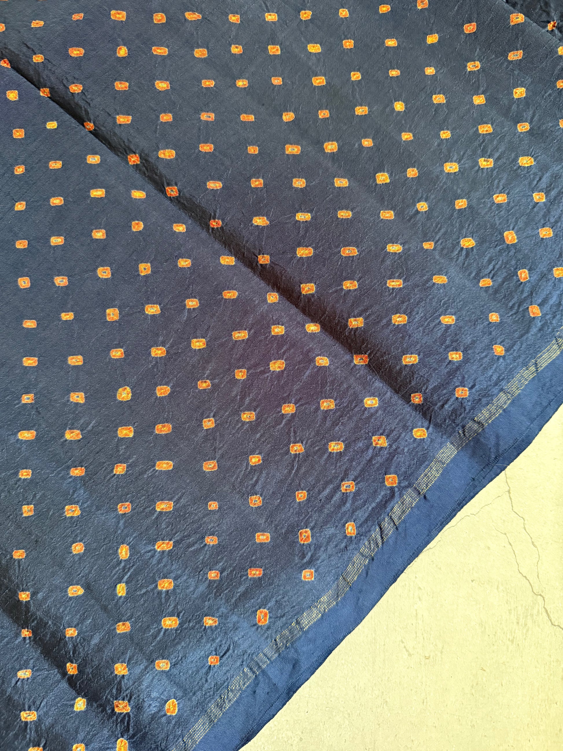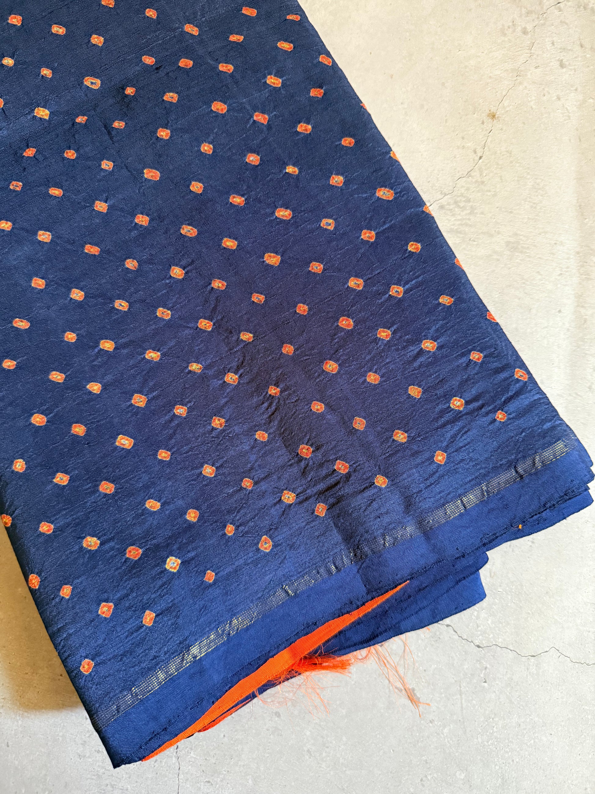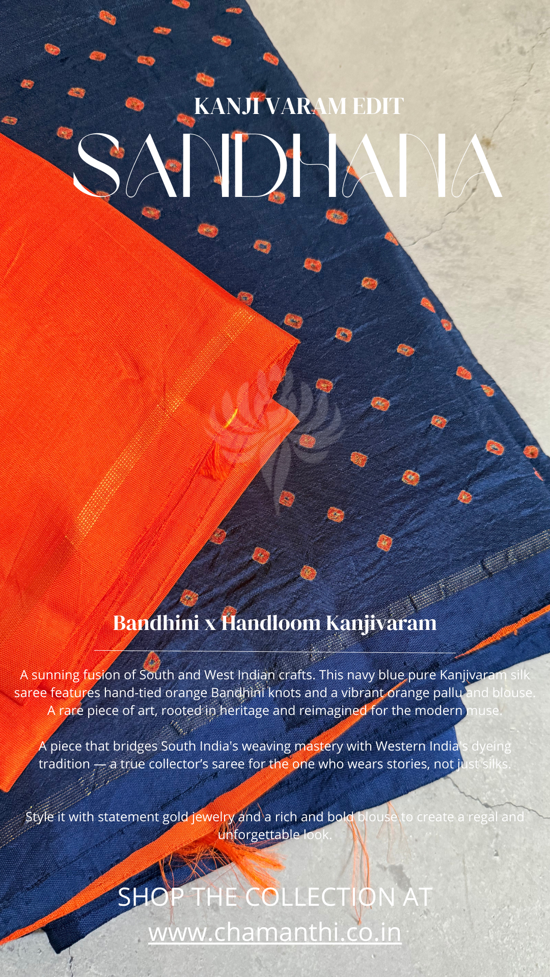 We began with a rich navy blue Kanjivaram base, woven by traditional weavers, known for their strength, lustre, and weightless drape. For value addition, the body is adorned with hand-tied Bandhini knots — a labor-intensive resist-dyeing technique perfected by artisans from Kutch and Rajasthan. The knots, in a striking orange hue, dance across the saree, creating a playful yet elegant contrast.