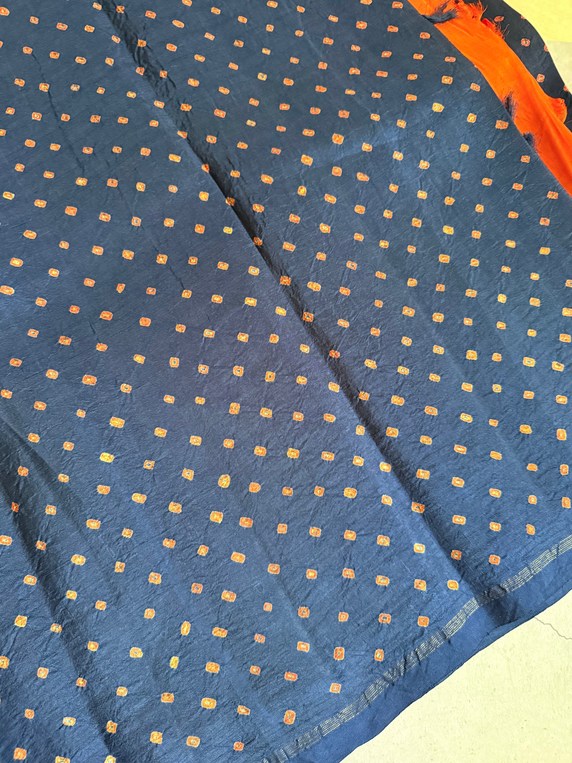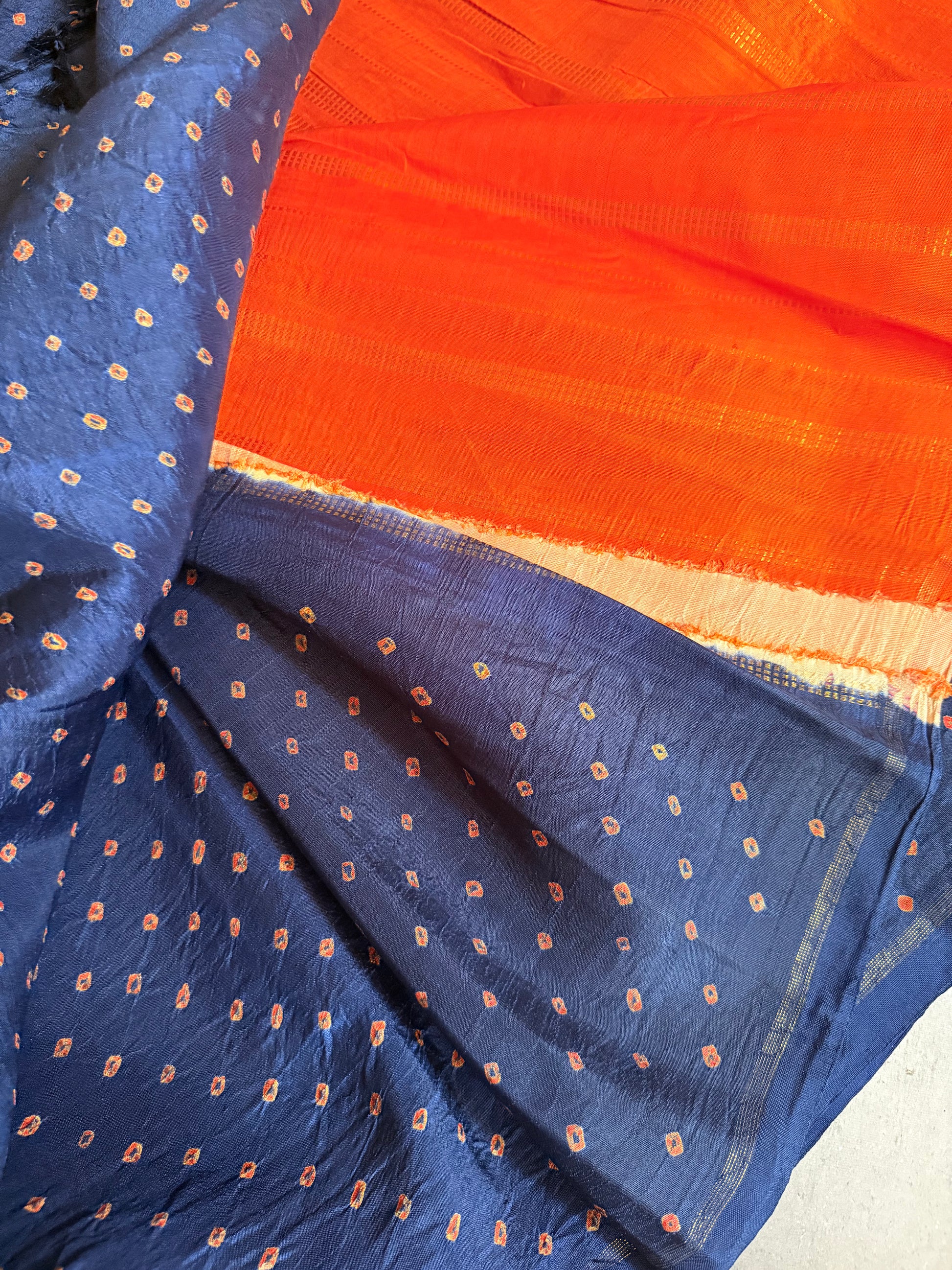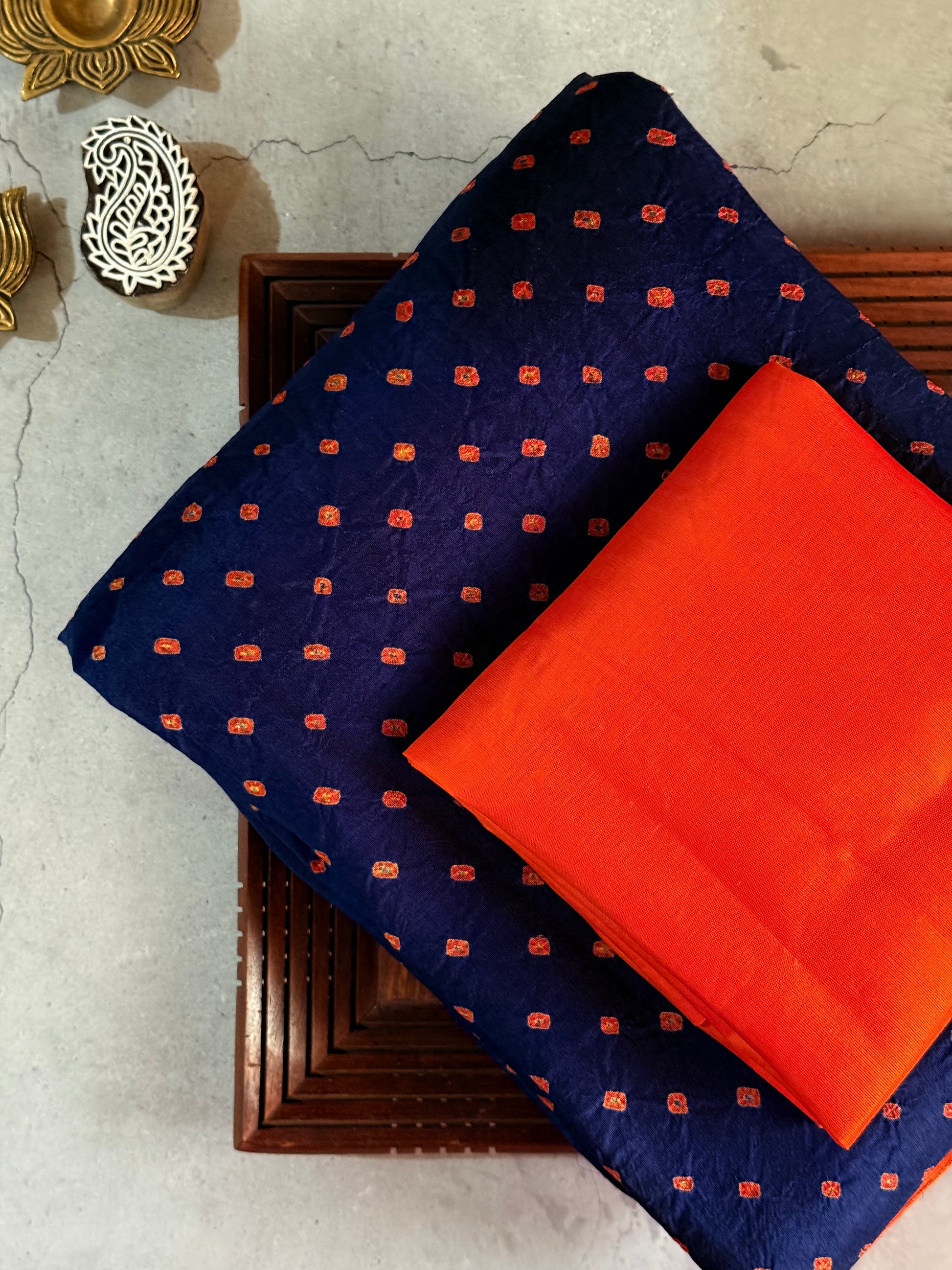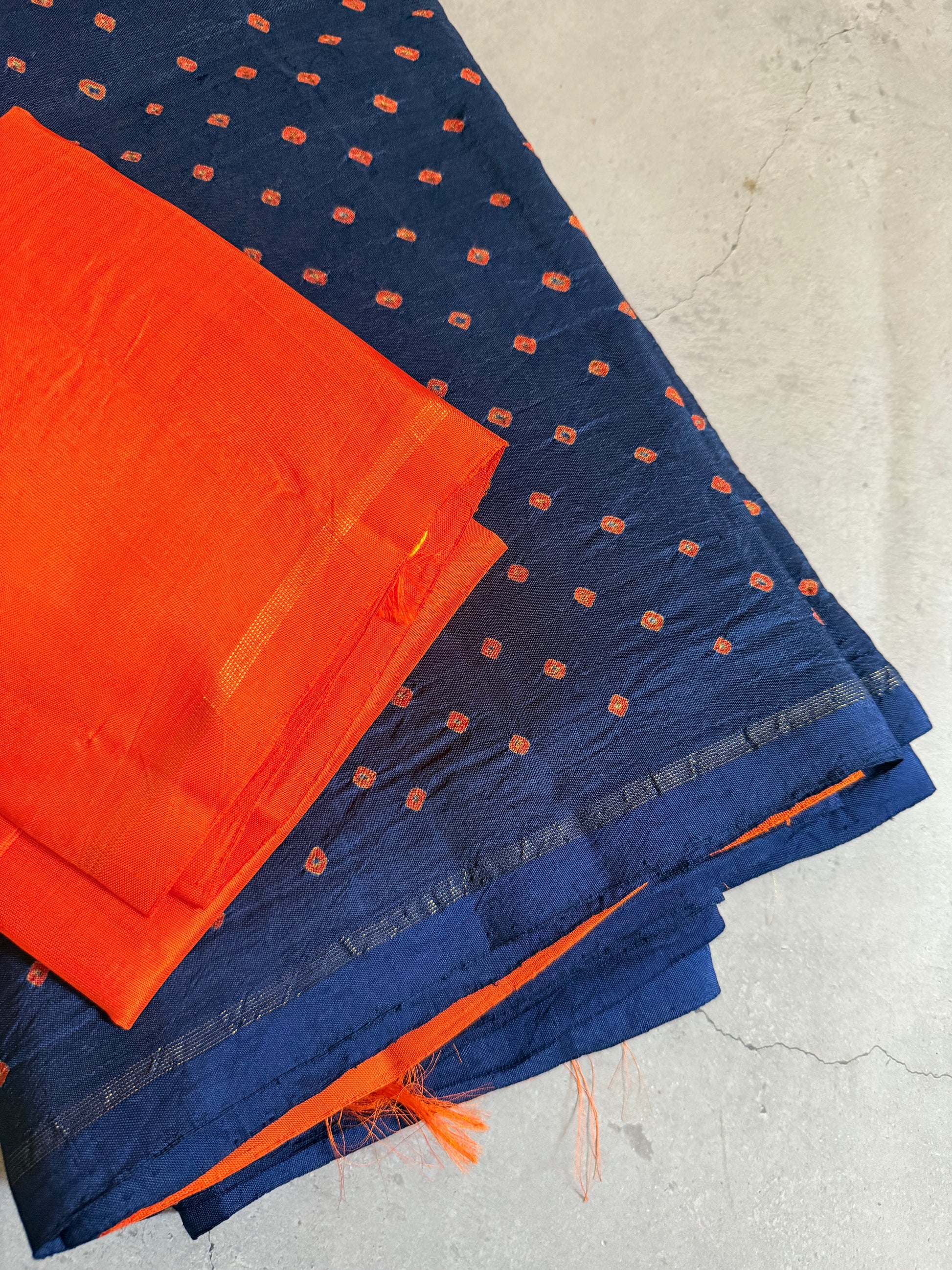We began with a rich navy blue Kanjivaram base, woven by traditional weavers, known for their strength, lustre, and weightless drape. For value addition, the body is adorned with hand-tied Bandhini knots — a labor-intensive resist-dyeing technique perfected by artisans from Kutch and Rajasthan. The knots, in a striking orange hue, dance across the saree, creating a playful yet elegant contrast.