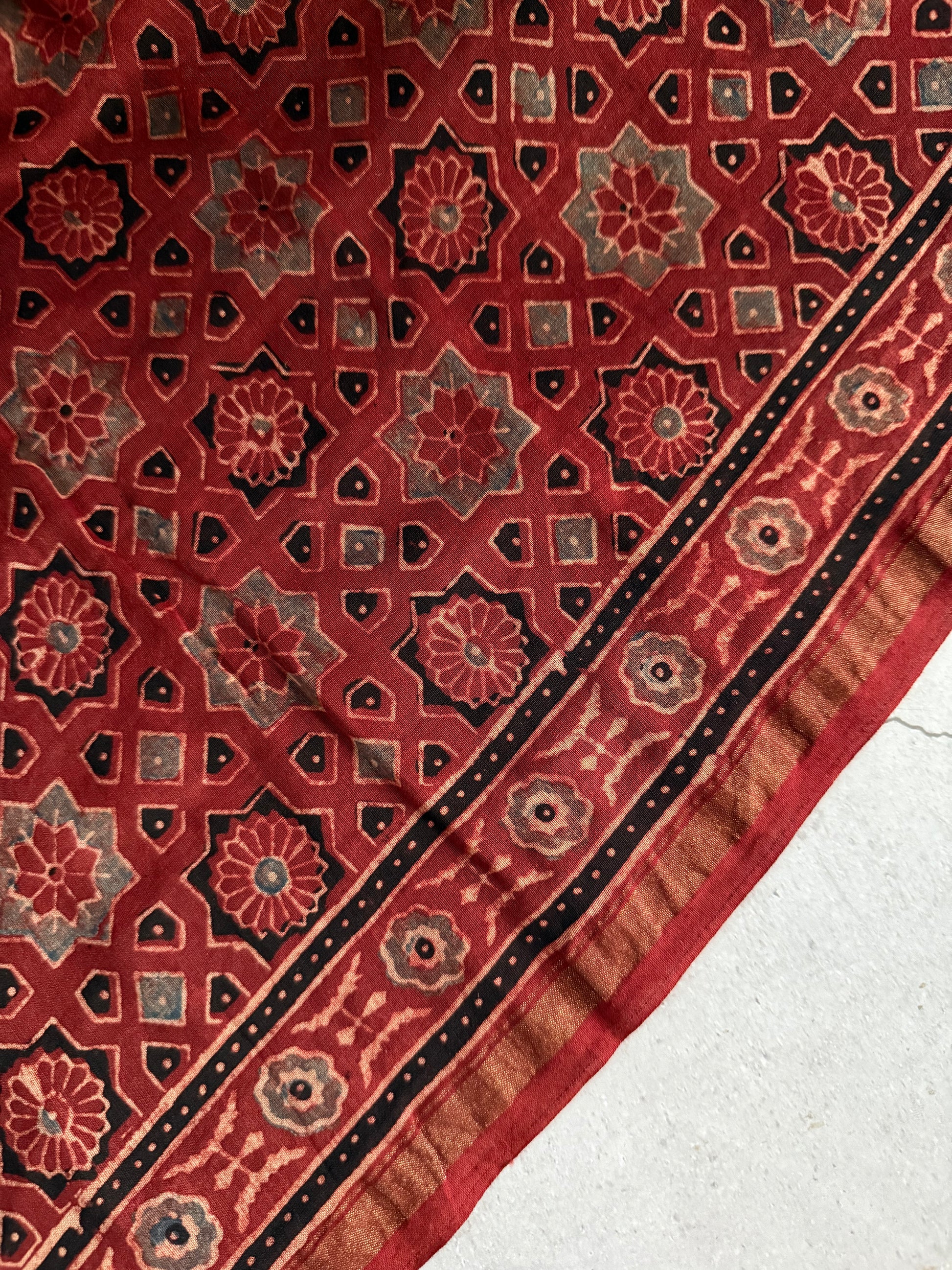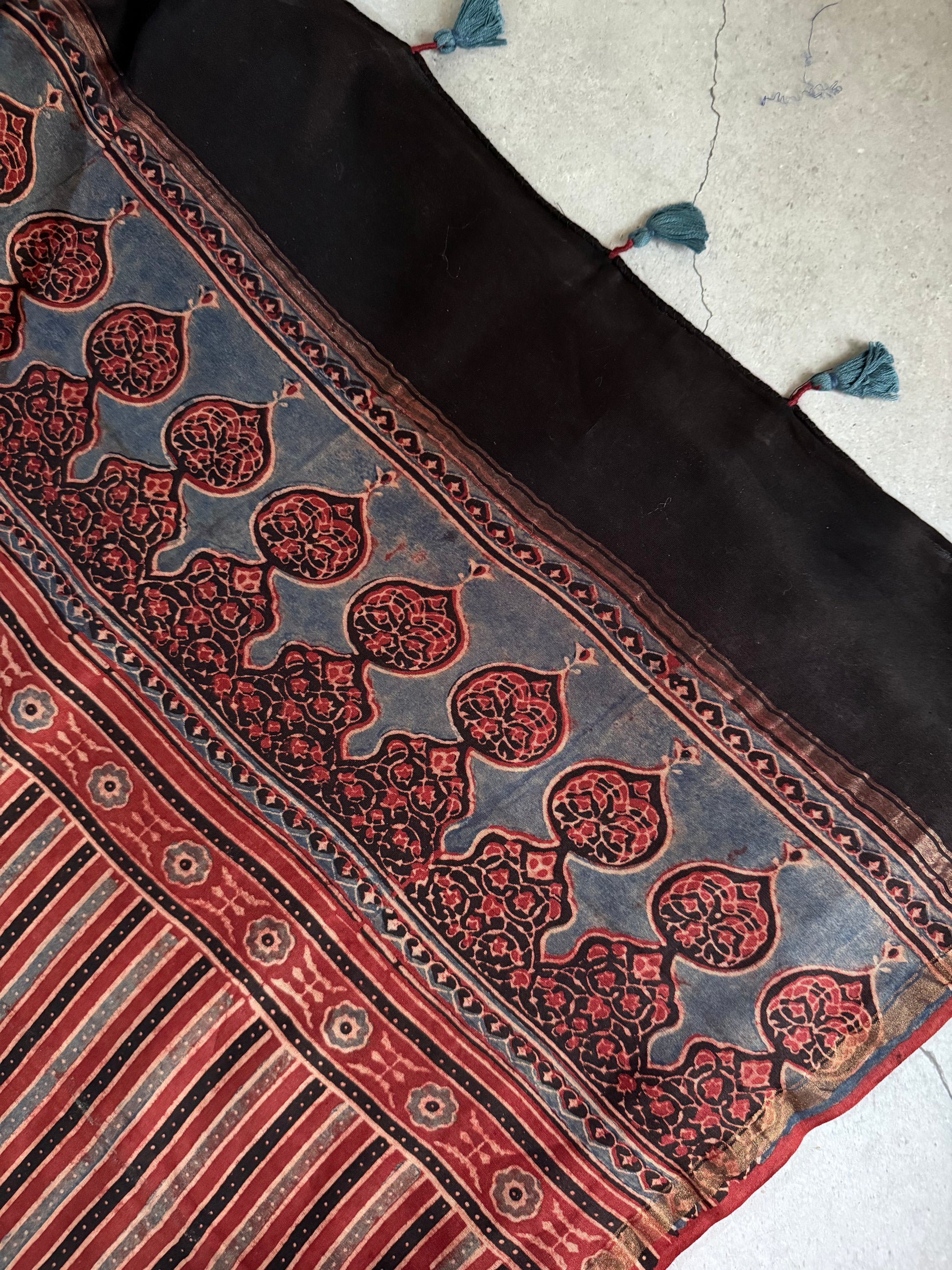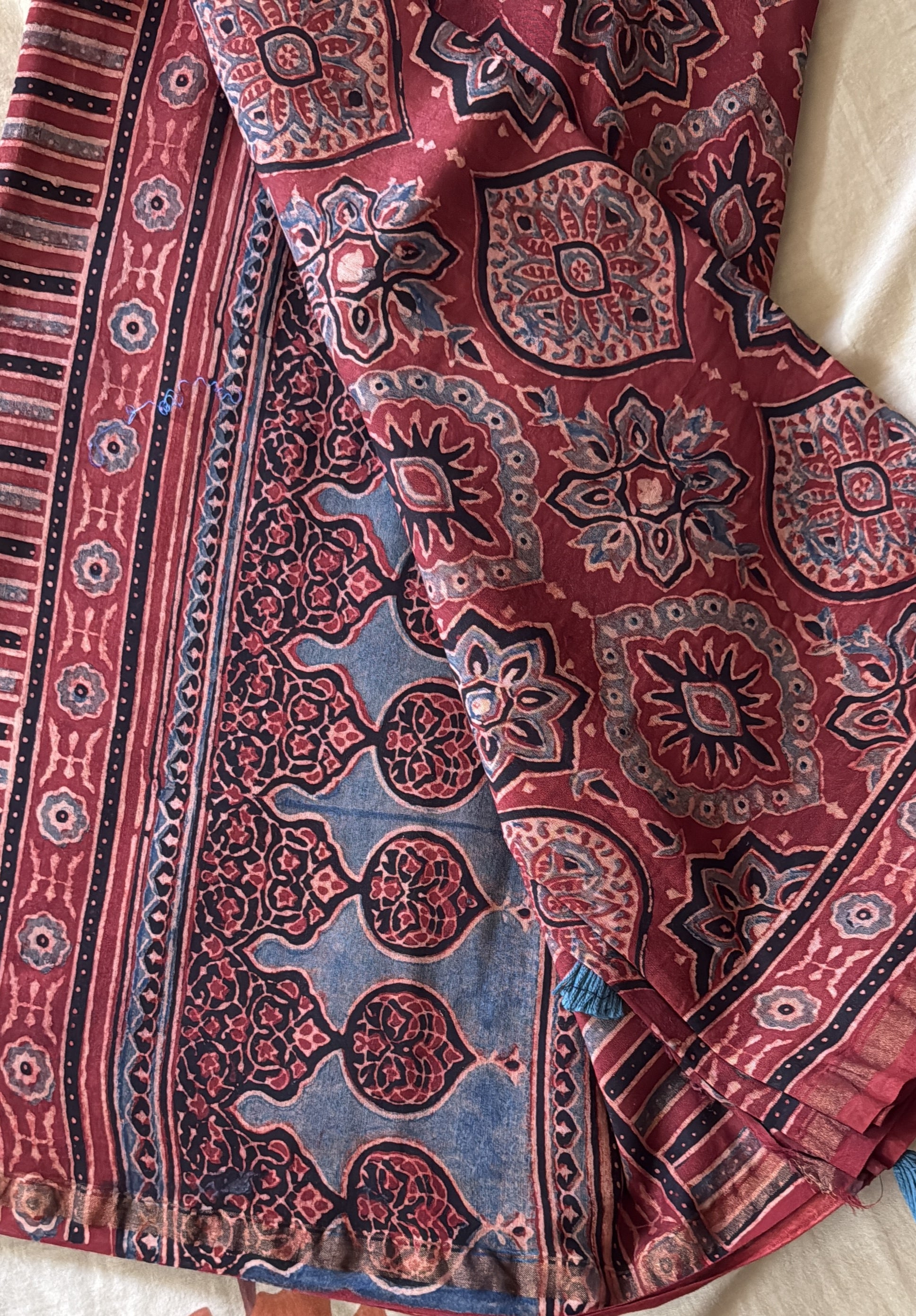 Rooted in tradition and rich in character, this saree brings together the sheer elegance of Chanderi silk-cotton with the timeless charm of natural-color Ajrakh handblock printing.
