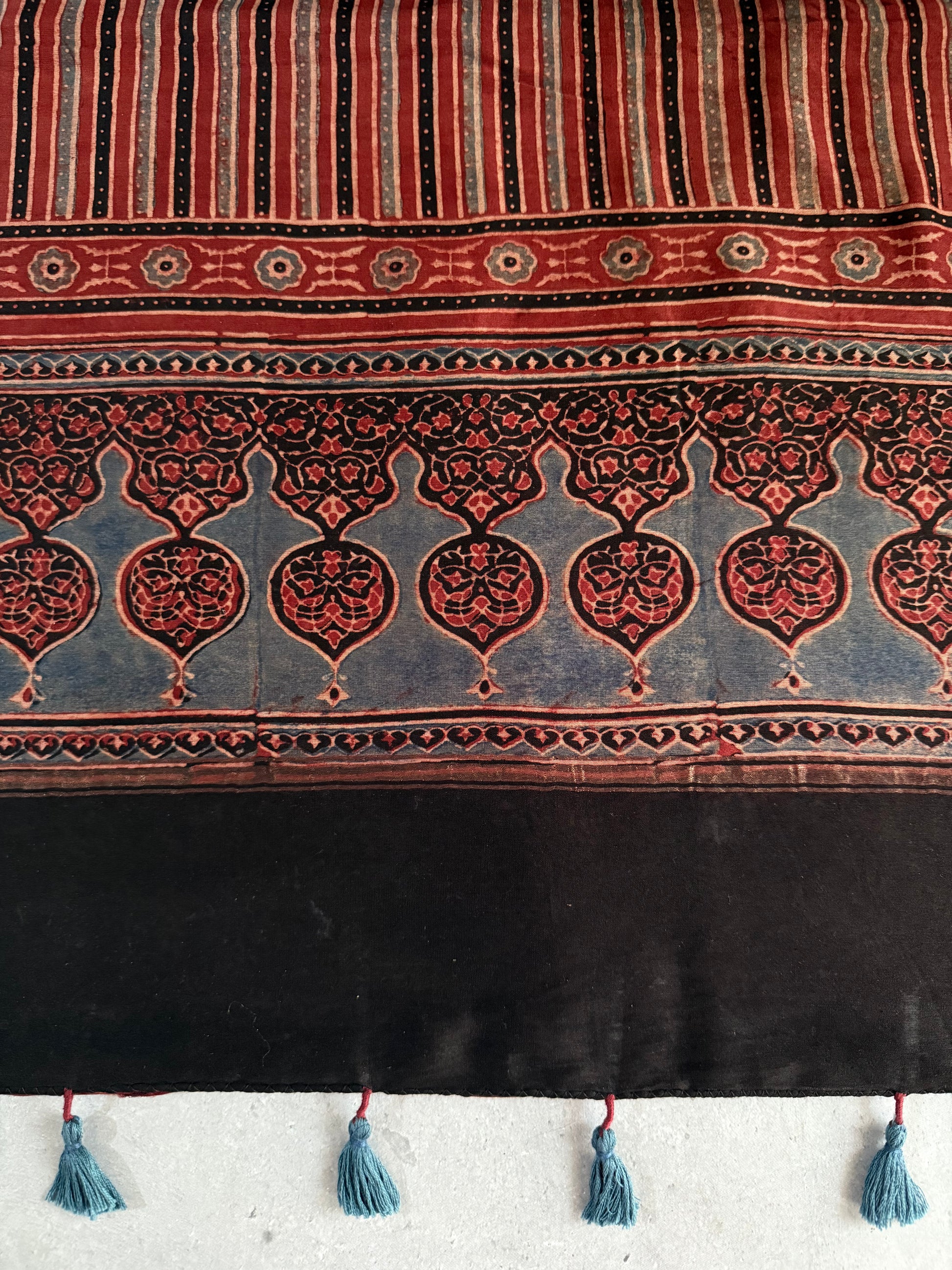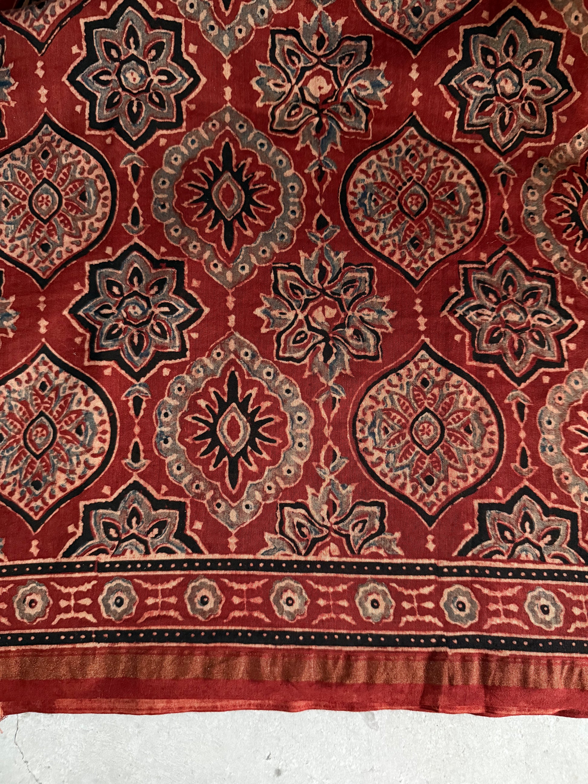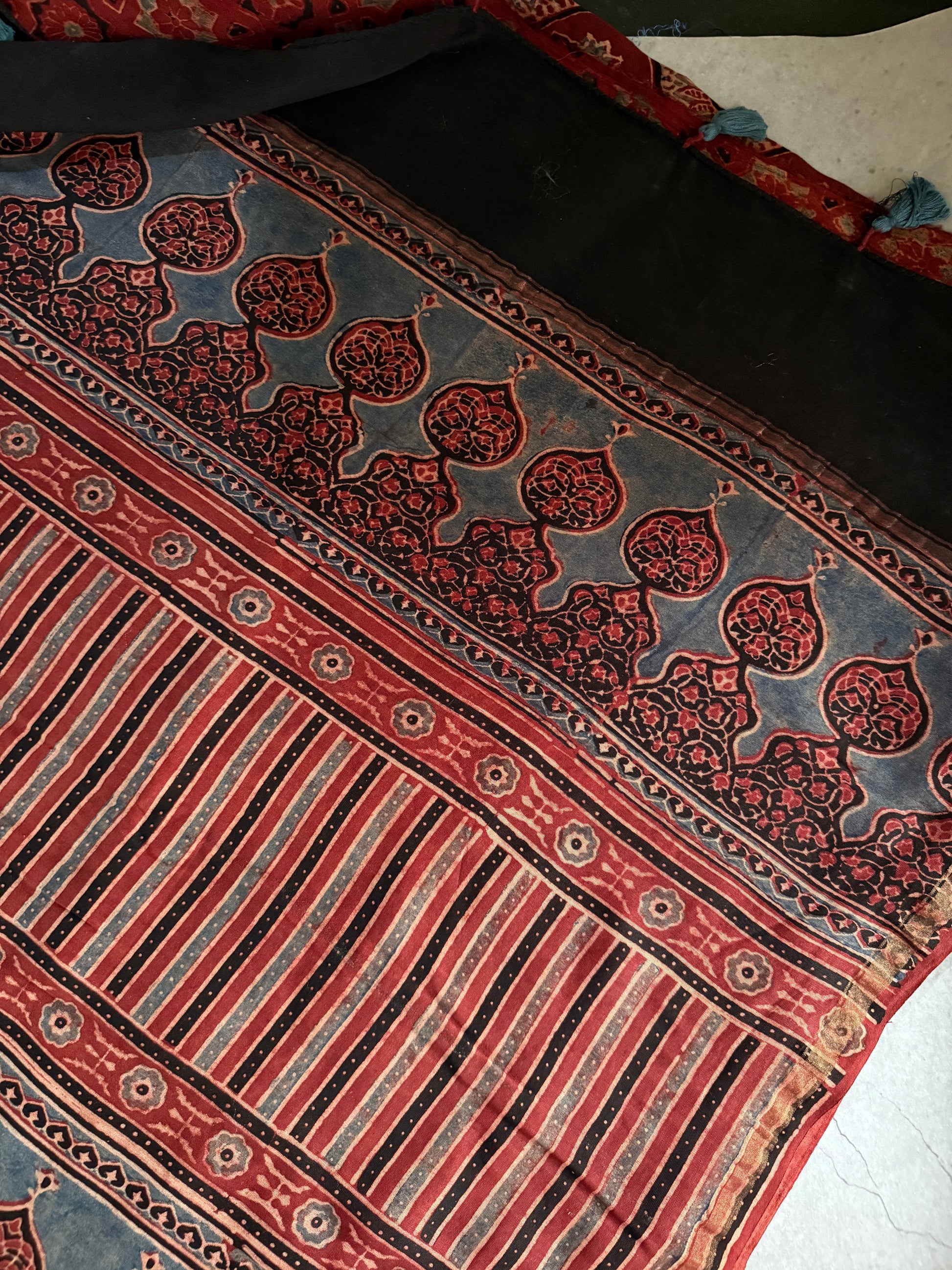 Rooted in tradition and rich in character, this saree brings together the sheer elegance of Chanderi silk-cotton with the timeless charm of natural-color Ajrakh handblock printing.