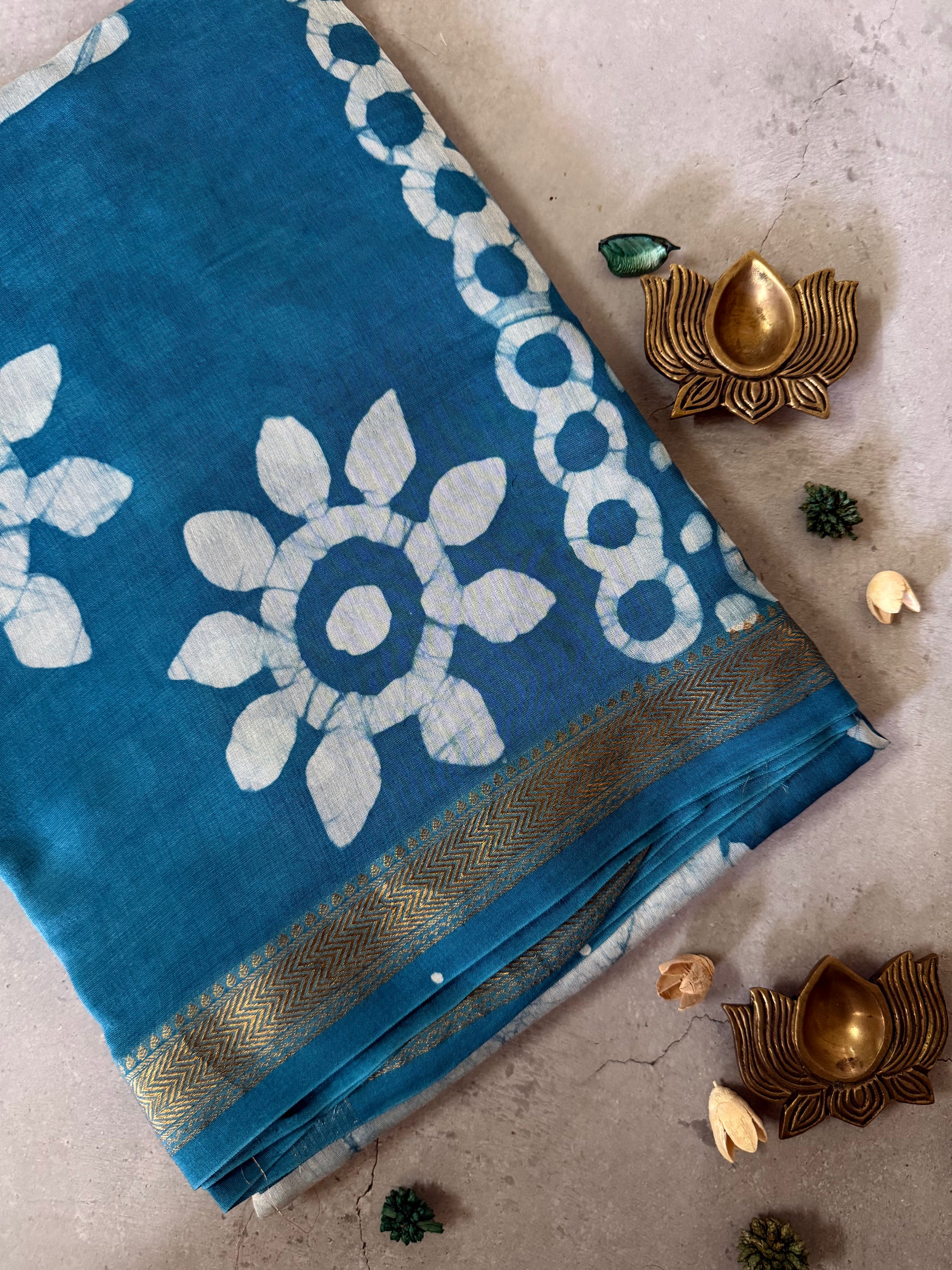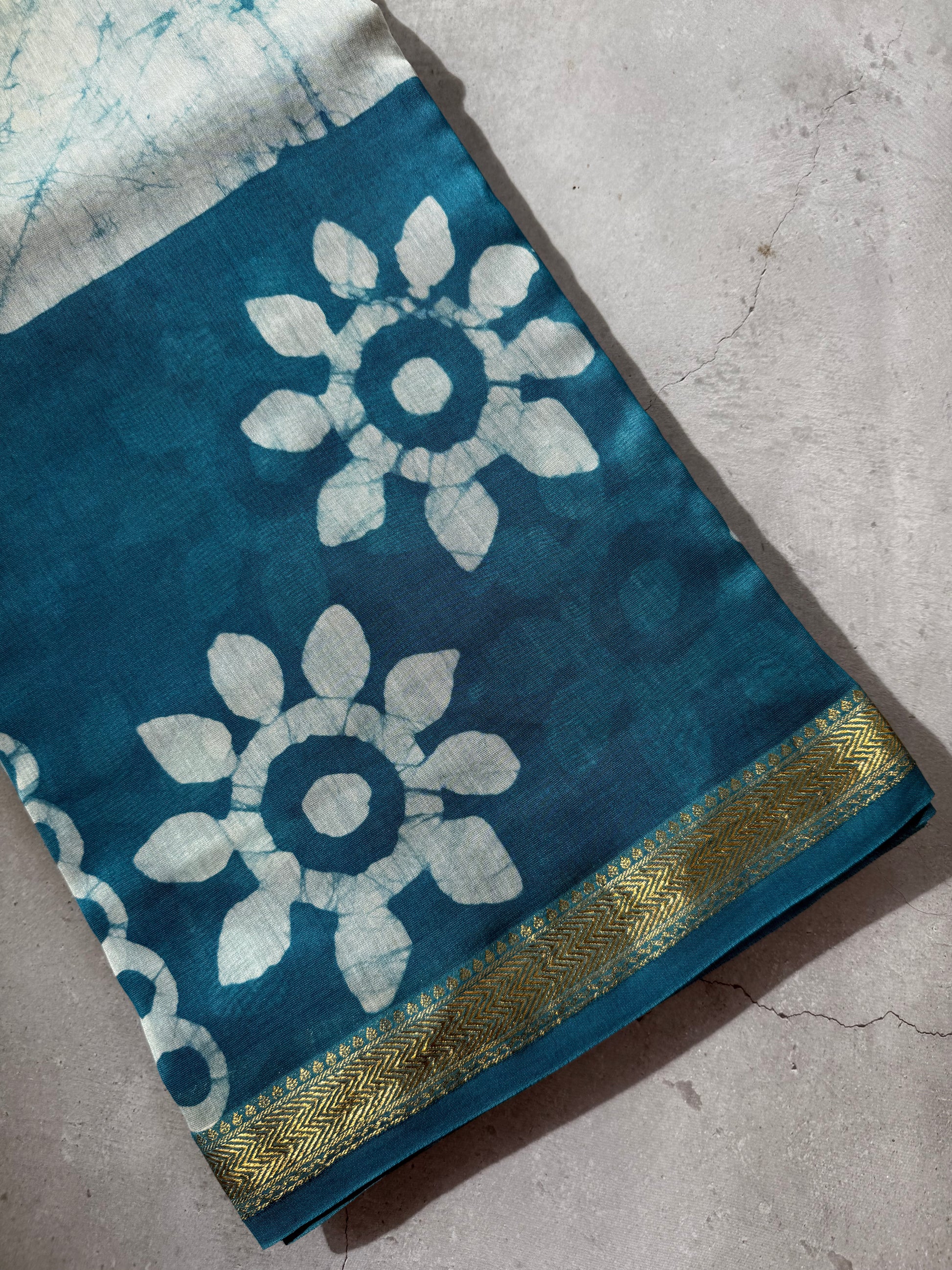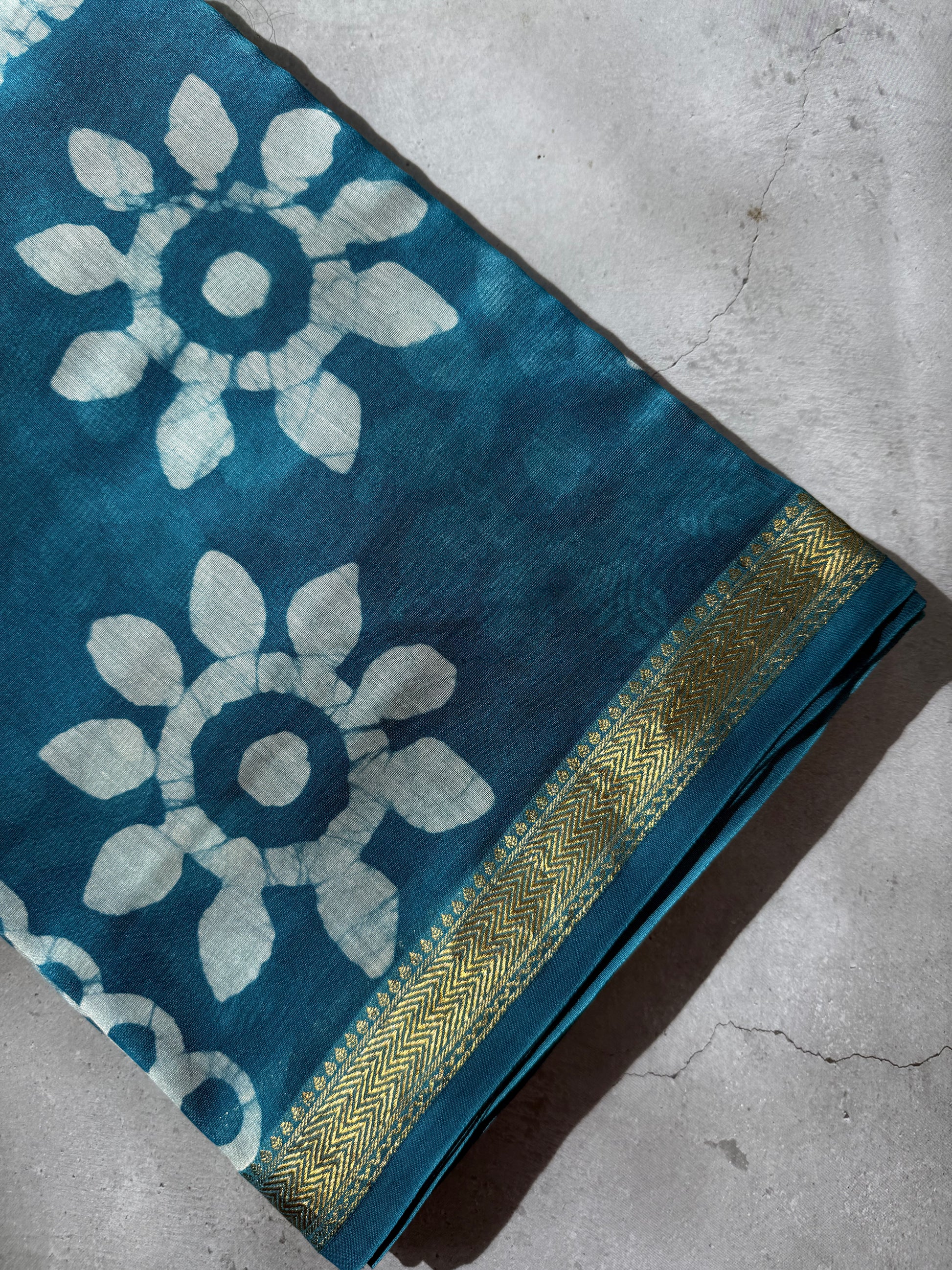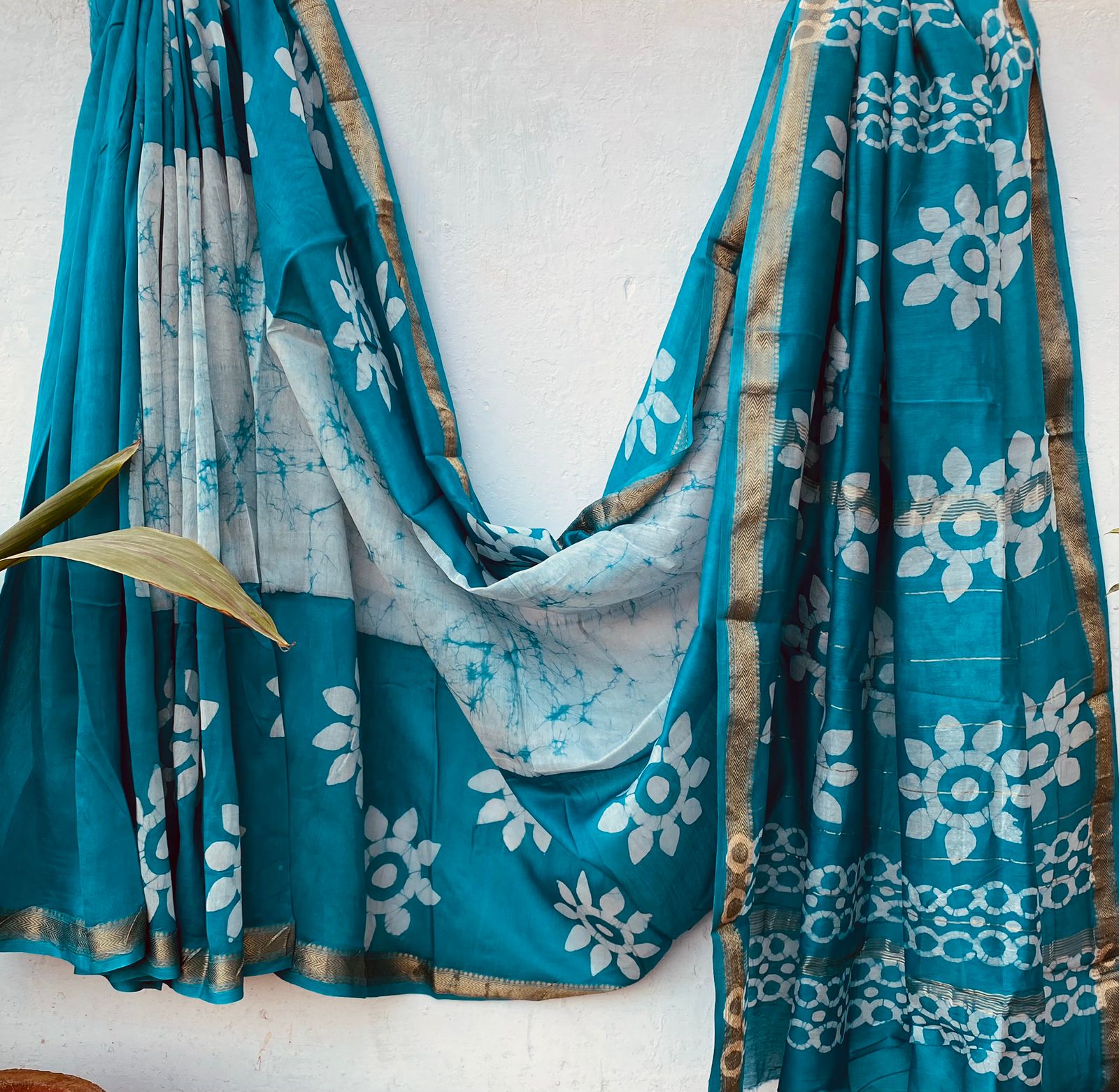 Shilaa| Blue and white Block Printed Maheshwari Saree