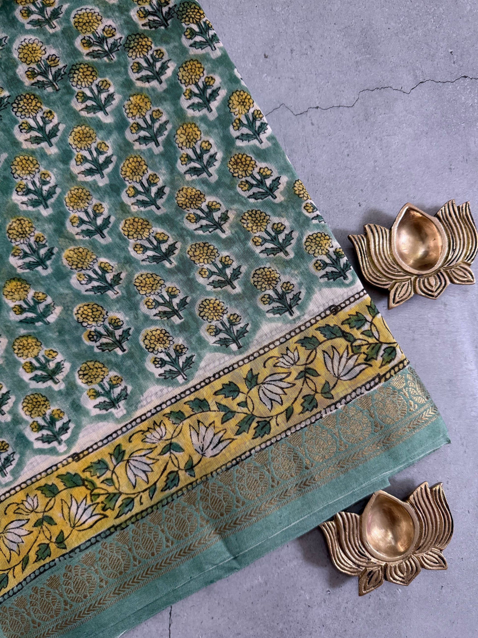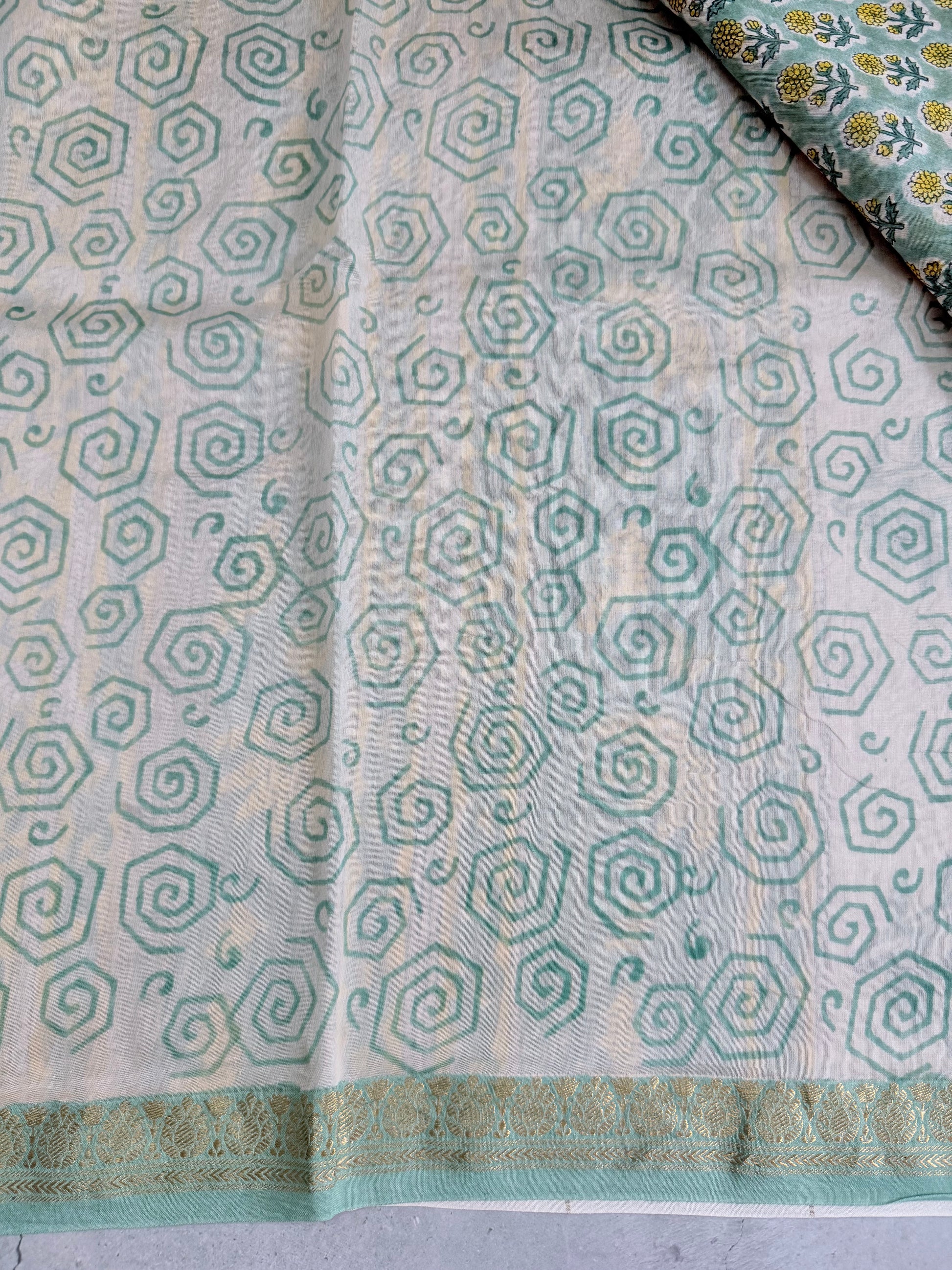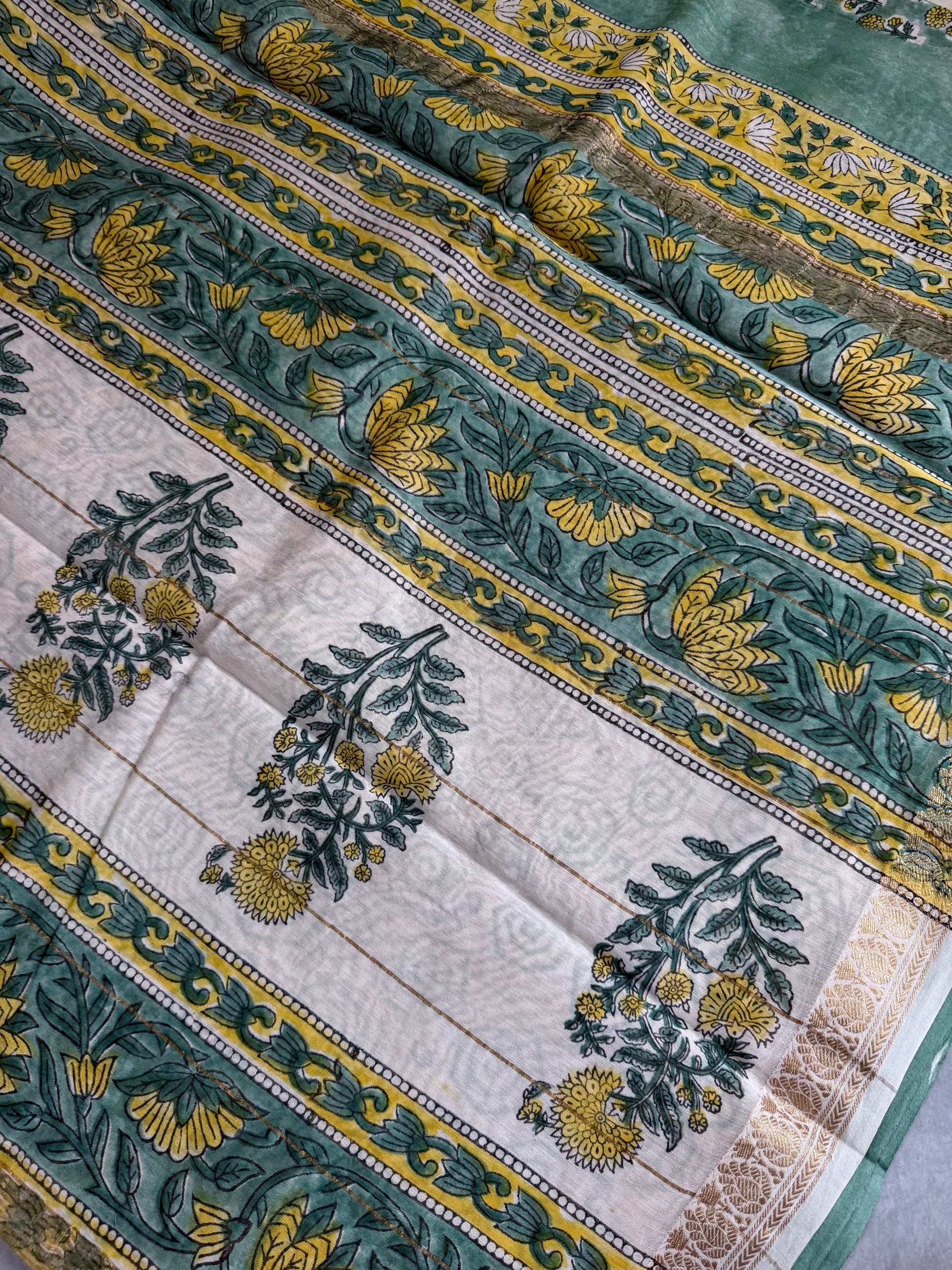 Shubhra | Pastle Green Block Printed Maheshwari Saree