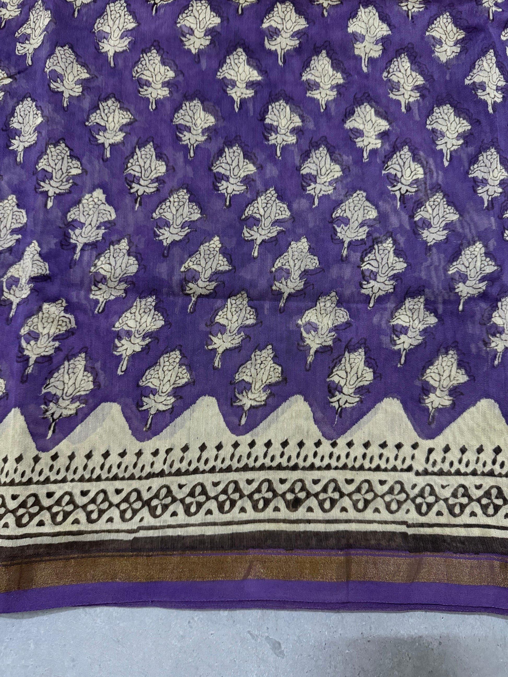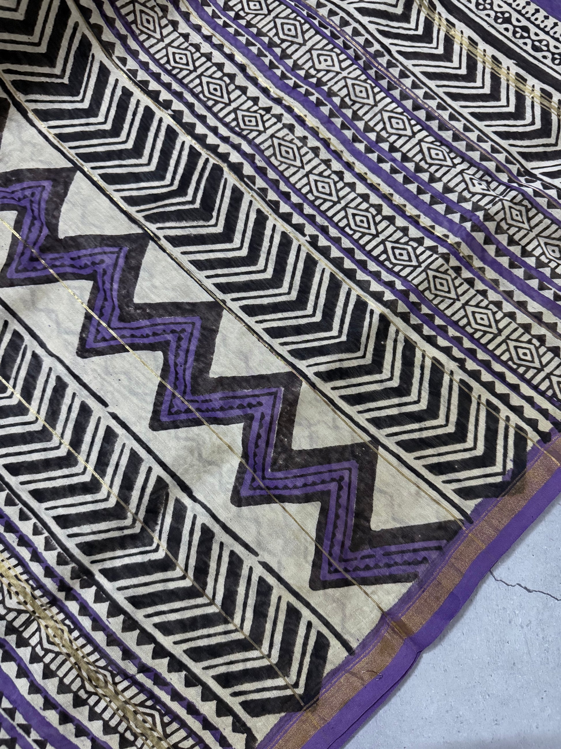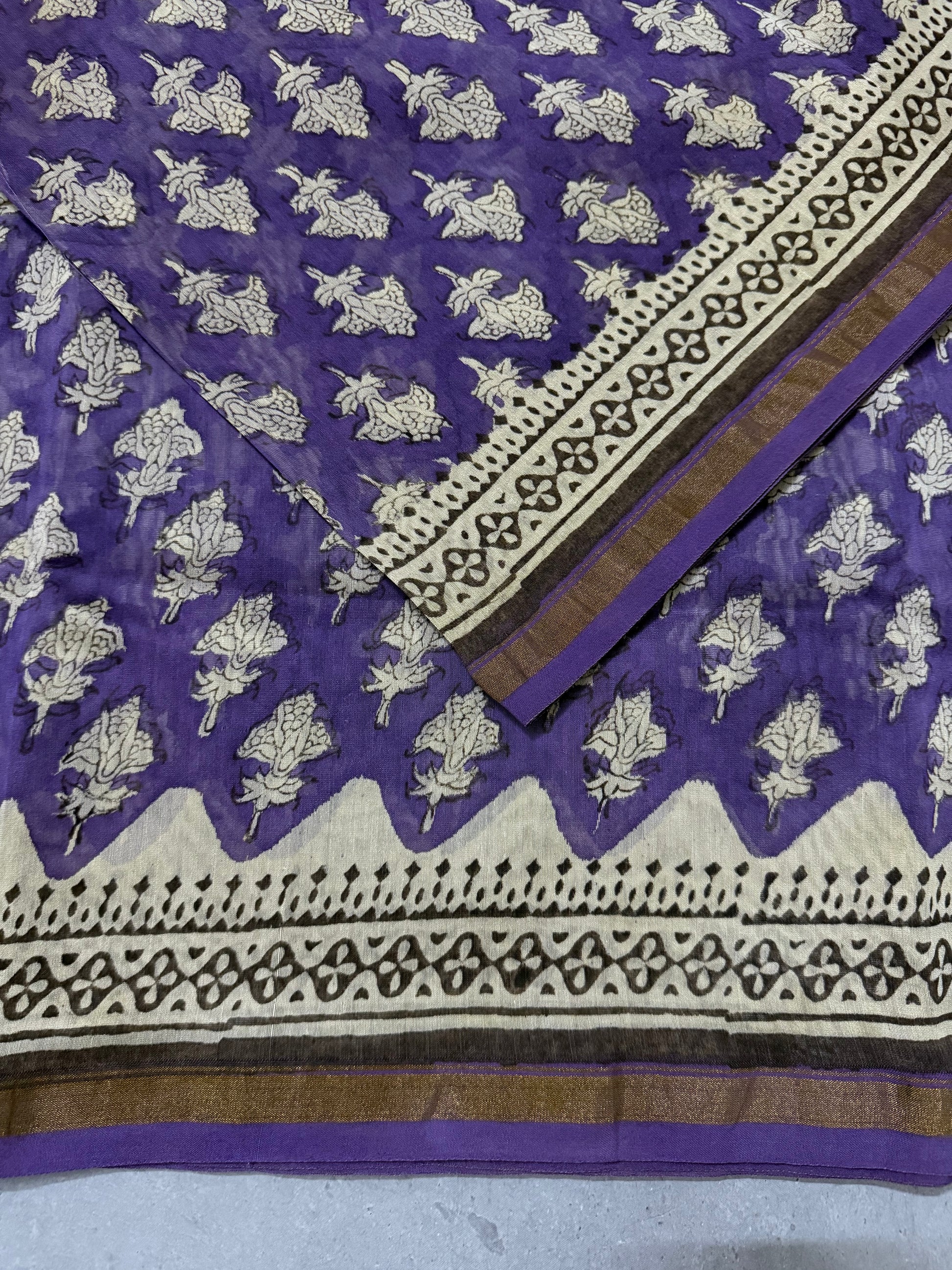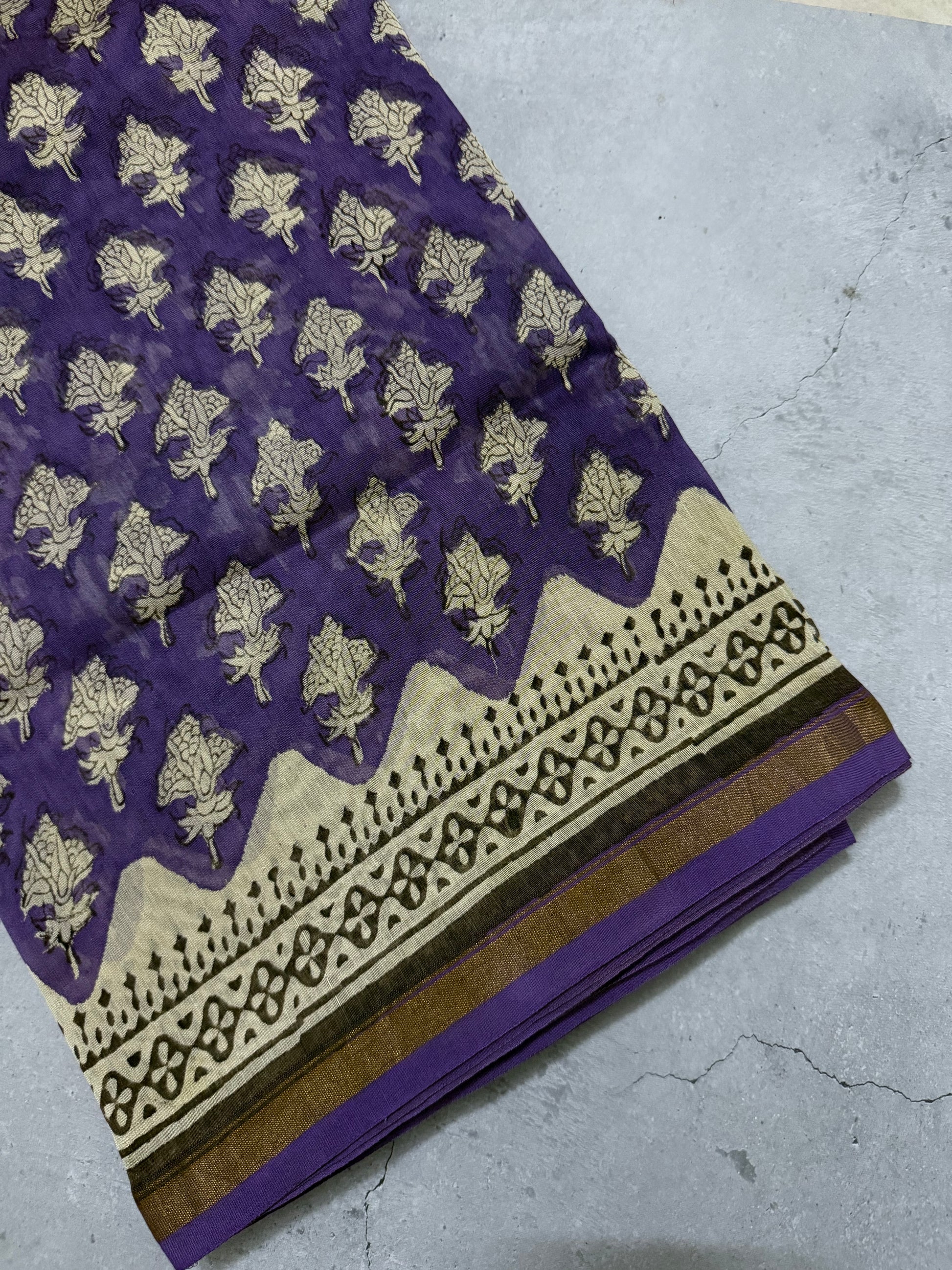 Triloka | Purple and White Floral Block Printed Chanderi Saree