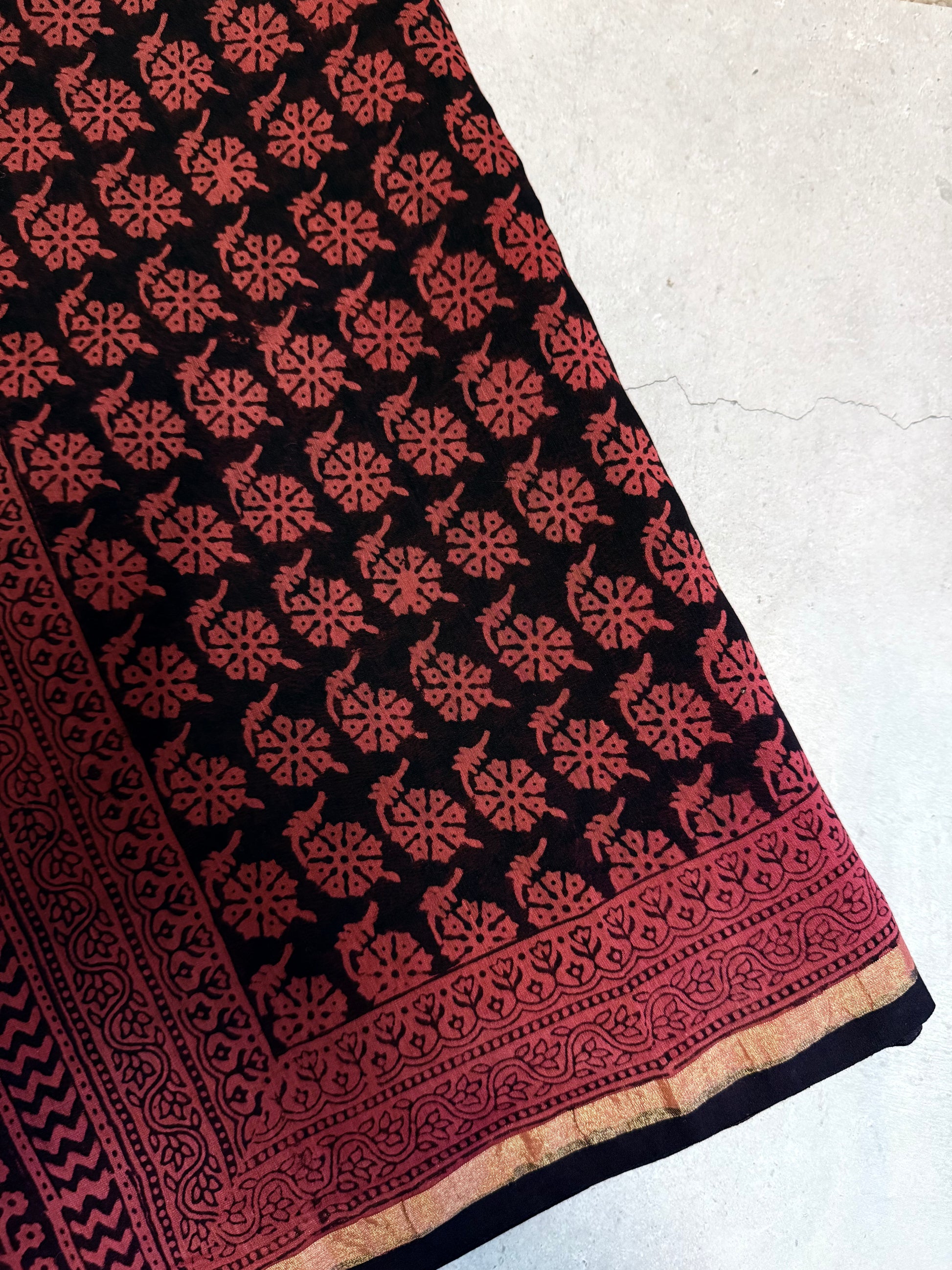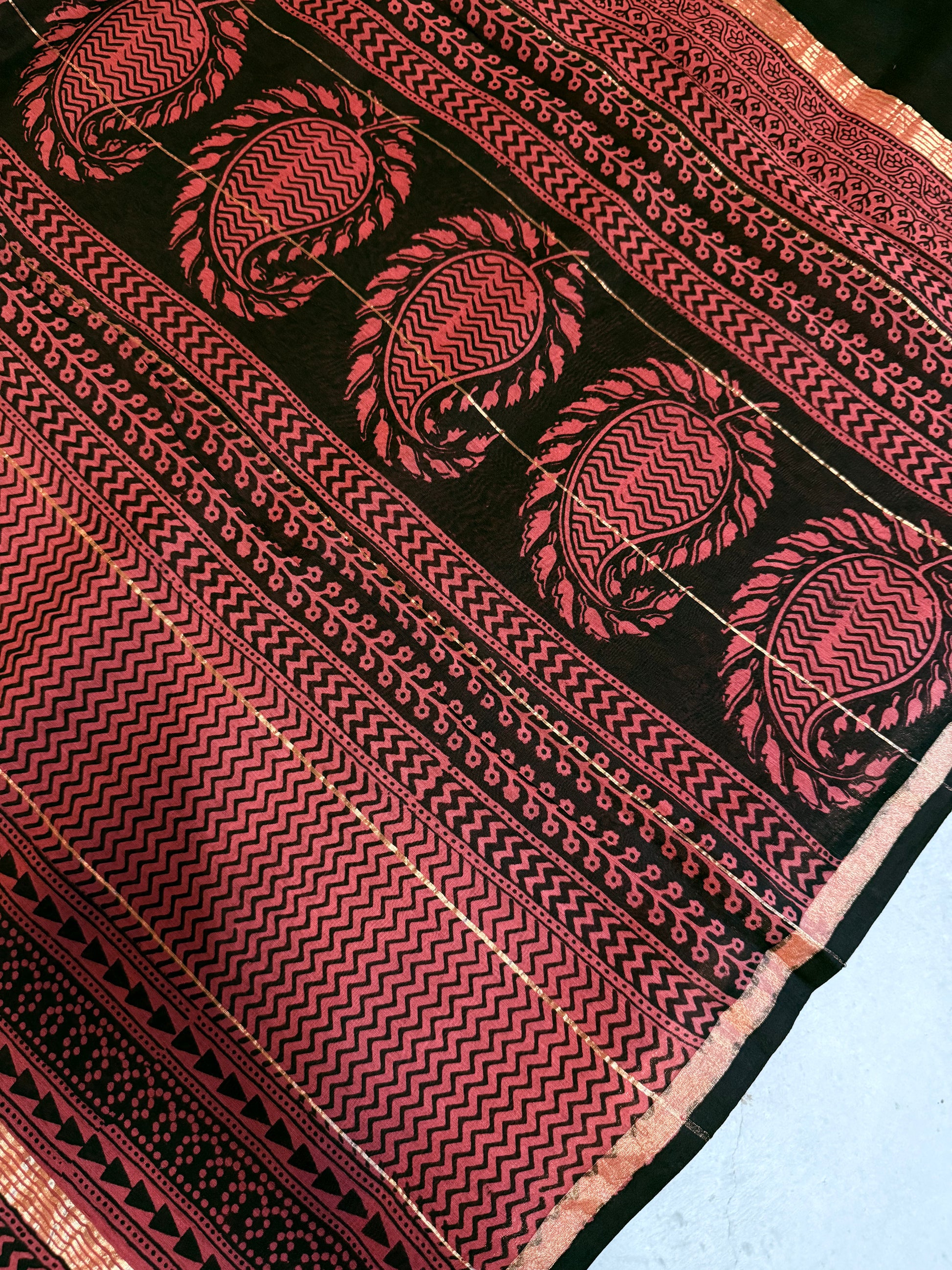 Vaanaja | Brick Red and Black Bhag Printed Chanderi Saree