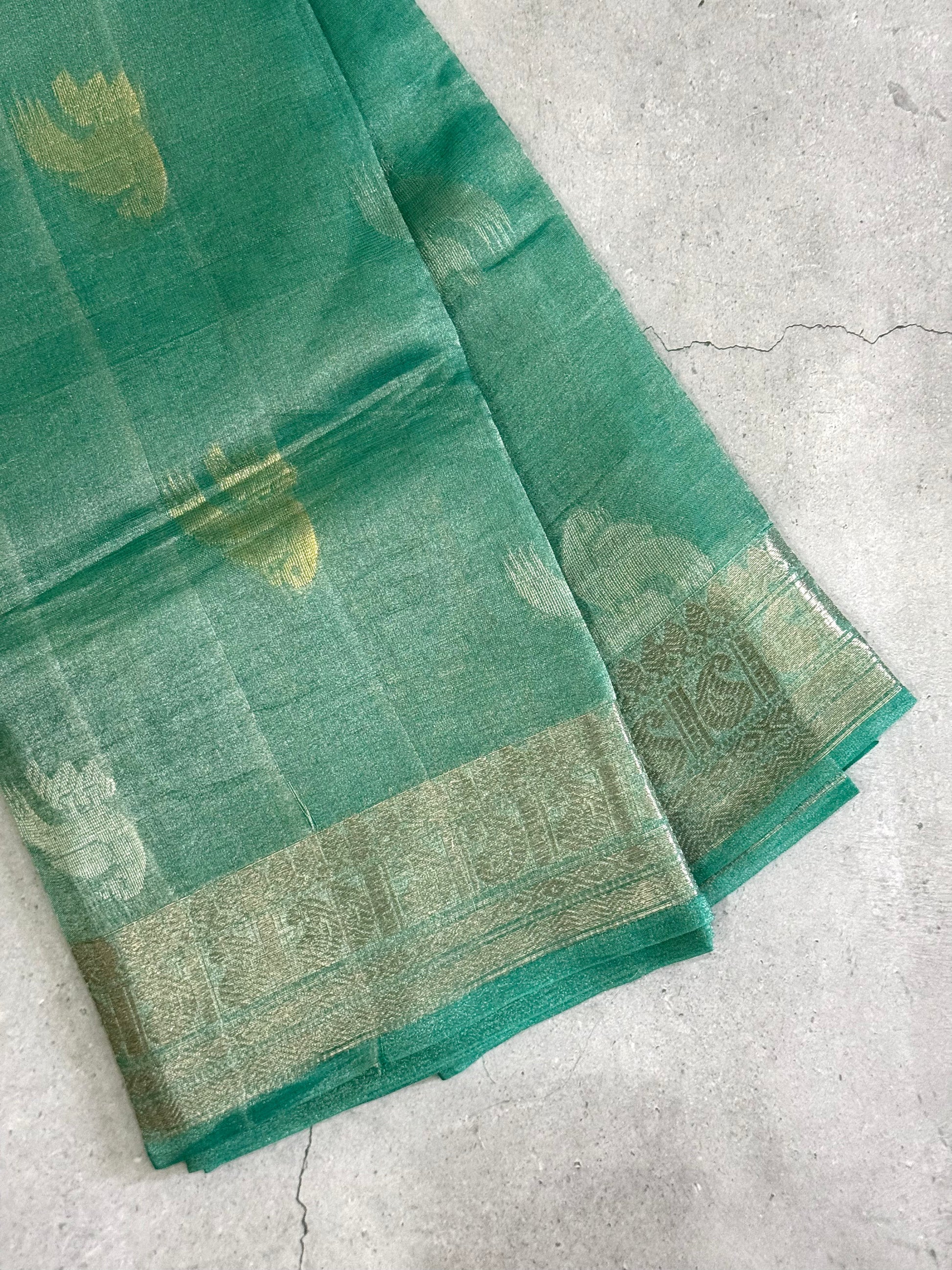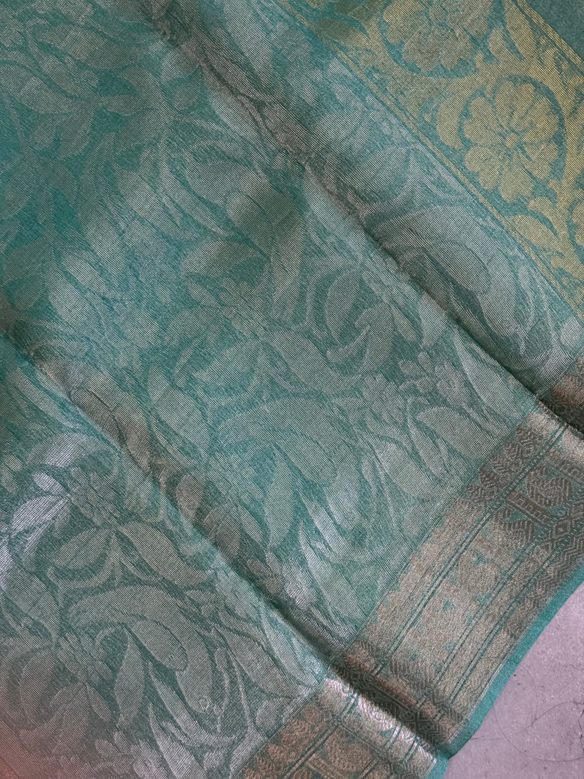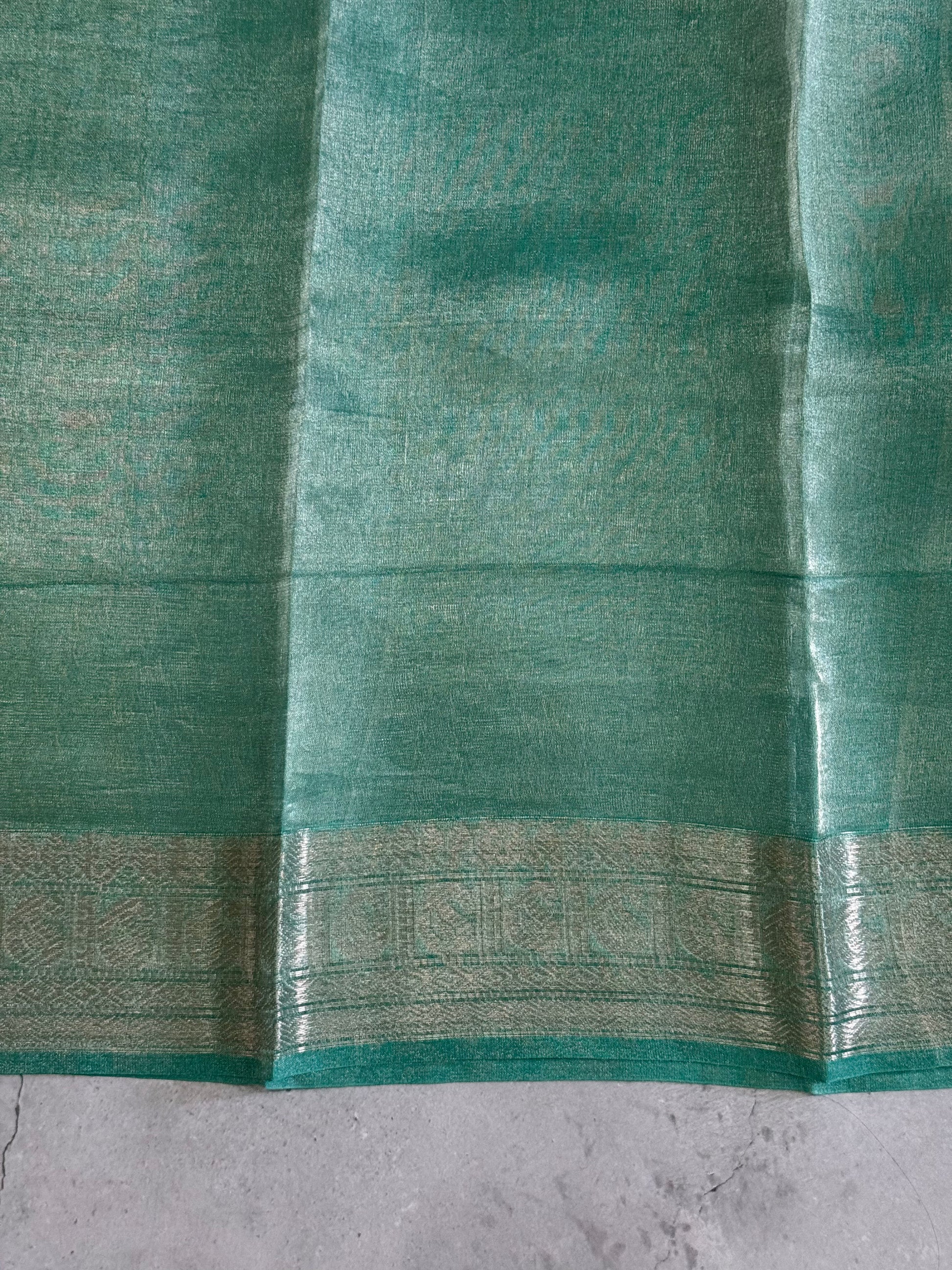 A Glass Tissue Silk saree is a breathtaking blend of elegance and opulence, crafted from fine silk with a delicate, lustrous finish that mimics the sheen of glass. The fabric’s unique texture, light as air yet rich in appearance, features a subtle metallic shimmer, giving it a glamorous and refined look. Often adorned with intricate zari work or traditional motifs, these sarees exude sophistication and are perfect for grand occasions like weddings and festivals. With its graceful drape and luxurious sheen, a Glass Tissue Silk saree is a statement of timeless beauty and exquisite craftsmanship.