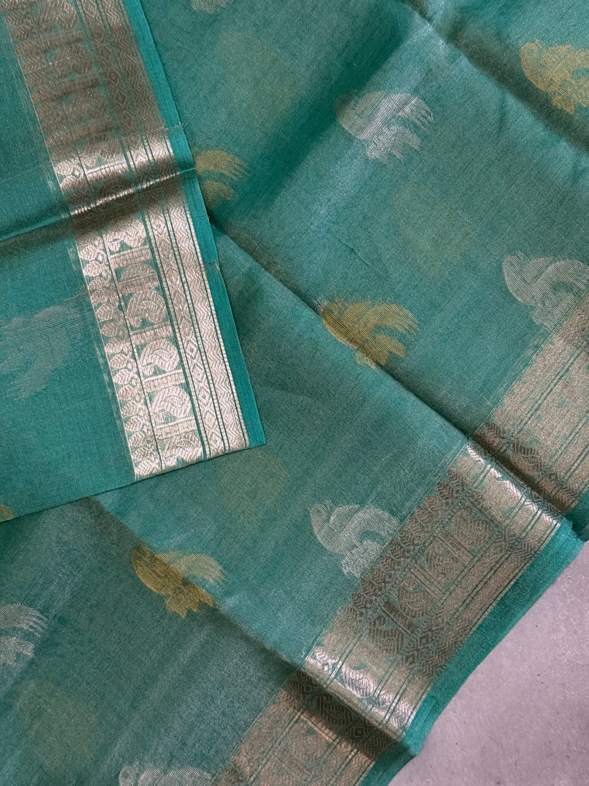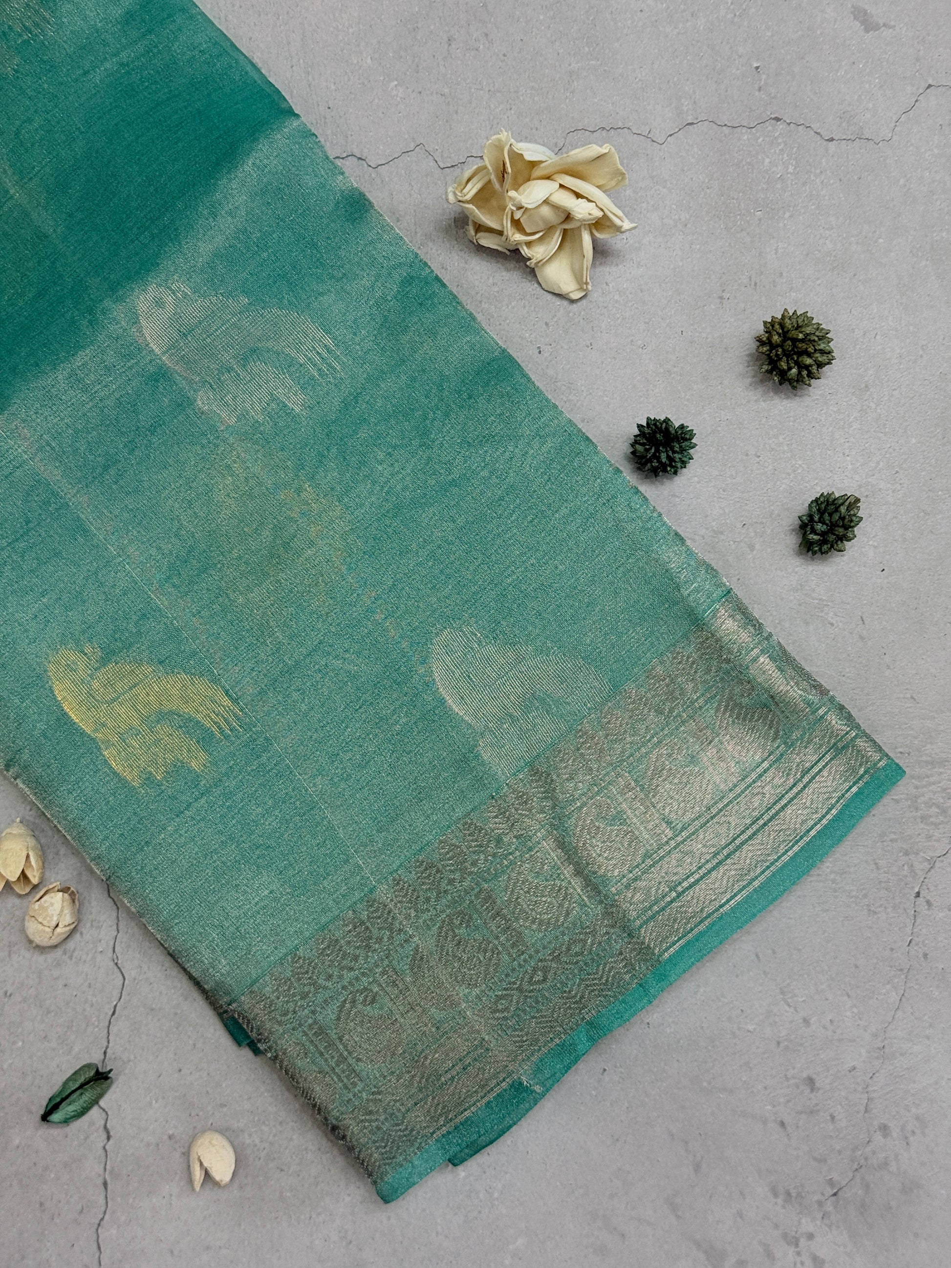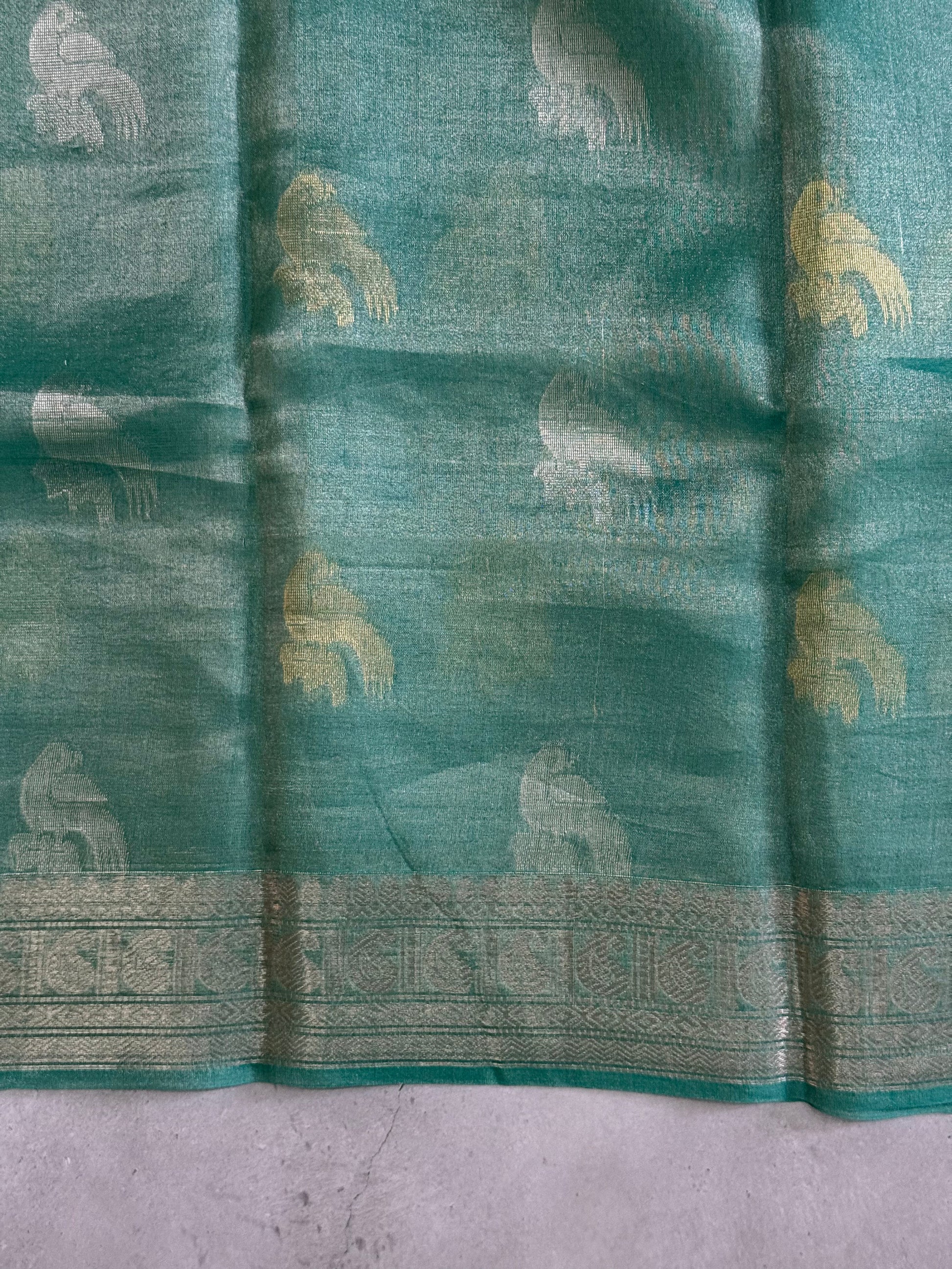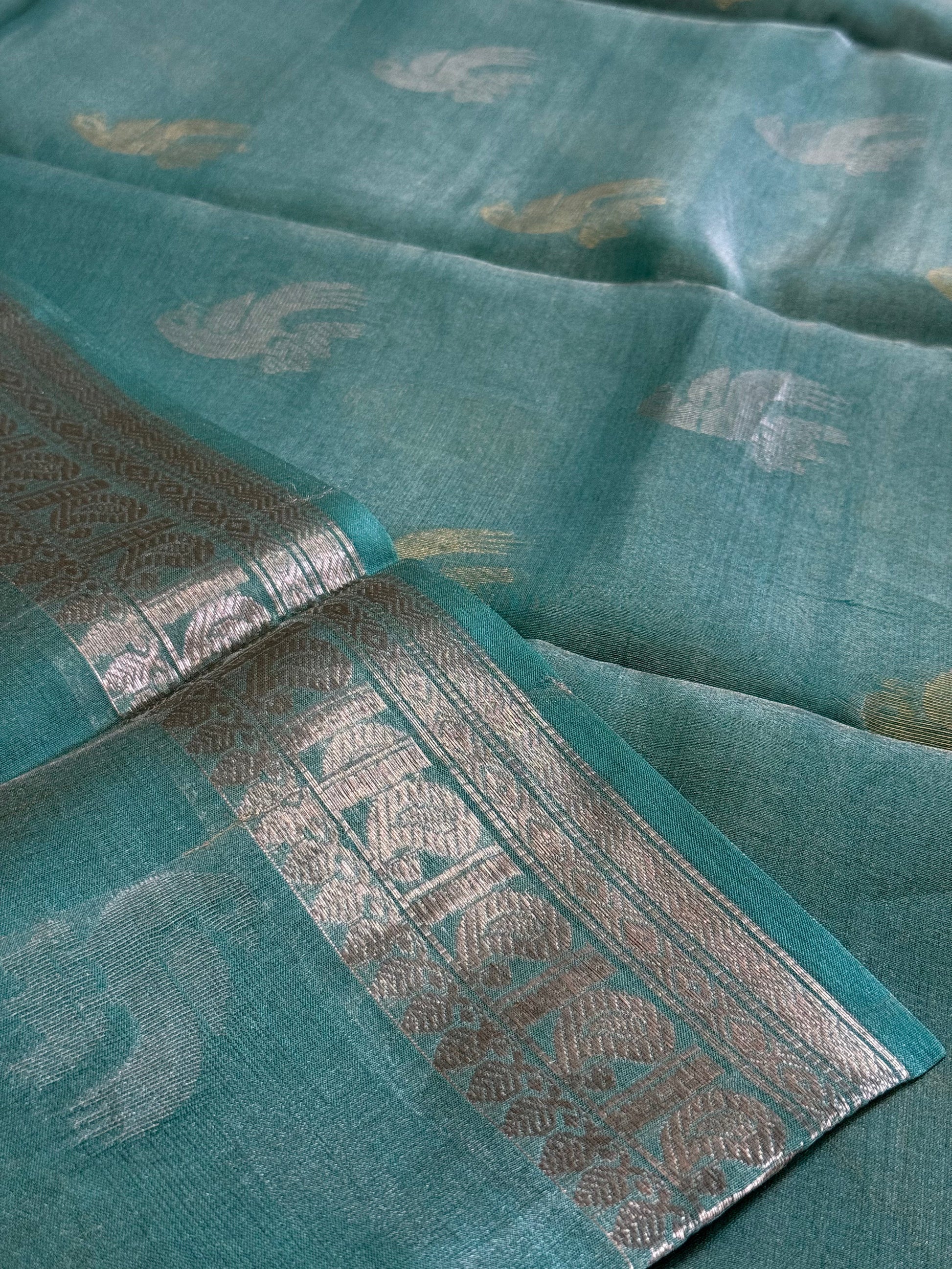 A Glass Tissue Silk saree is a breathtaking blend of elegance and opulence, crafted from fine silk with a delicate, lustrous finish that mimics the sheen of glass. The fabric’s unique texture, light as air yet rich in appearance, features a subtle metallic shimmer, giving it a glamorous and refined look. Often adorned with intricate zari work or traditional motifs, these sarees exude sophistication and are perfect for grand occasions like weddings and festivals. With its graceful drape and luxurious sheen, a Glass Tissue Silk saree is a statement of timeless beauty and exquisite craftsmanship.