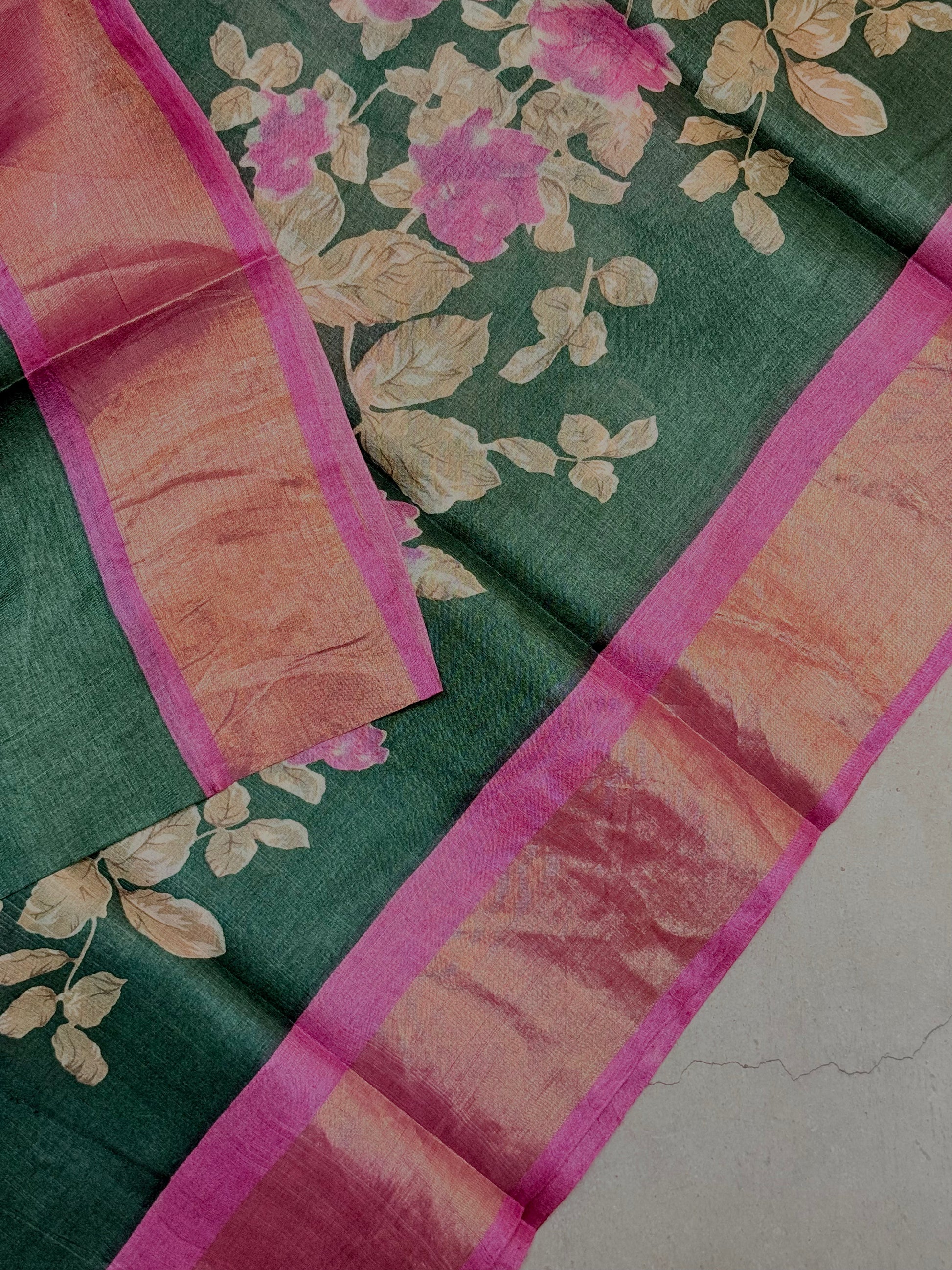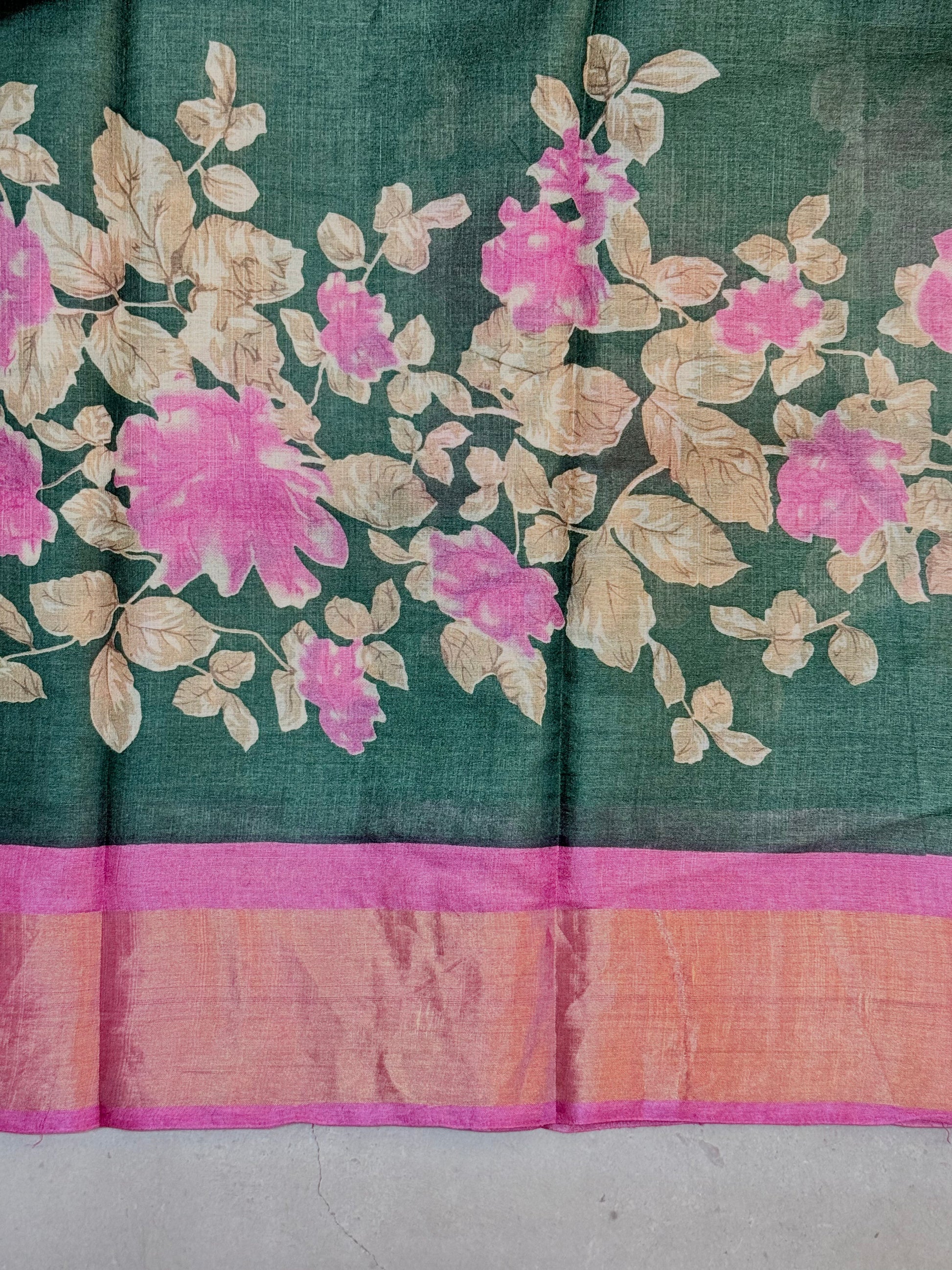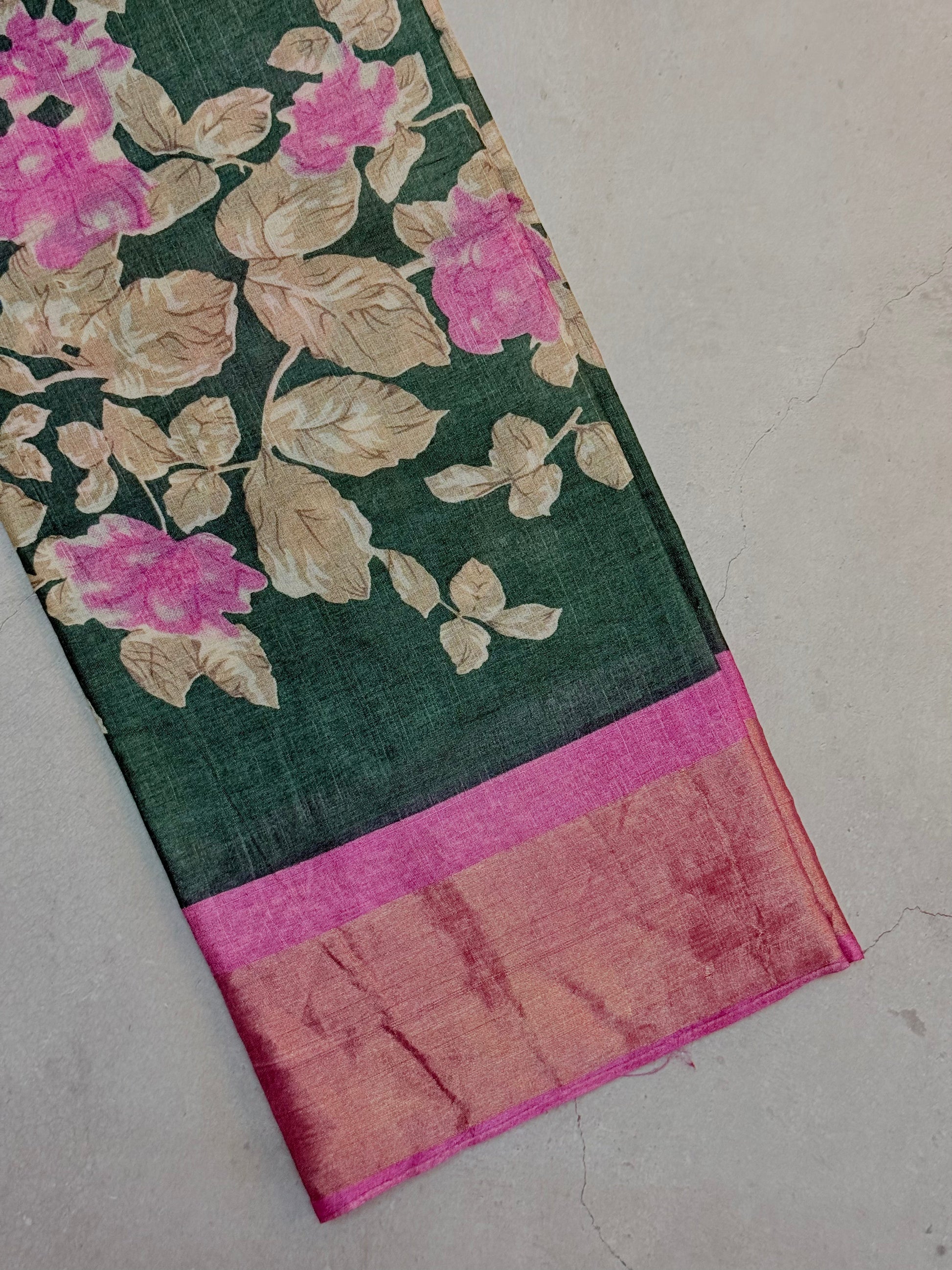 Yuktha | Green and Pink Floral Printed Tussar Silk Saree
